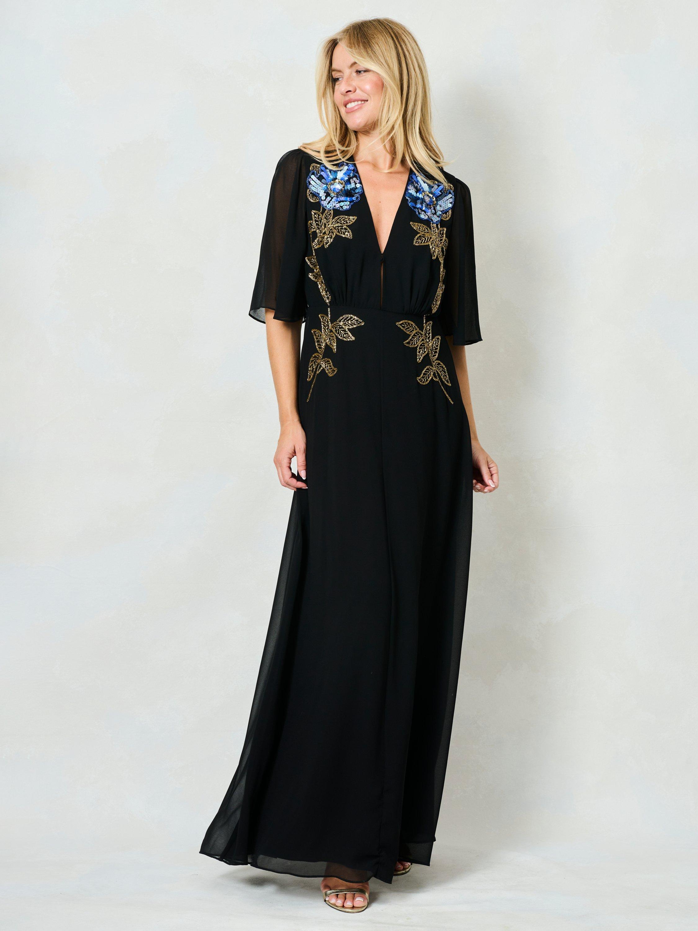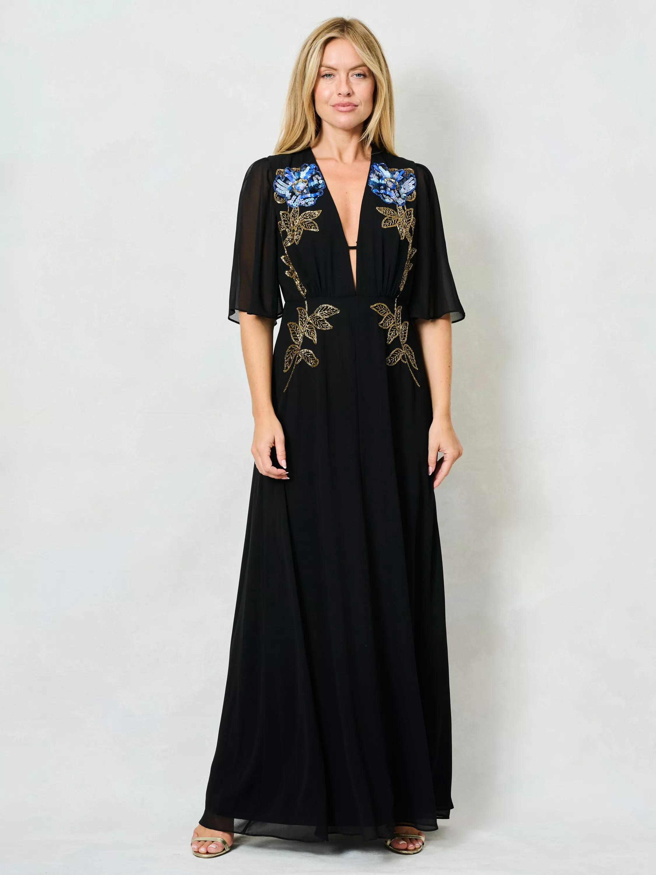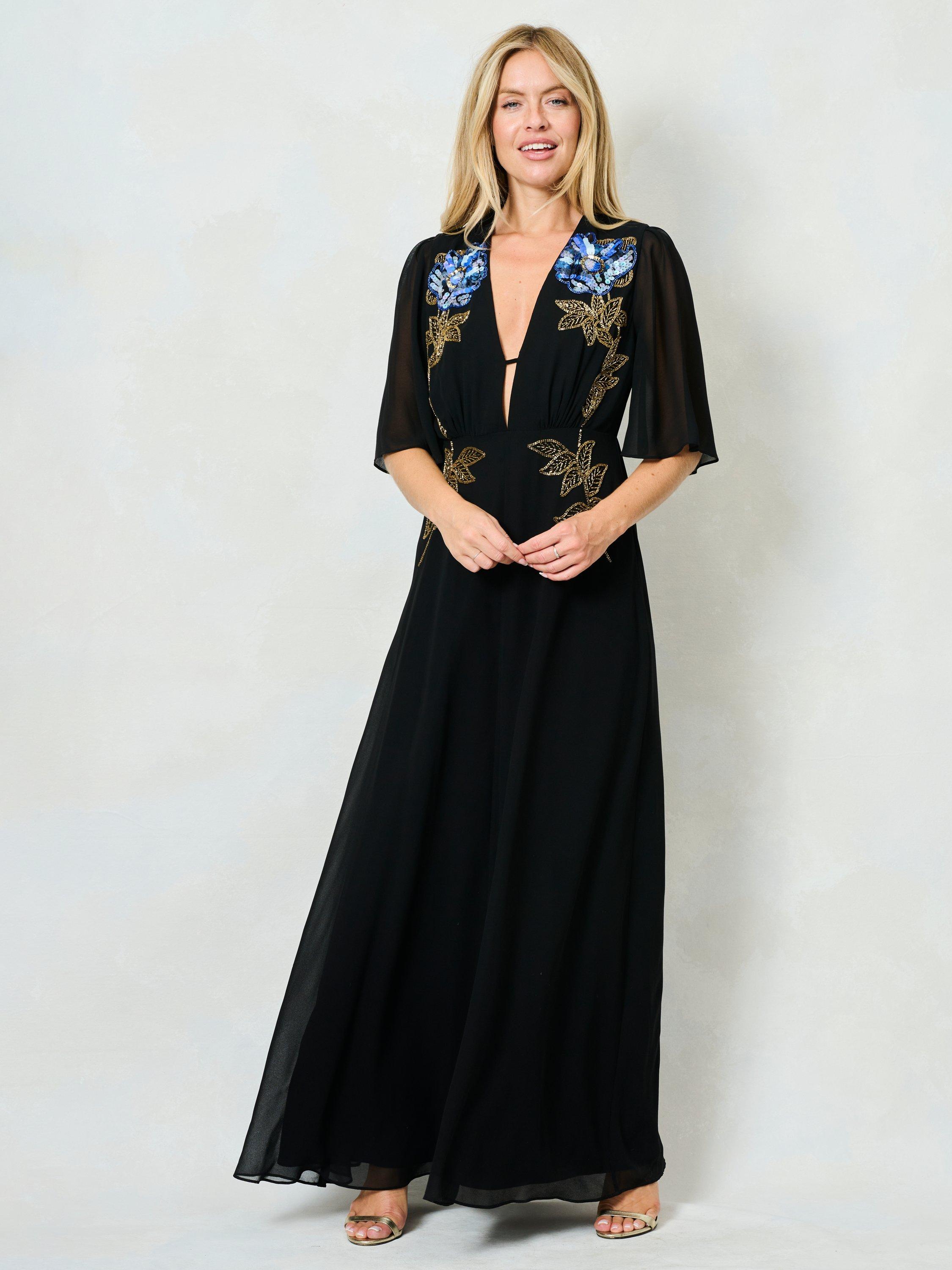 The Clover showcases Hope & Ivy embellishment and design at its very best, with beautiful, sparkling florals decorating the bust and bodice of this dreamy evening gown. Flutter sleeves and a plunging neckline create a beautiful silhouette, while the cascading skirt finishes at sweeping floor length, and the hidden hook and eye detail on the neckline allows for the plunge to be adjusted as desired. This is the perfect party piece for making an entrance at any event this season.