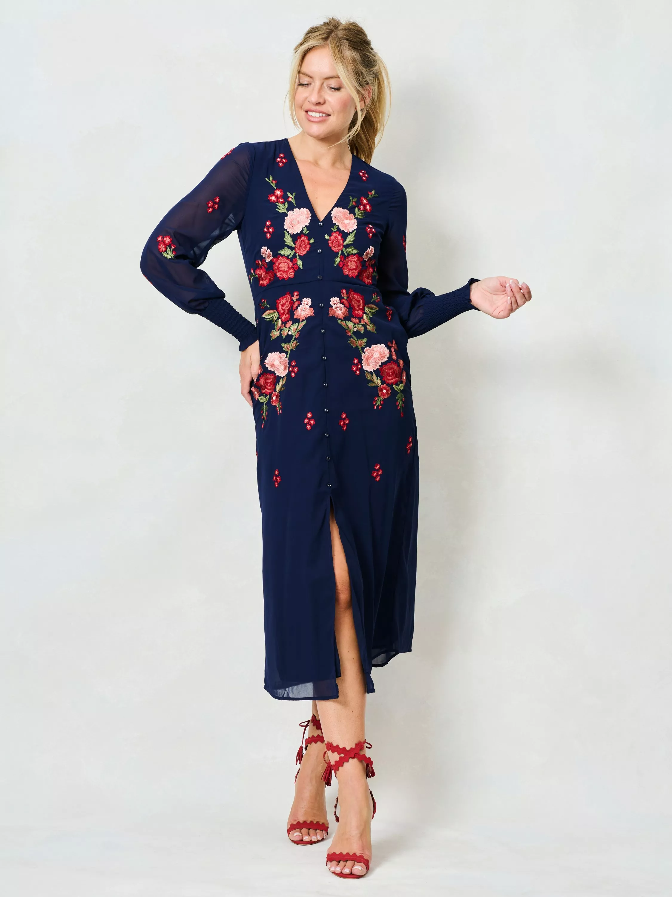 Ready to help you stand out from the crowd, The Jodie is a sublime new midi style, complete with a decorative button front, full length, elasticated blouson sleeves, and the most breathtaking, intricately embroidered mirror design across the torso and sleeves.