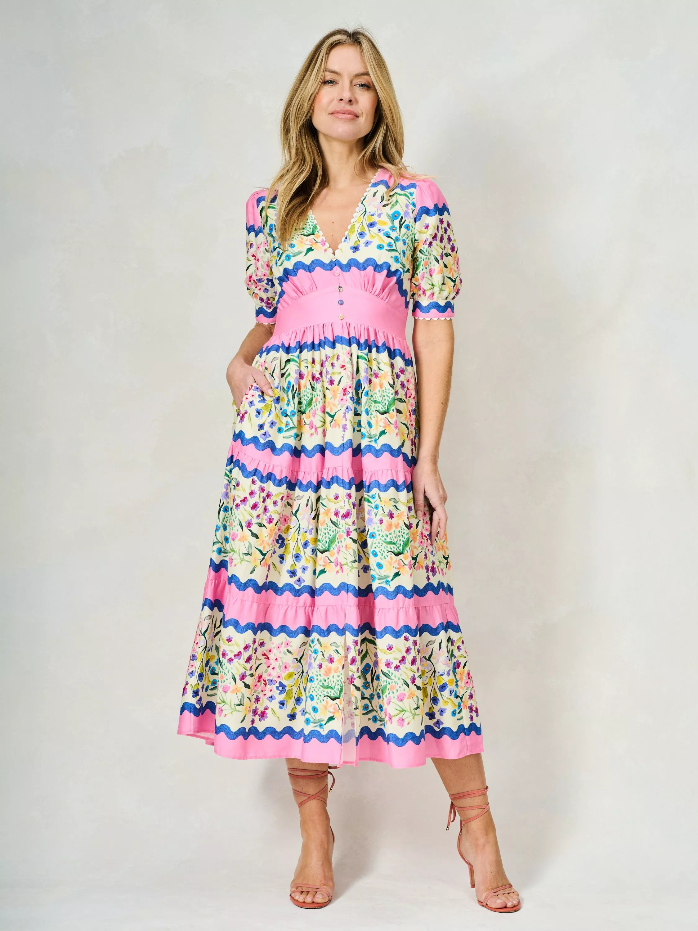 A feminine, full-skirted tea dress is perfect for picnics, garden parties and all sorts of seasonal soirées. In striped sateen with a colourful floral print, The Meredith is cut to a flattering V-neck with puff sleeves and a banded skirt. We love the little details, including the rickrack trim, decorative front buttons, and flexible smocked back.