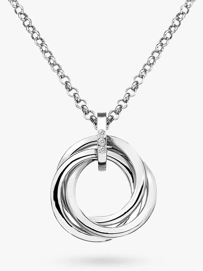 Rose and yellow gold highlights attune perfectly with sterling silver in this beatiful Trio Necklace from Hot Diamonds. This Trio necklace features a blend of precious metal interlocking hoops that are gathered with a silver band, adorned with three one point diamonds. Complete the look with coordinating earrings.