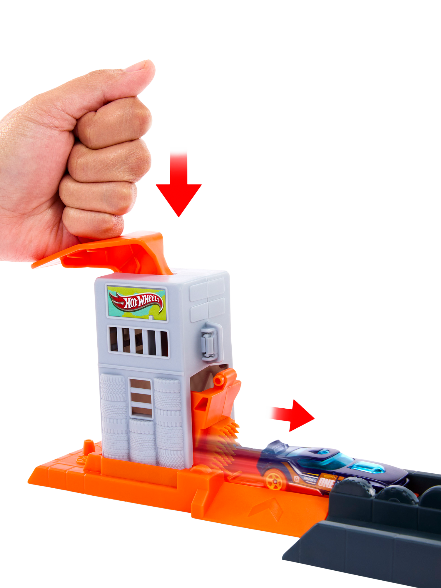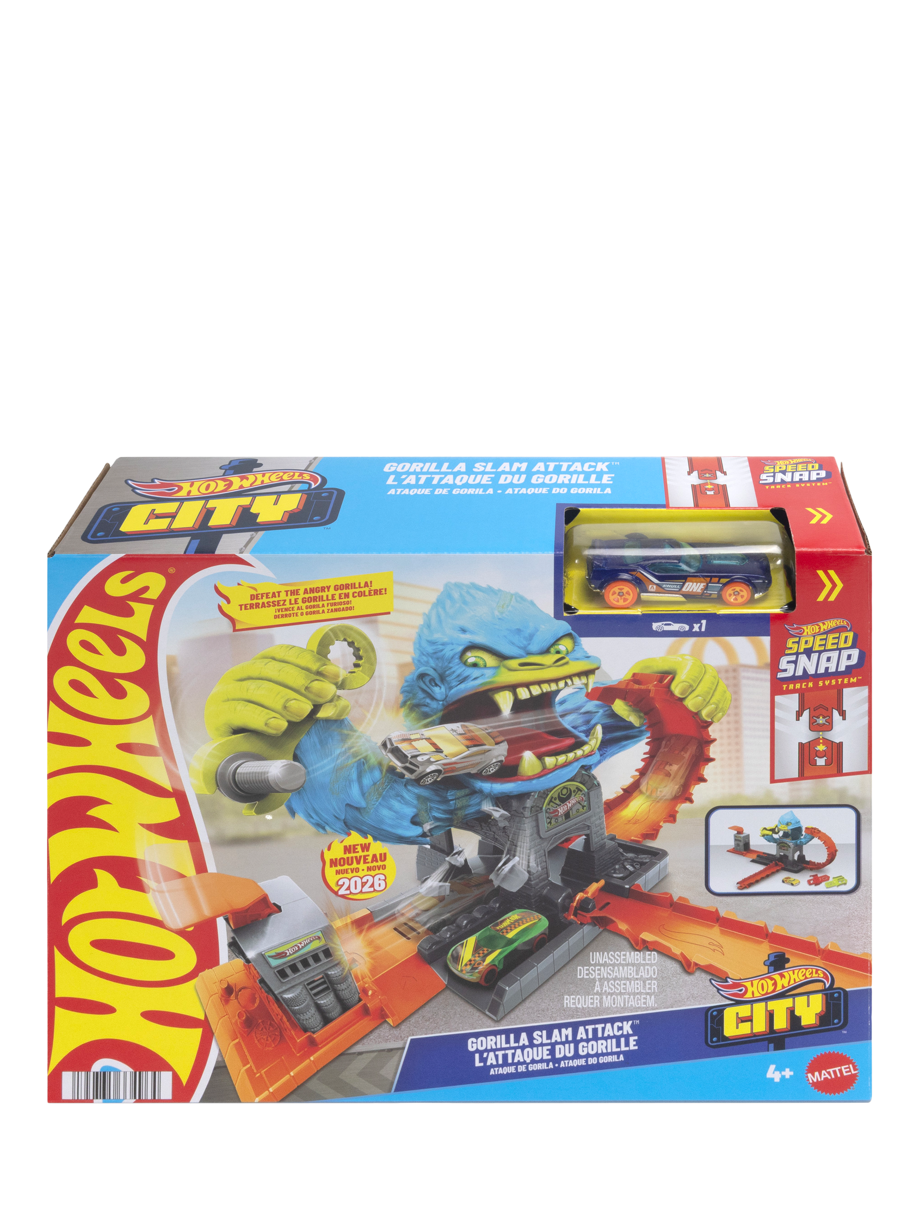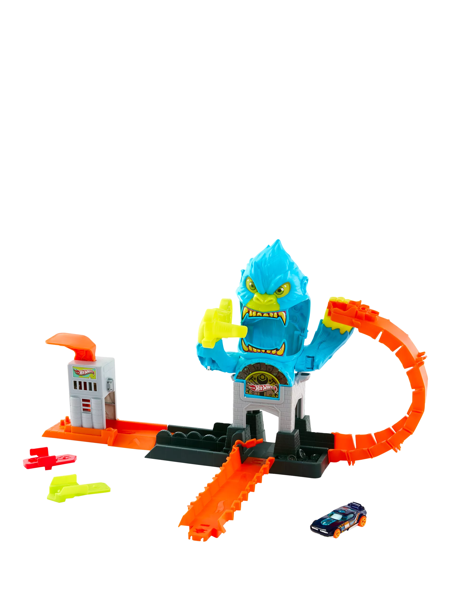 Take on a gorilla nemesis in the Hot Wheels City Gorilla Slam Attack Playset. Kids can choose one of three ways to play: slam-launch the included toy car into the garage for a quick tune-up before speeding off; straighten out the track to directly race off to other adventures; or take on the gorilla by creating a loop and launching just right to avoid landing in the nemesis's mouth. Hit the wrench sign to knock out the gorilla and make Hot Wheels City safe again.