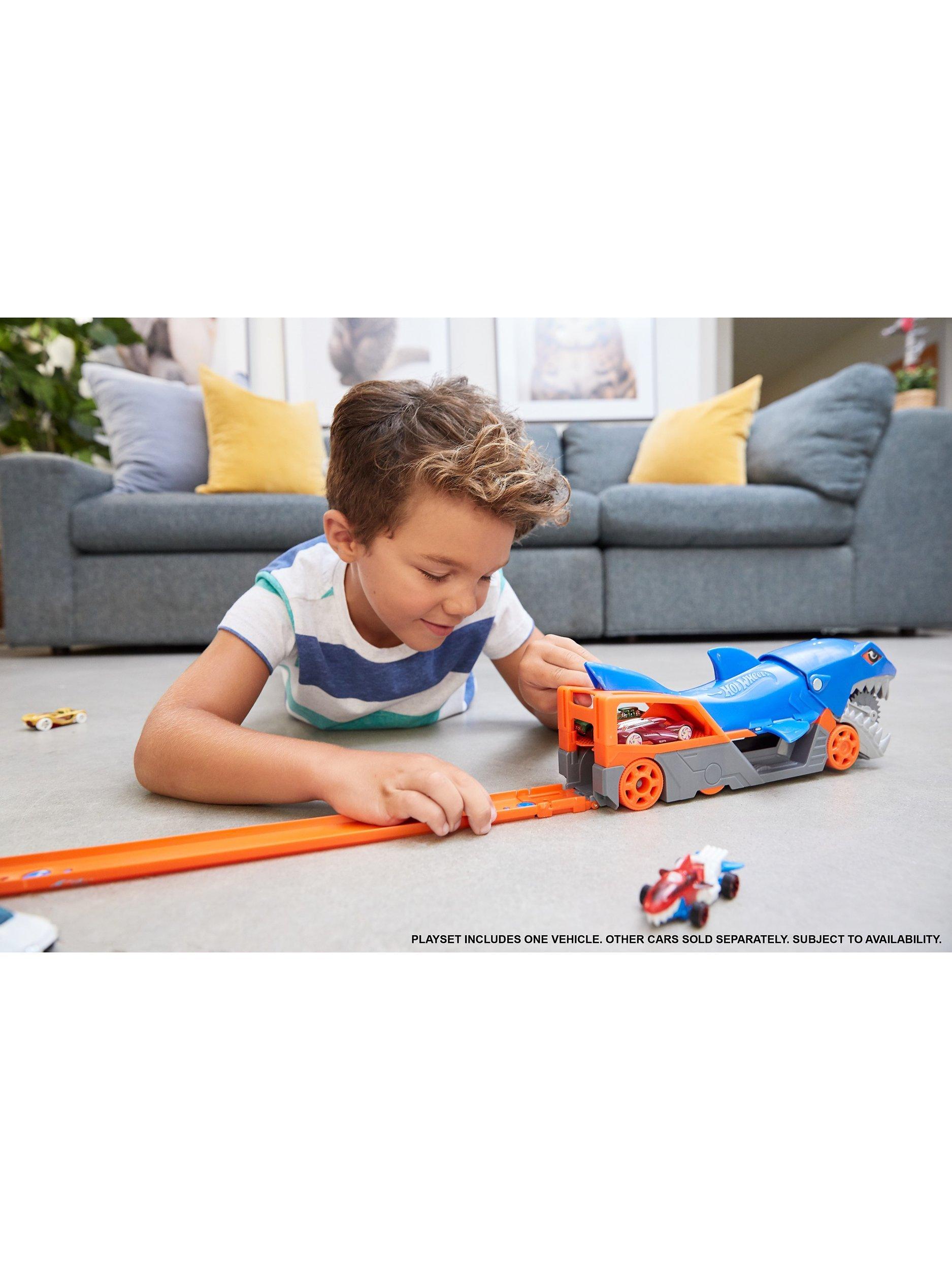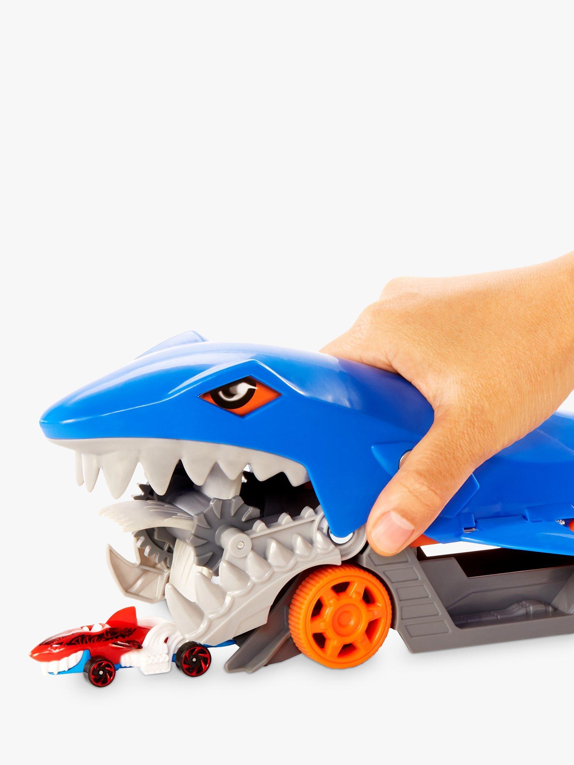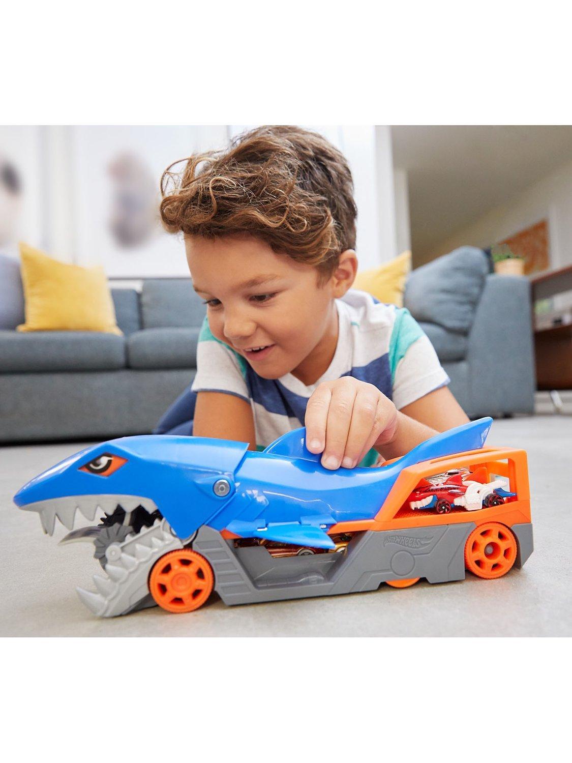 The Hot Wheels Shark Chomp Transport vehicle comes with one 1:64 scale Hot Wheels car and can hold up to four more (sold separately)! Kids four years old and up will love taking a bite out of clean-up!
