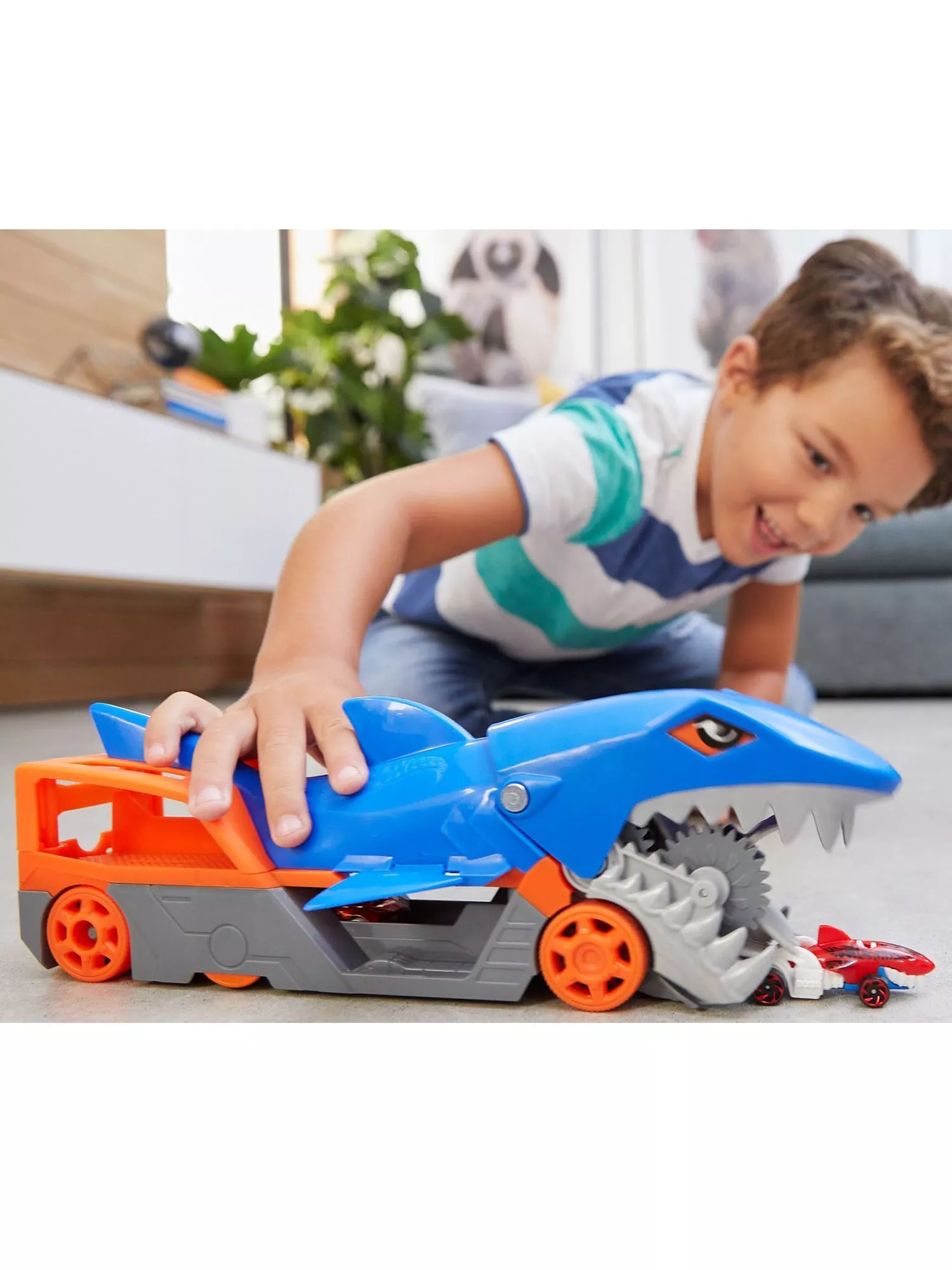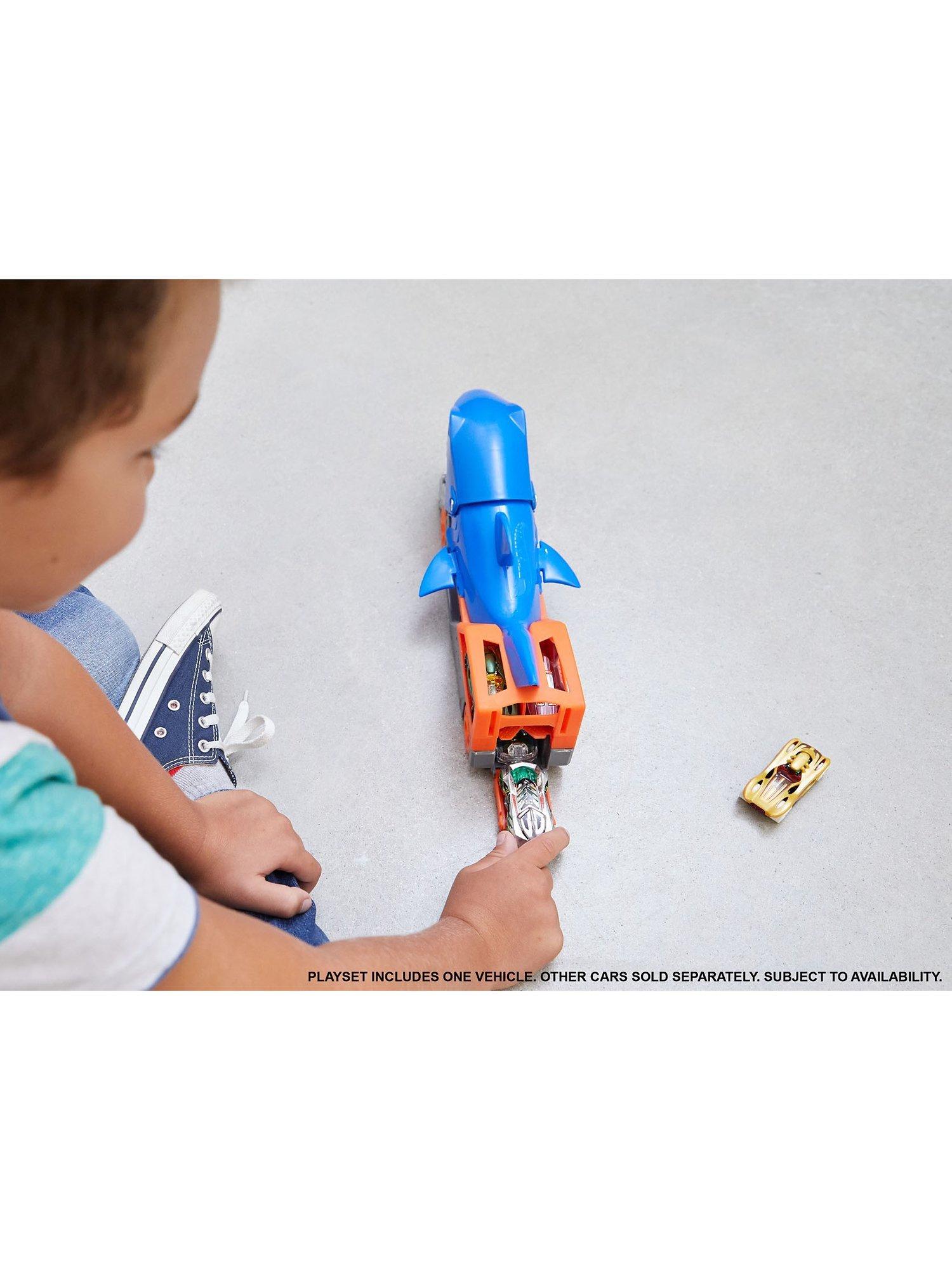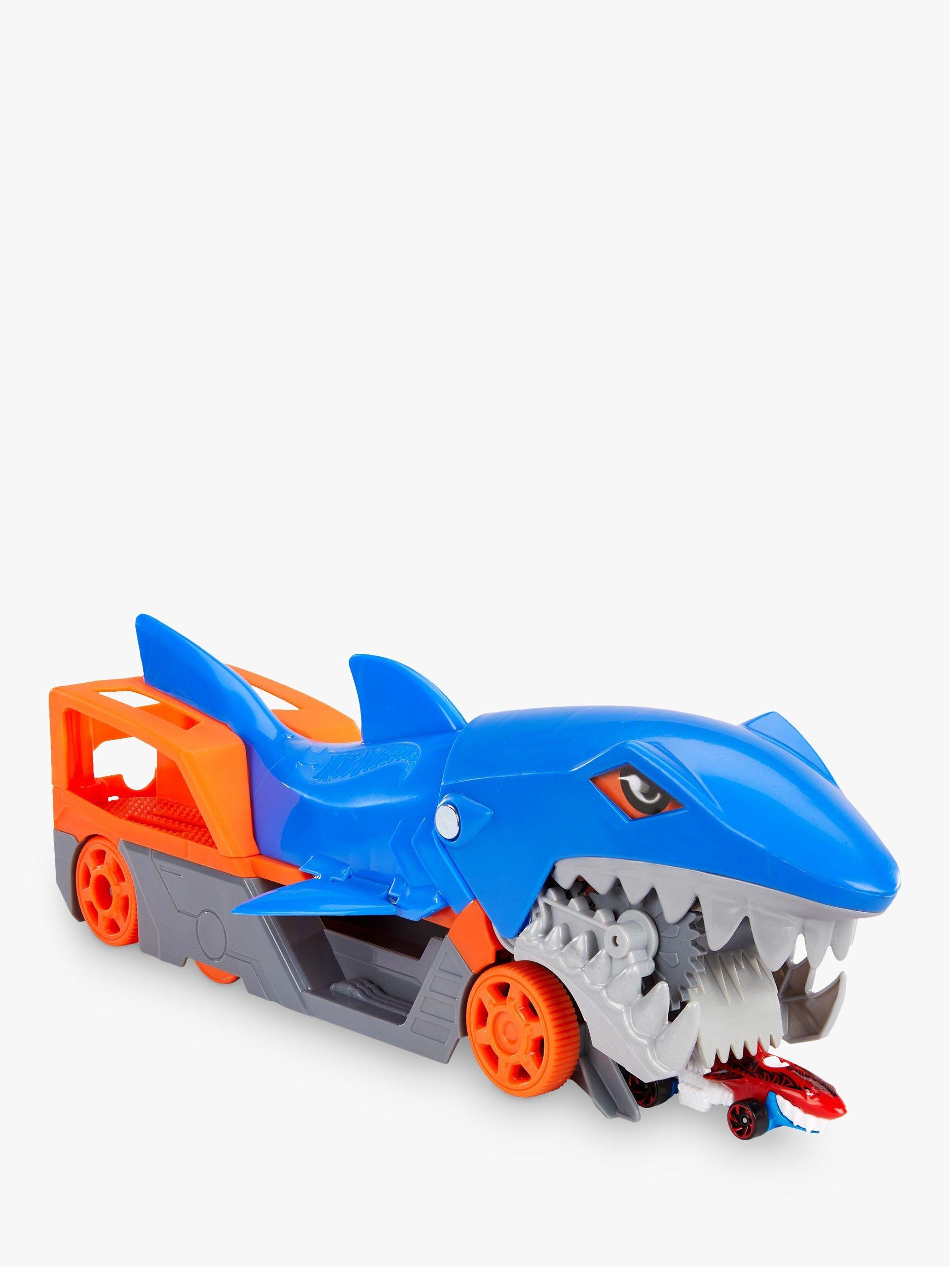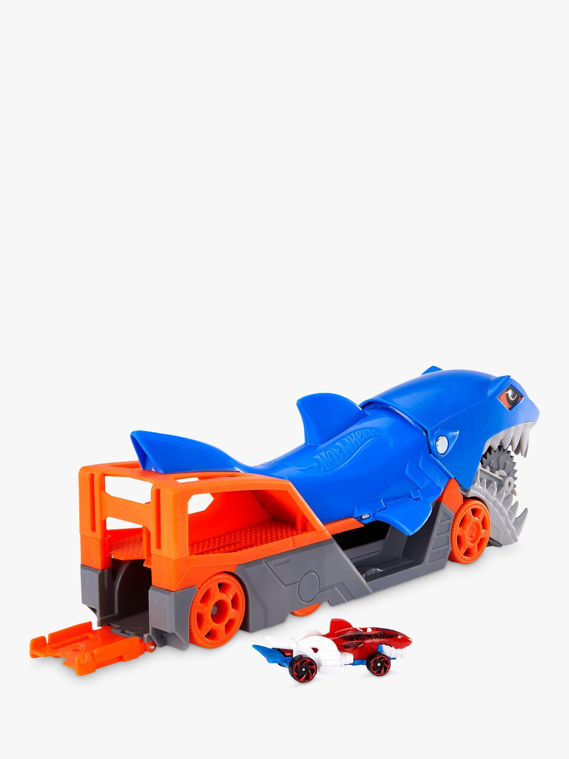 The Hot Wheels Shark Chomp Transport vehicle comes with one 1:64 scale Hot Wheels car and can hold up to four more (sold separately)! Kids four years old and up will love taking a bite out of clean-up!