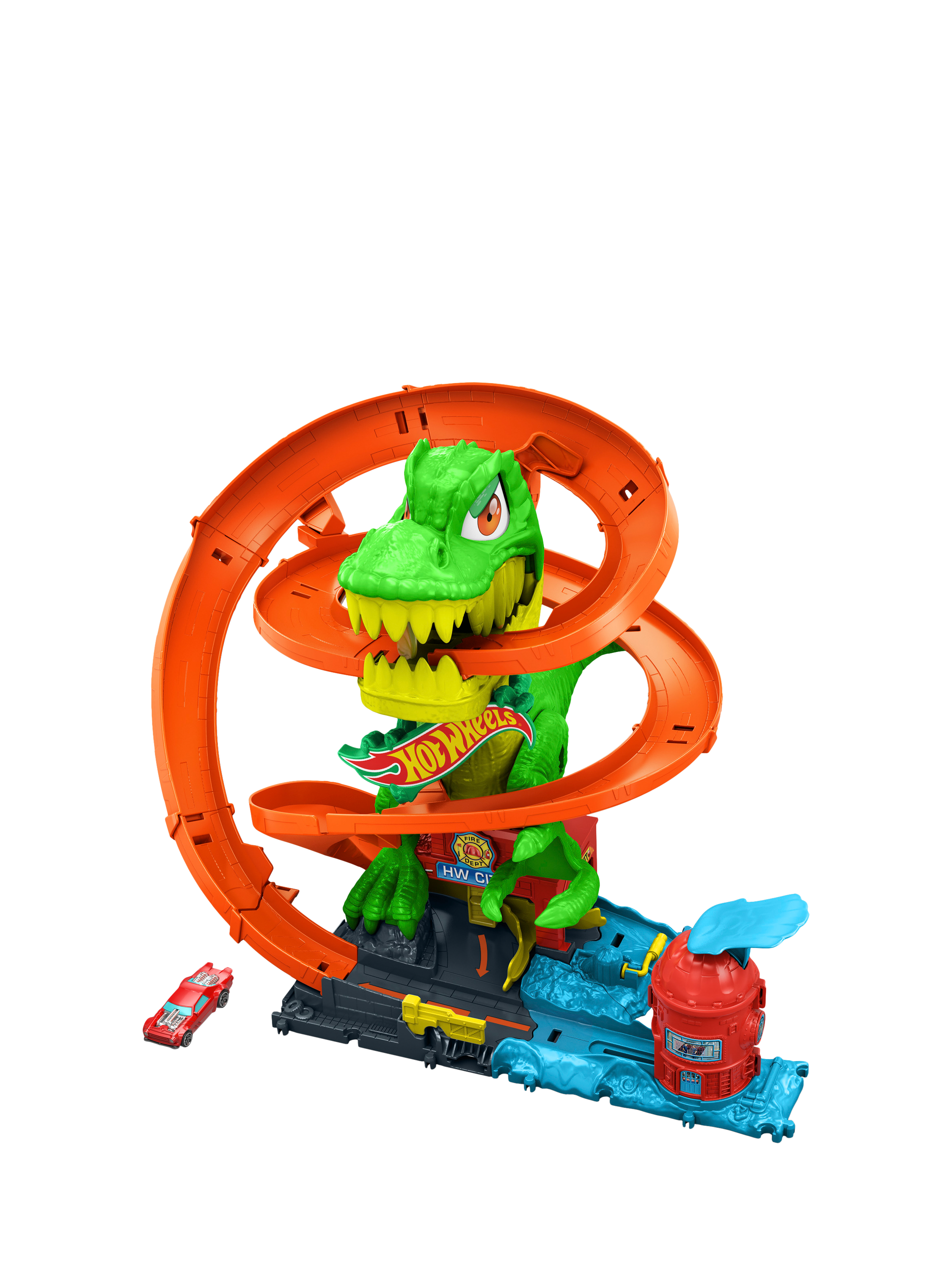 Kids launch the included 1:64 scale die-cast toy firetruck, and it zooms around the dino with three possible outcomes: get eaten and pooped out; hit a detour to refuel; or conquer the beast and save friends. Each time cars zoom past, the T-Rex's eyes spin and arms shake until it finally collapses! There's storage for additional cars and push-around play details for open-ended storytelling.
