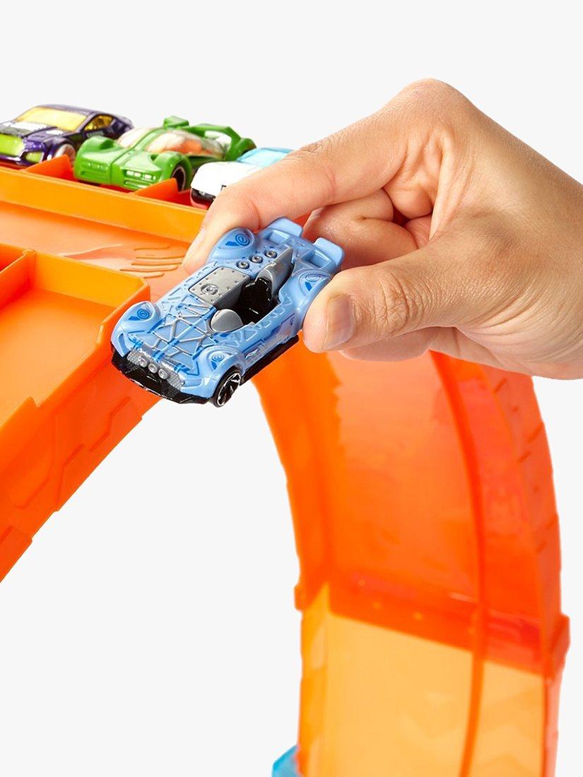 This epic track includes a huge 28-inch wide loop that's designed for multi-car play -- vehicles whip around the loop and avoid nail-biting near-misses with each other! Kids send the first car into action using the slam launcher, then add more and more cars until there's the inevitable crash. The challenge lies in how many cars can run at once -- it's a trick of timing and skill.