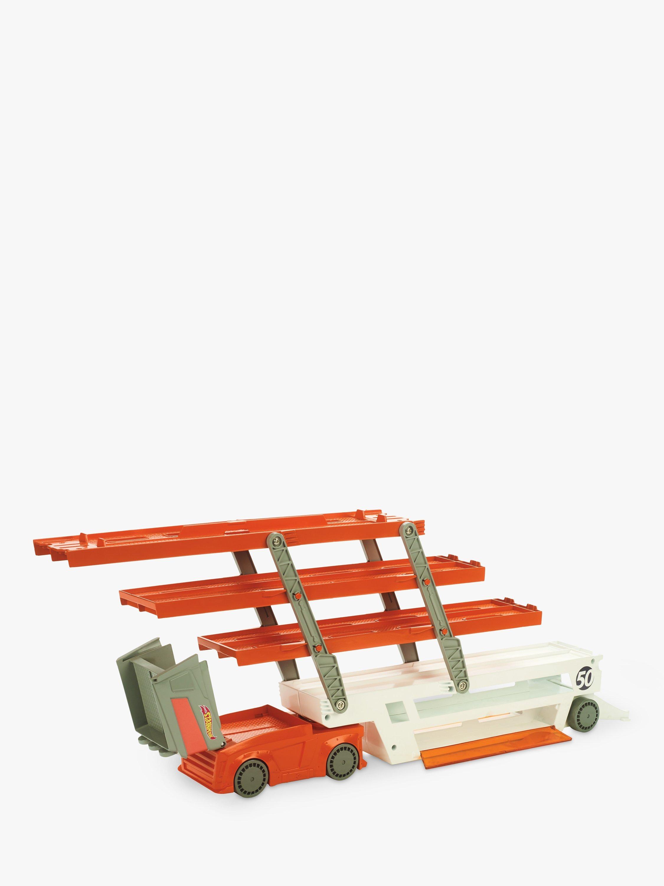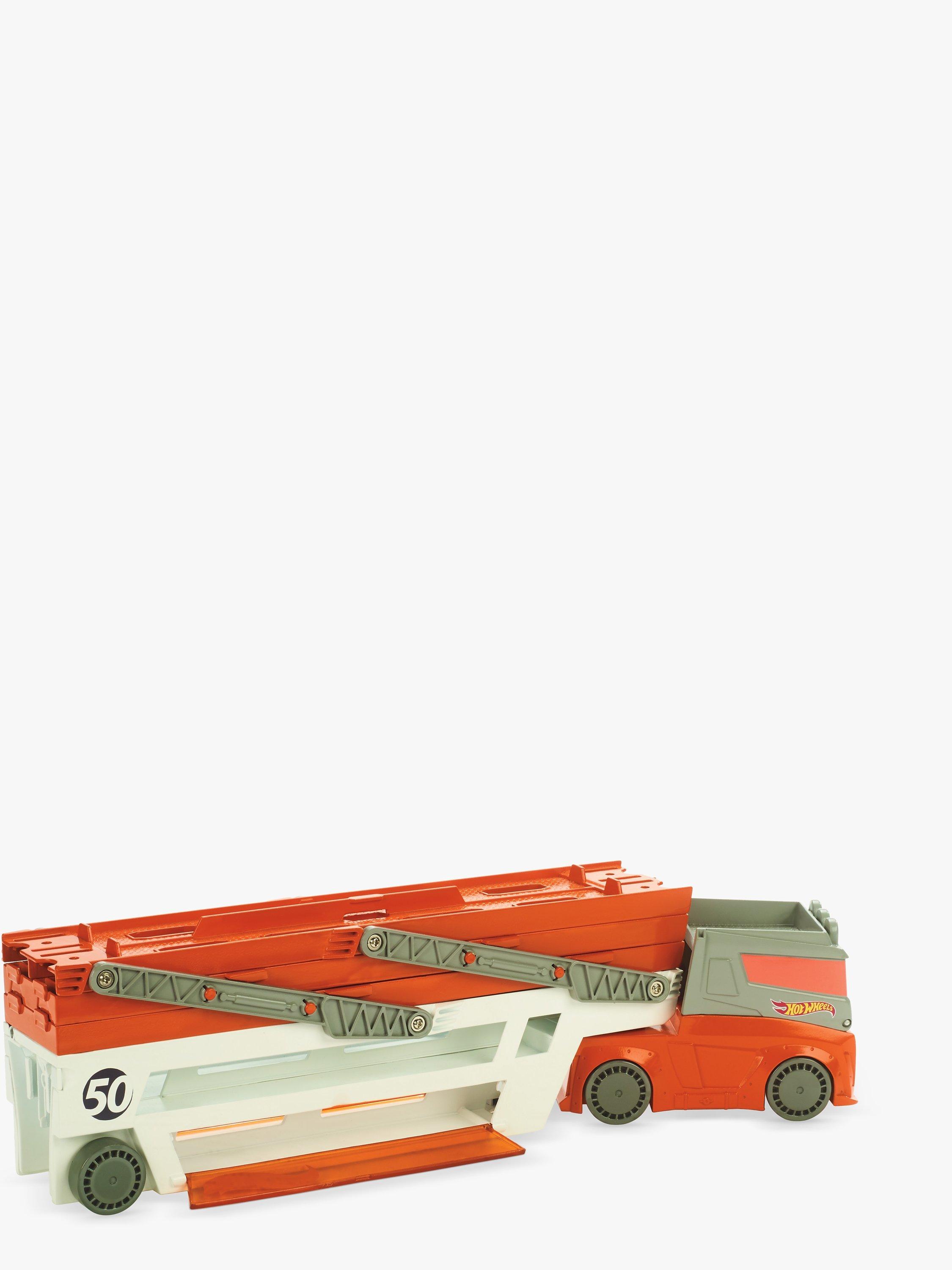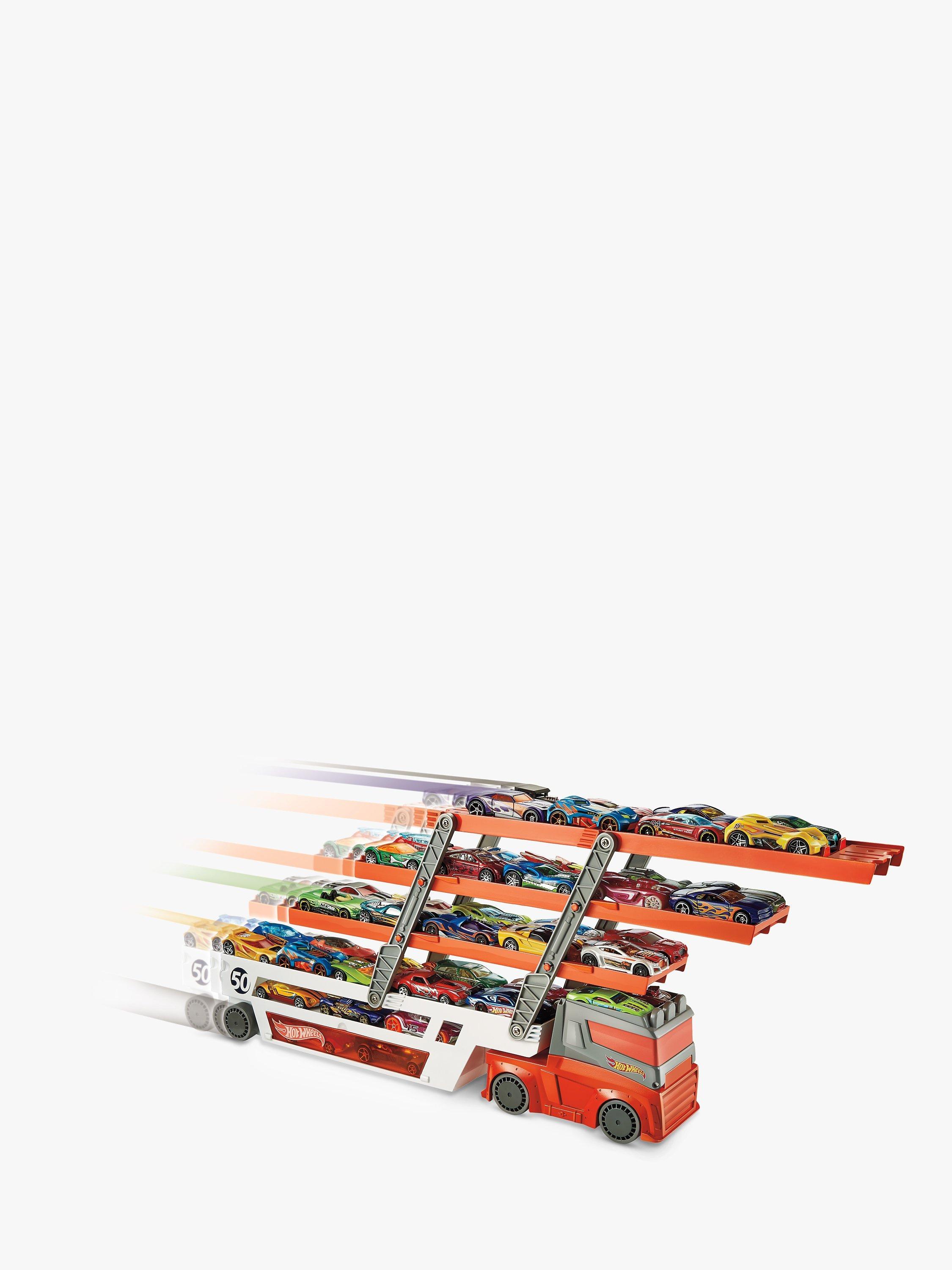 Load it up with up to 50 cars! Once the Hauler is full, pull down the ramp and connect it to any Hot Wheel City set!