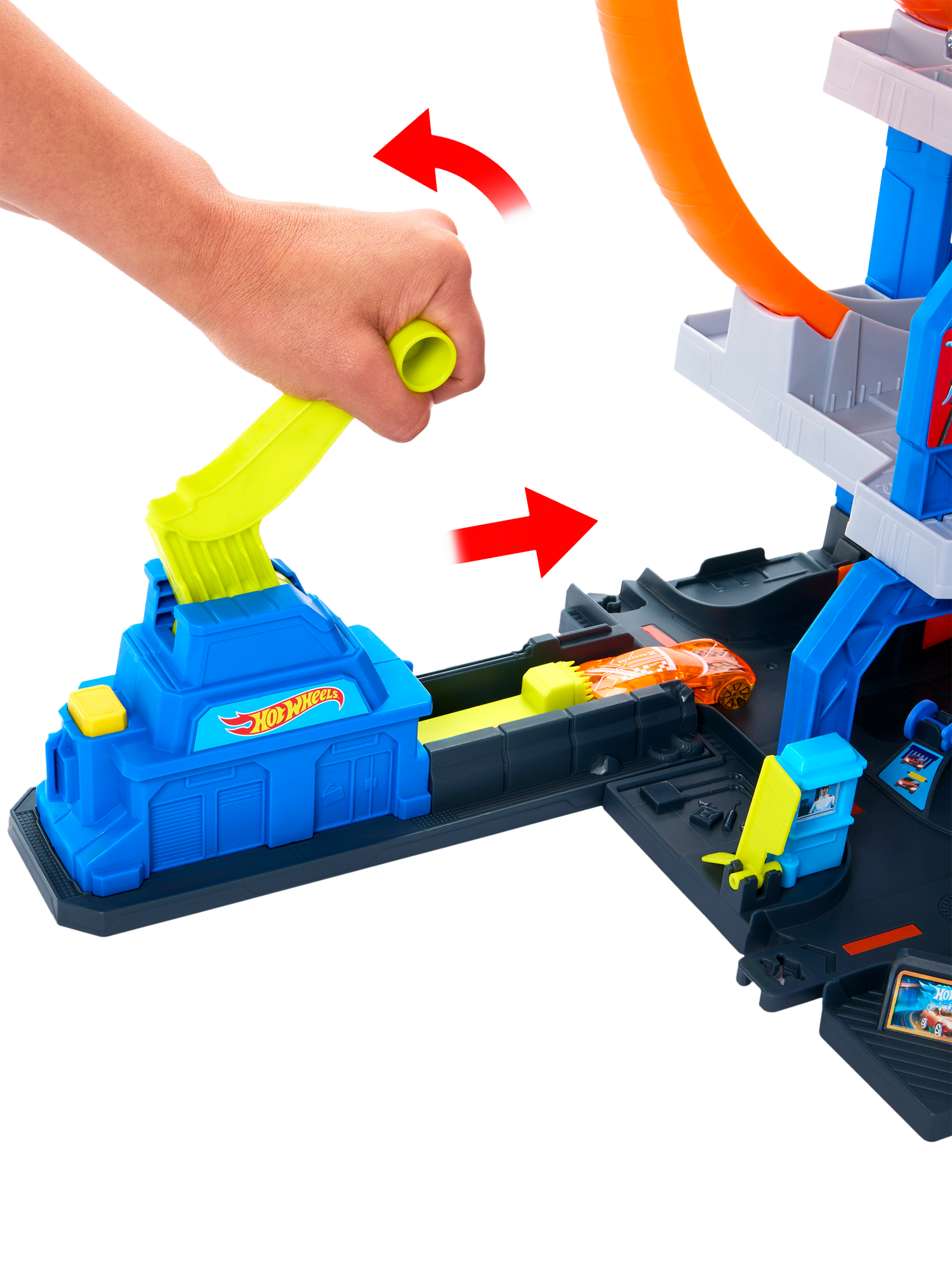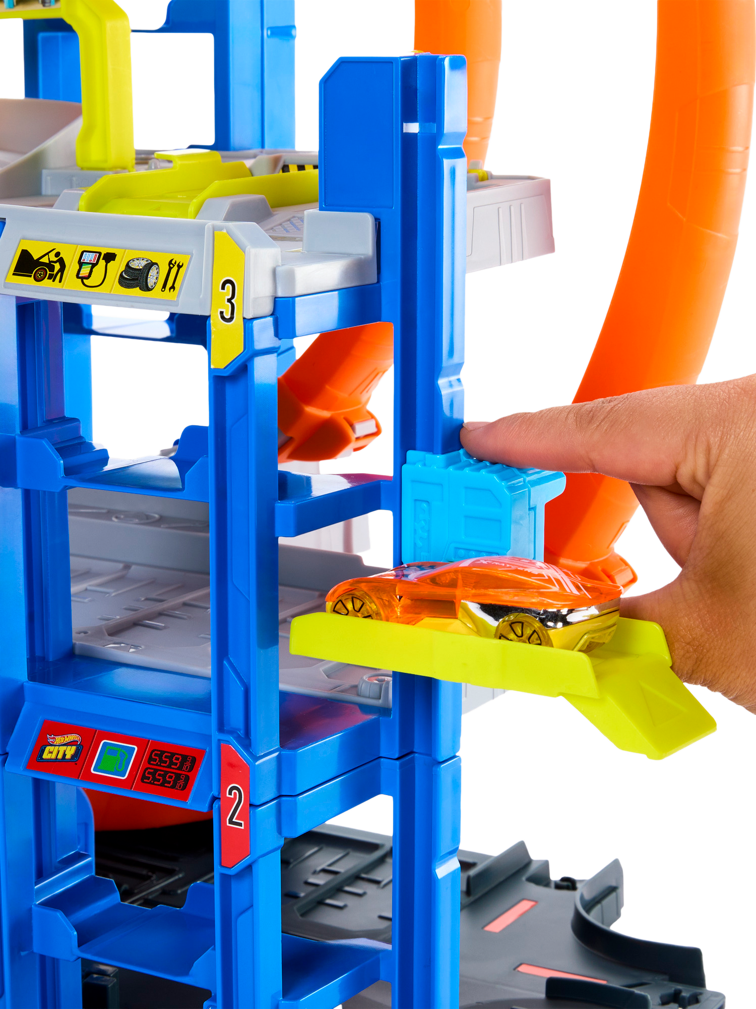 Use a kid-powered lift or use the car-carrying helicopter to transport vehicles to any level for parking. Extend the play using Speed Snap Track connectors.