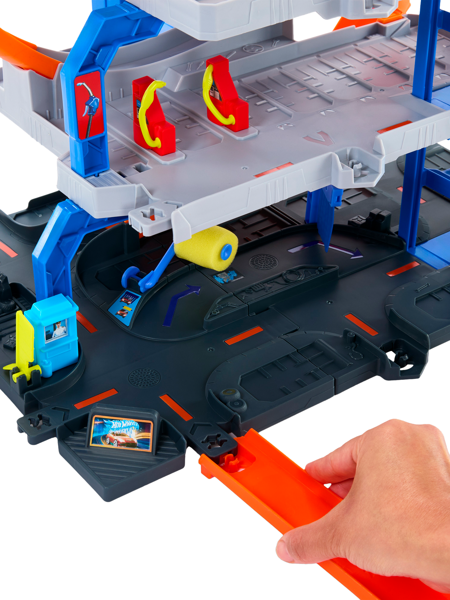 The Hot Wheels Mega Loop Garage playset has three levels of car-centred, push-around play to engage young racers in imaginative storytelling and epic stunts. On the base floor of this multi-level set, kids can drive their car through a car wash that features a moving foam roller and wash curtain. Then, load the car into the slam launcher and send it into the double loop where diverters help to guide it to the desired floor.