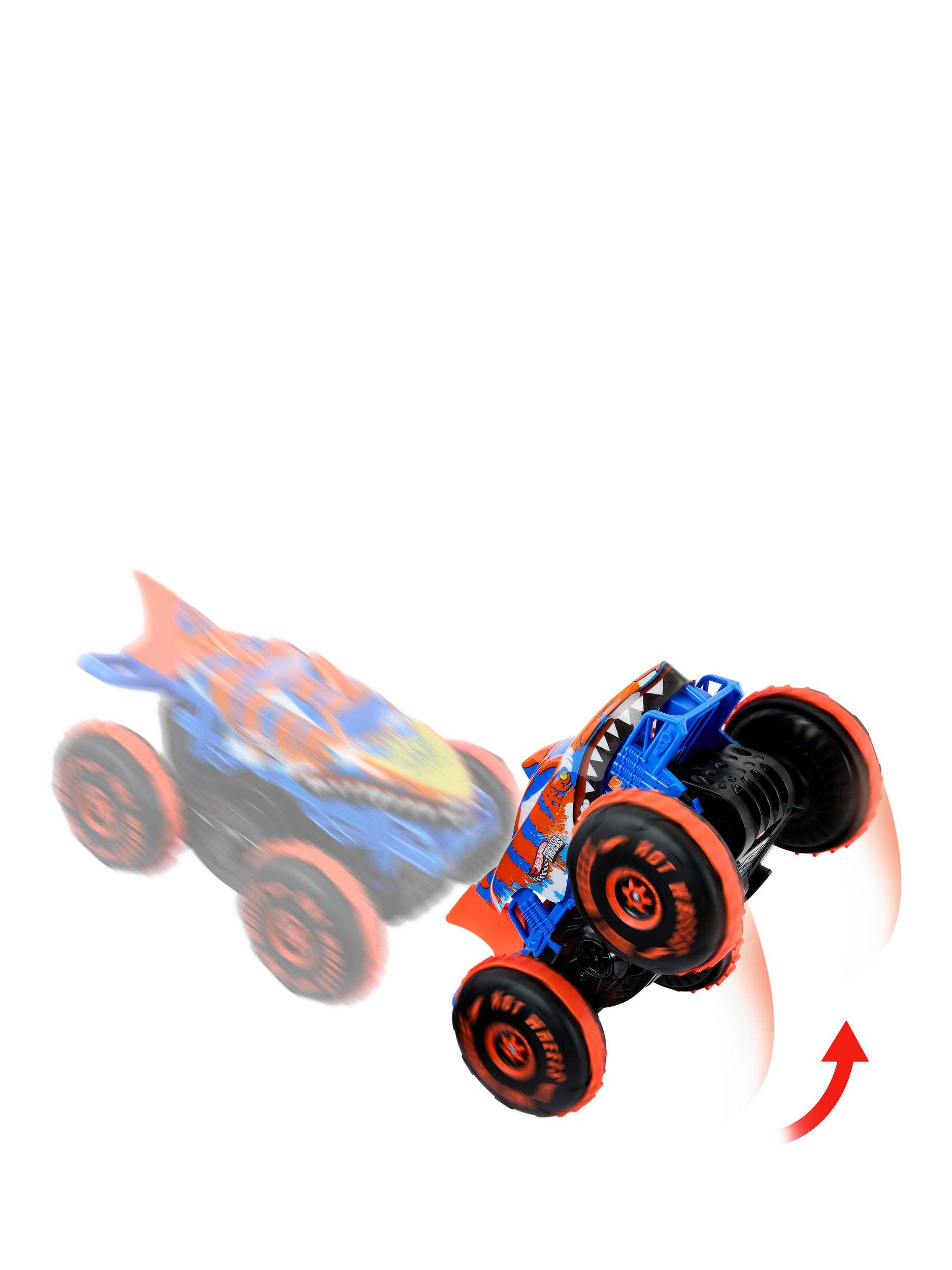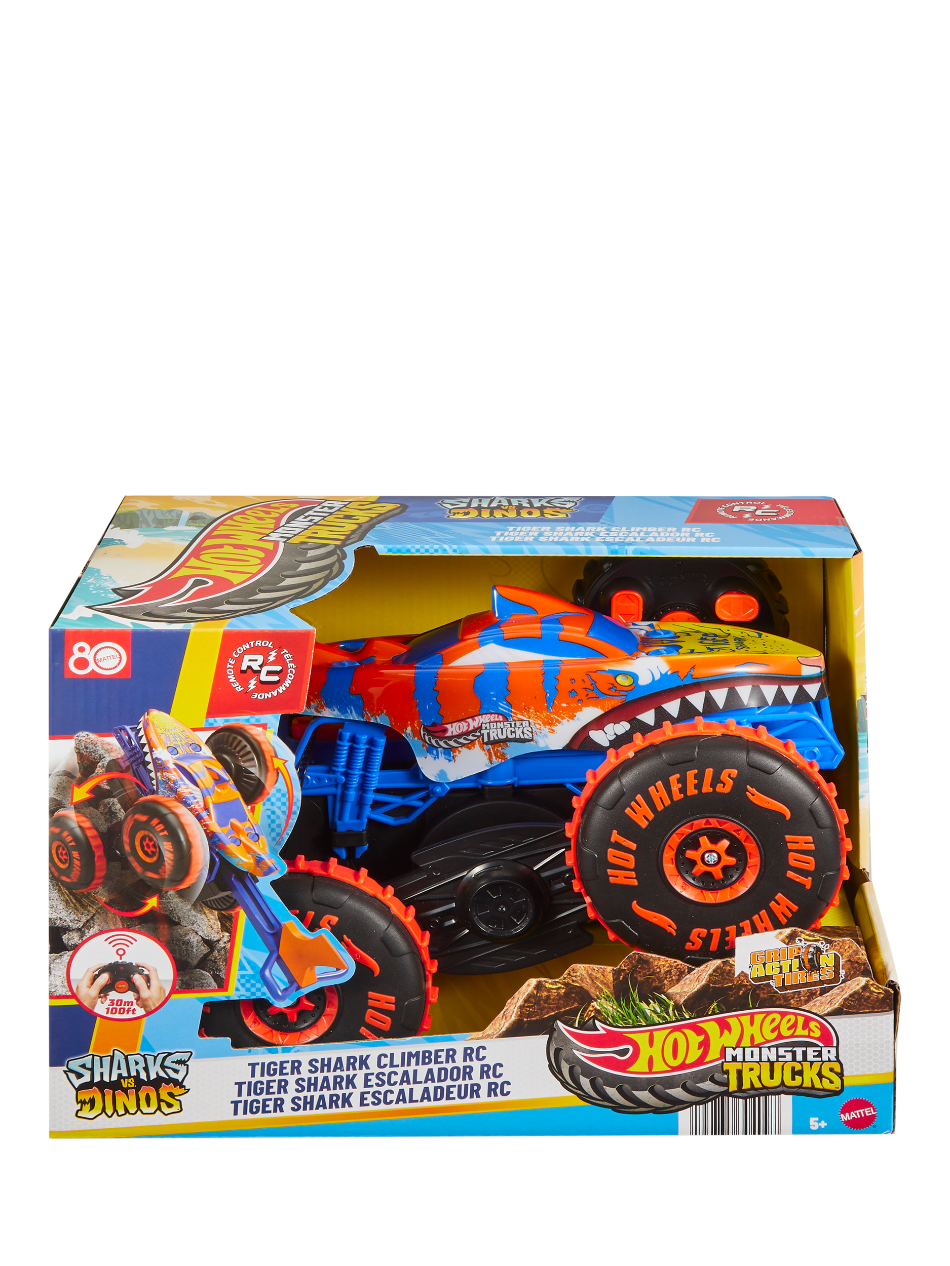 The Hot Wheels Monster Trucks Tiger Shark Climber RC is ready to smash, crash and climb! It features multi-terrain capabilities with an innovative tail that helps the beast climb over obstacles and the competition. In speeder mode, it plows over assorted surfaces thanks to its Grip Action Tyres. Enter climber mode to extend its tail and have Tiger Shark scale obstructions, like a champ. Push a button on the remote to send it spinning into a frenzy, showing off its speed and style.