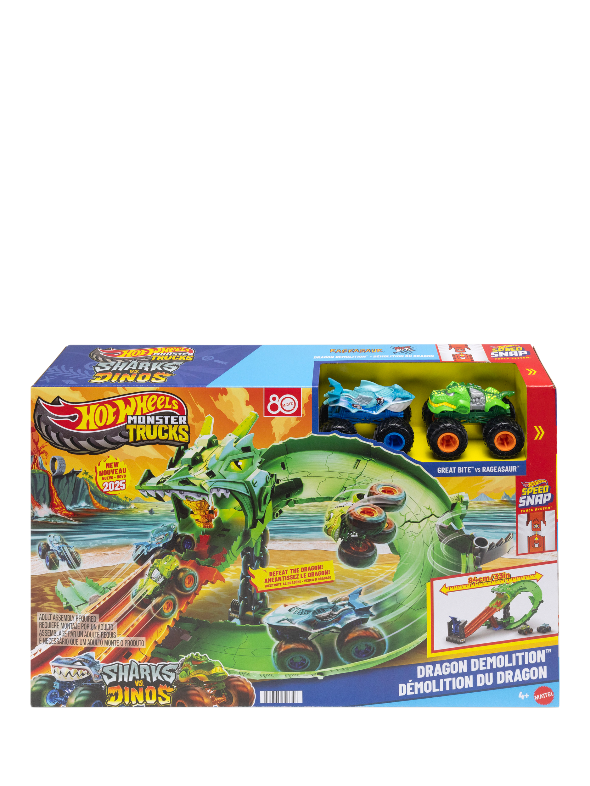 The race is on between Hot Wheels Monster Trucks: Great Bite and Rageasaur, to defeat the nemesis dragon in the Sharks vs. Dinos Dragon Destruction Playset.