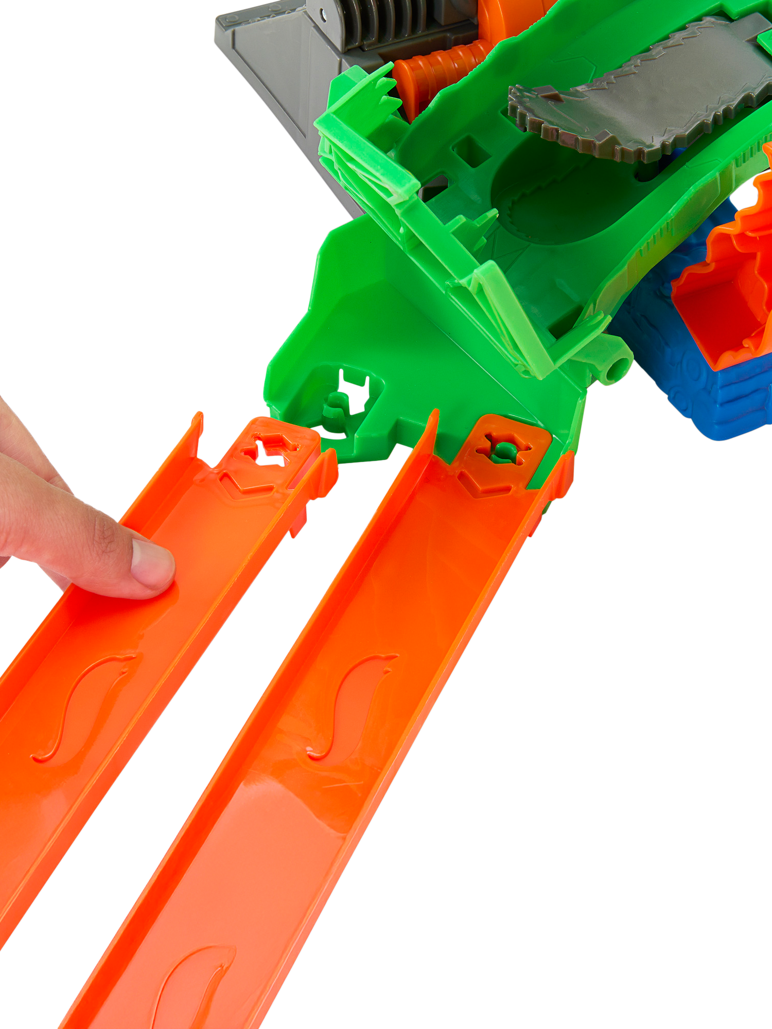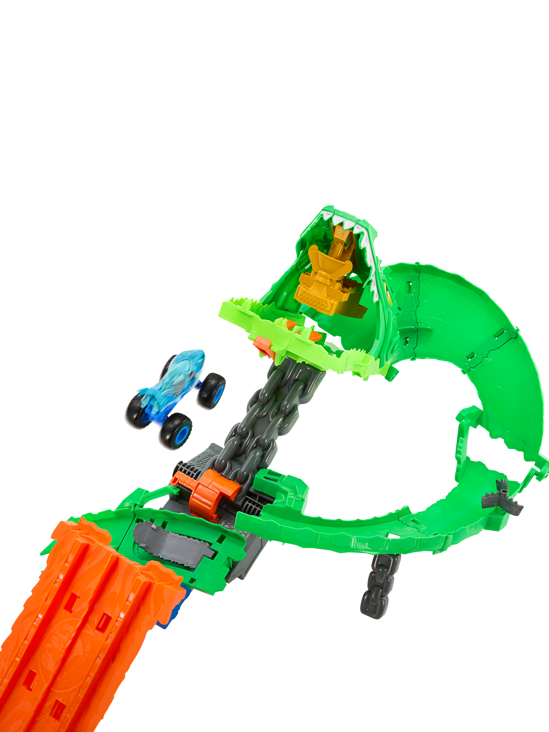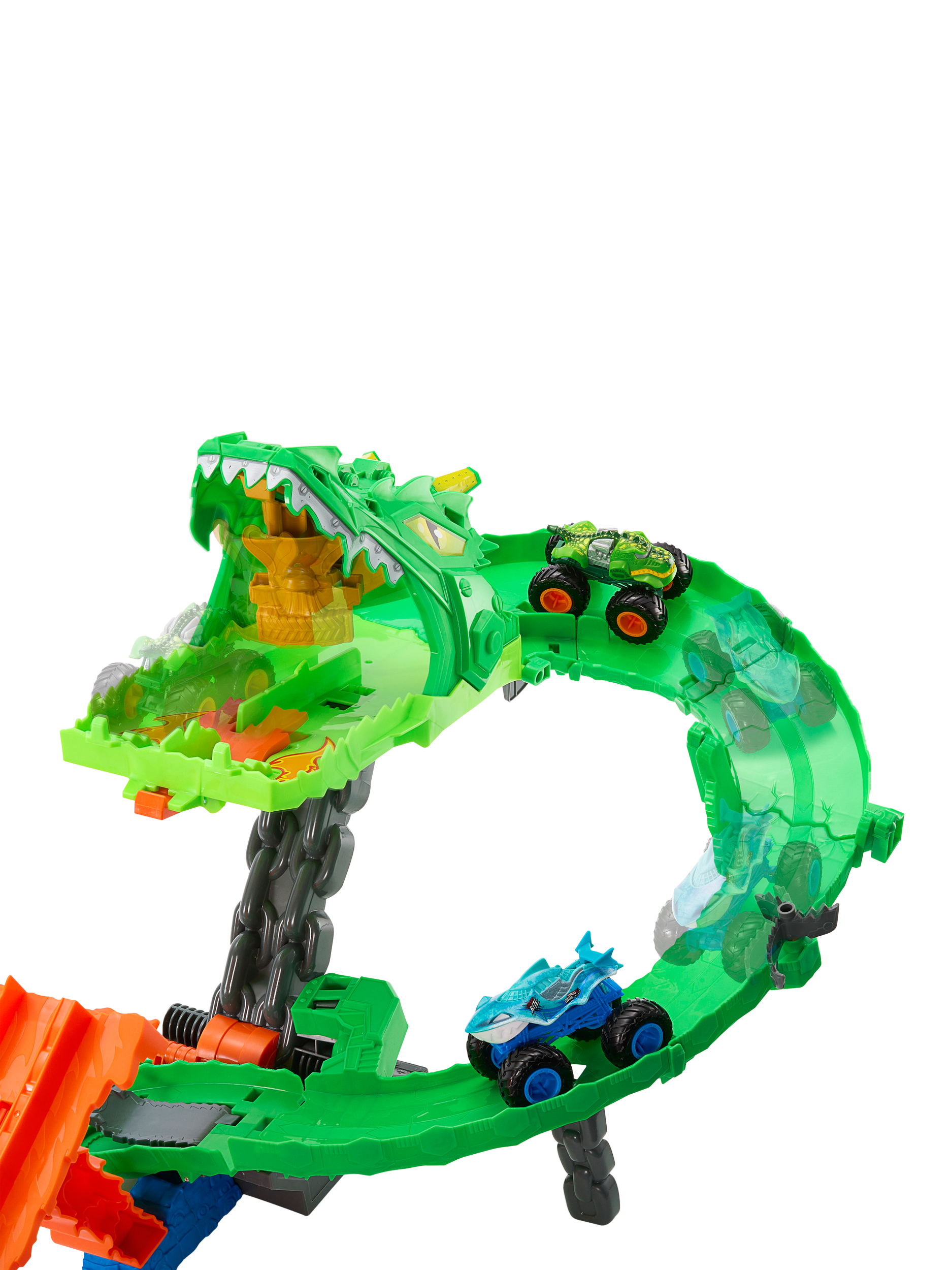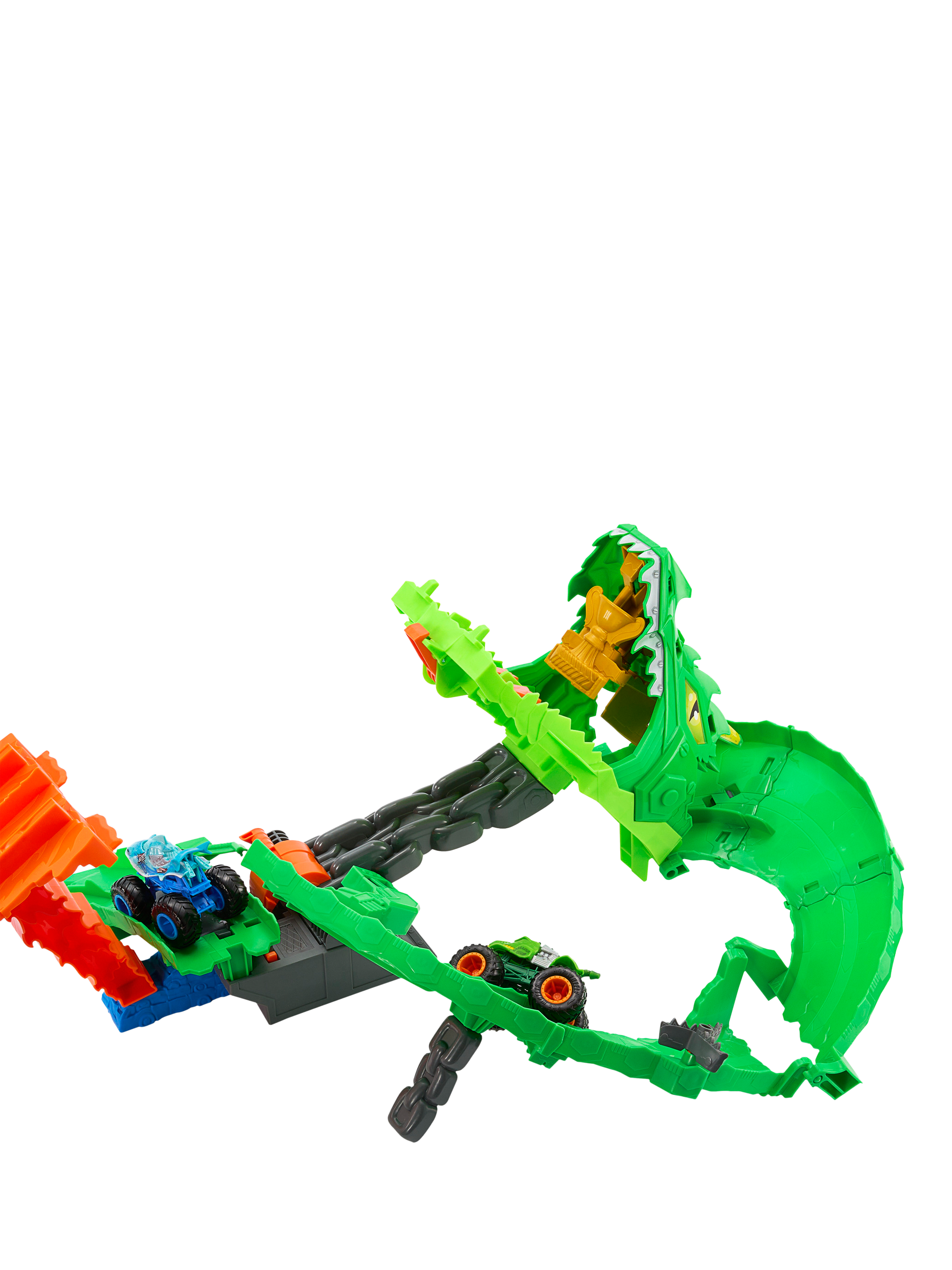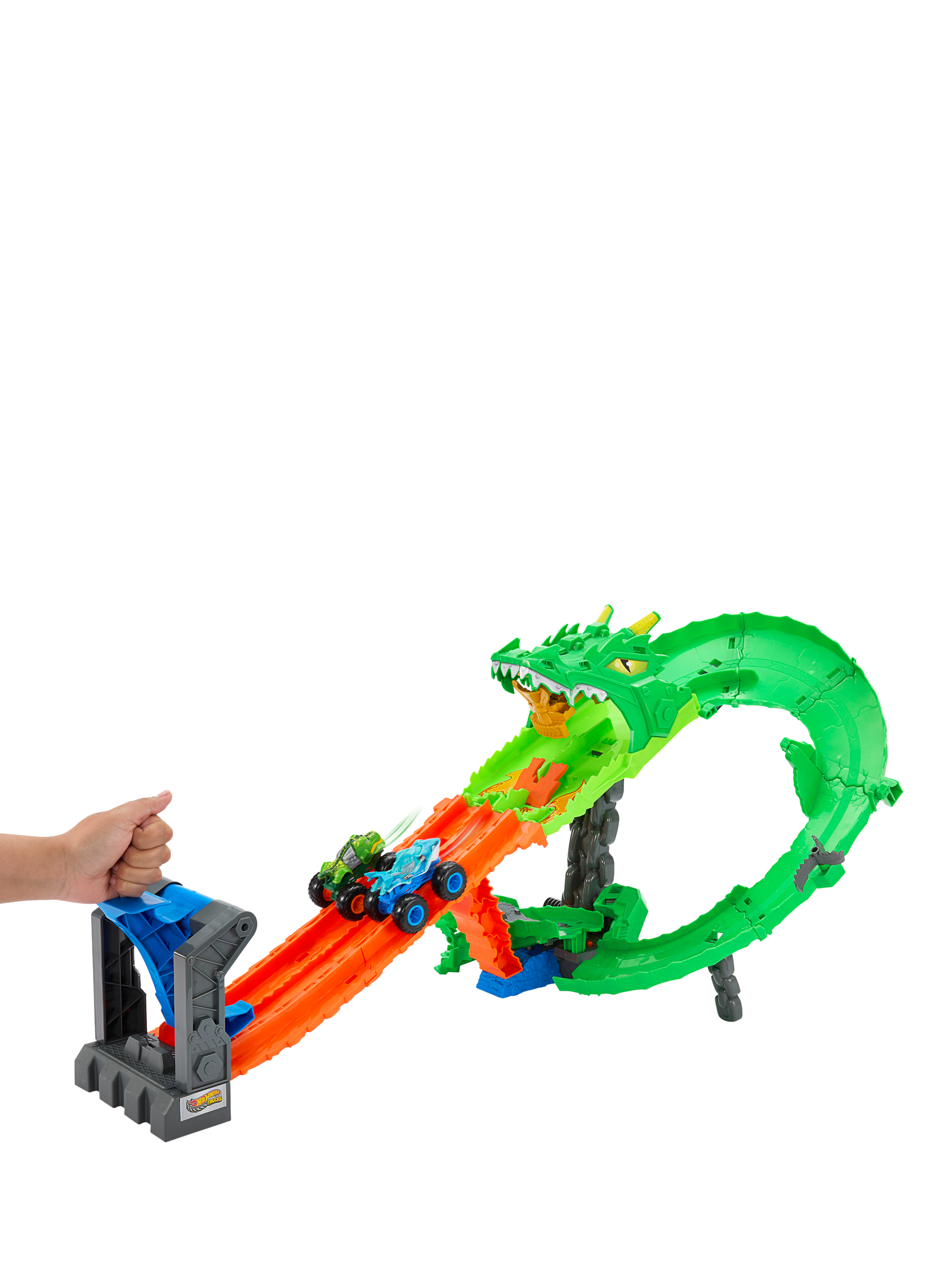 Load the included toy trucks into the double slam launcher, then send them racing side-by-side through the mouth of the cyborg dragon. They race down through the dragon's insides, where a chainsaw diverter randomly chooses one of three outcomes: hold back both trucks, knock one truck off the track or let both escape to defeat the nemesis. Once the dragon collapses, kids can launch into its mouth and claim the trophy.