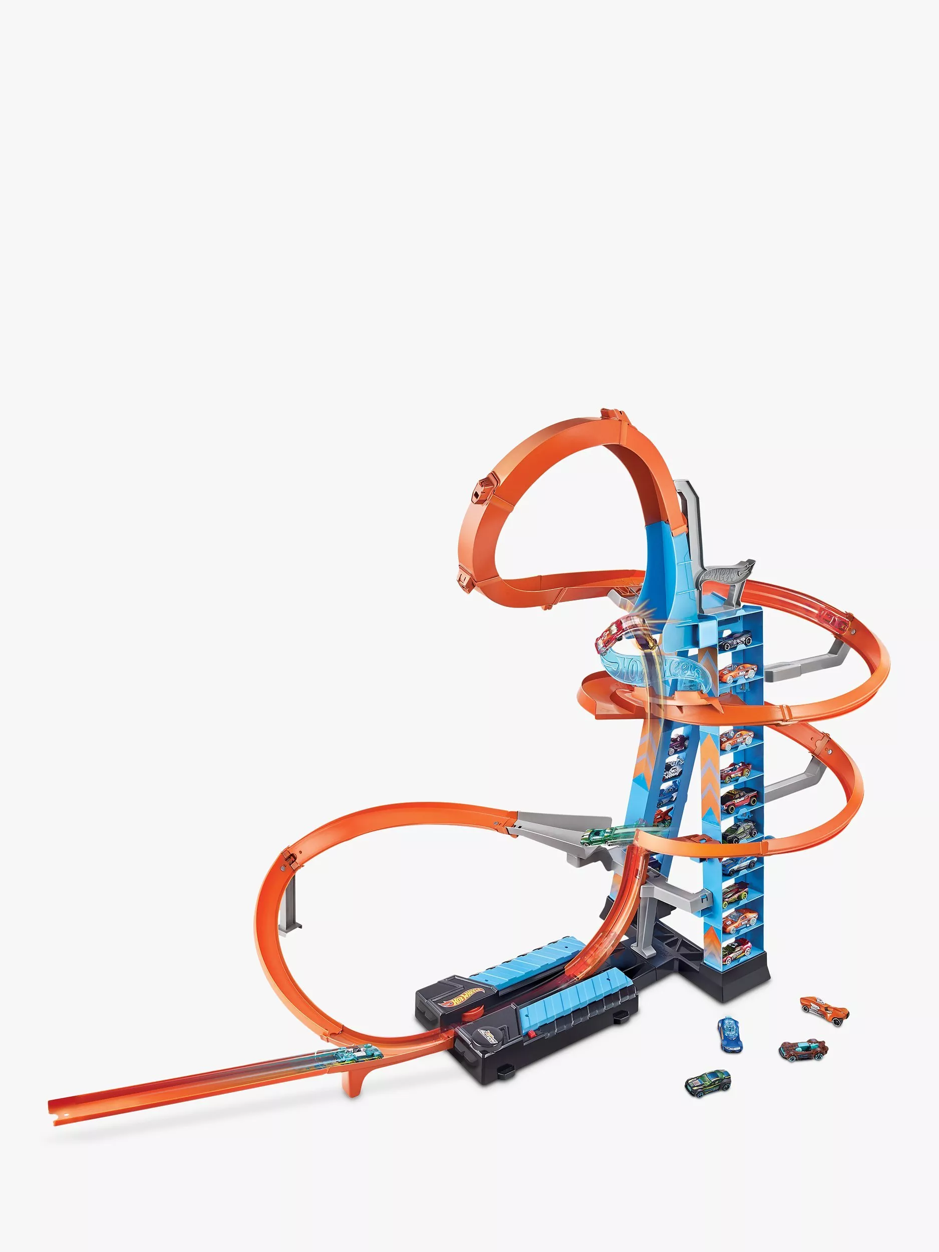 Kids can boost their vehicles up and up to the sky for a super-cool jump and the most epic mid-air crashes ever! The tower provides parking for 20+ cars, and an orange track that loops multiple times provides amazing stunting action with a motorized booster for leveraging competition and improving stunting and racing skills. Kids can also race multiple cars at the same time.