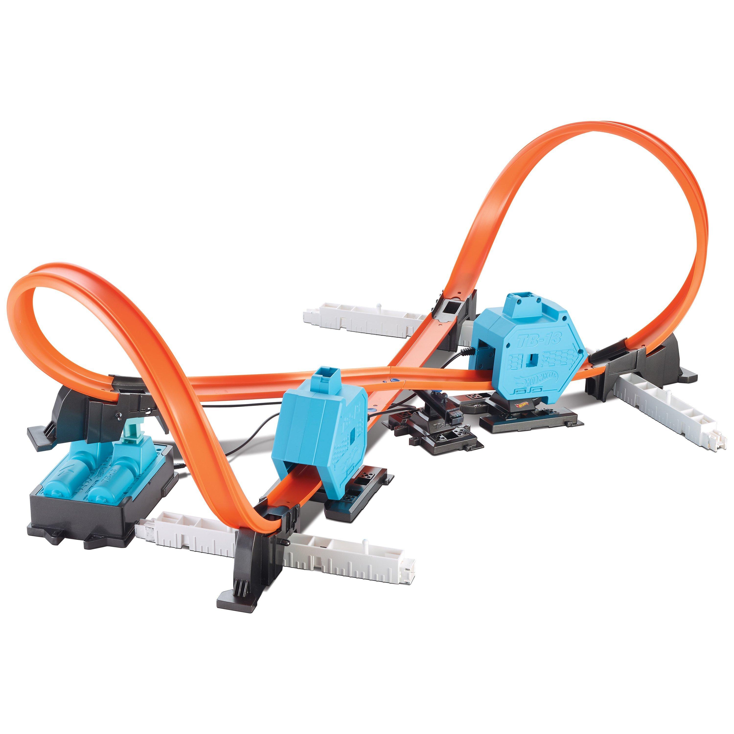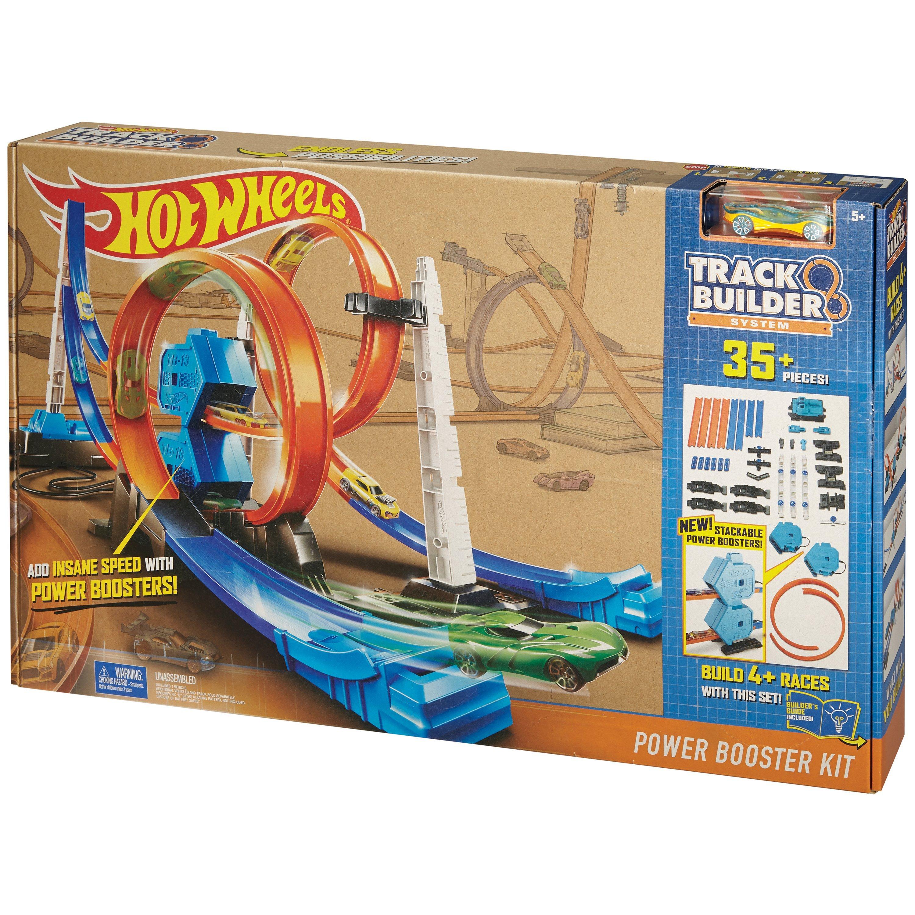 Test the limits of your Hot Wheels vehicles with the super boosted performance of the Track Builder System Power Booster Kit and experiment with items from around the house! The possibilities are endless with open system play!
