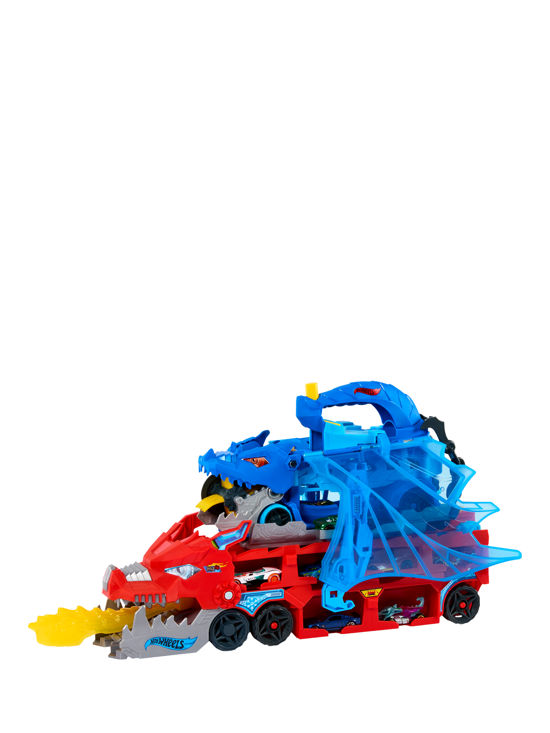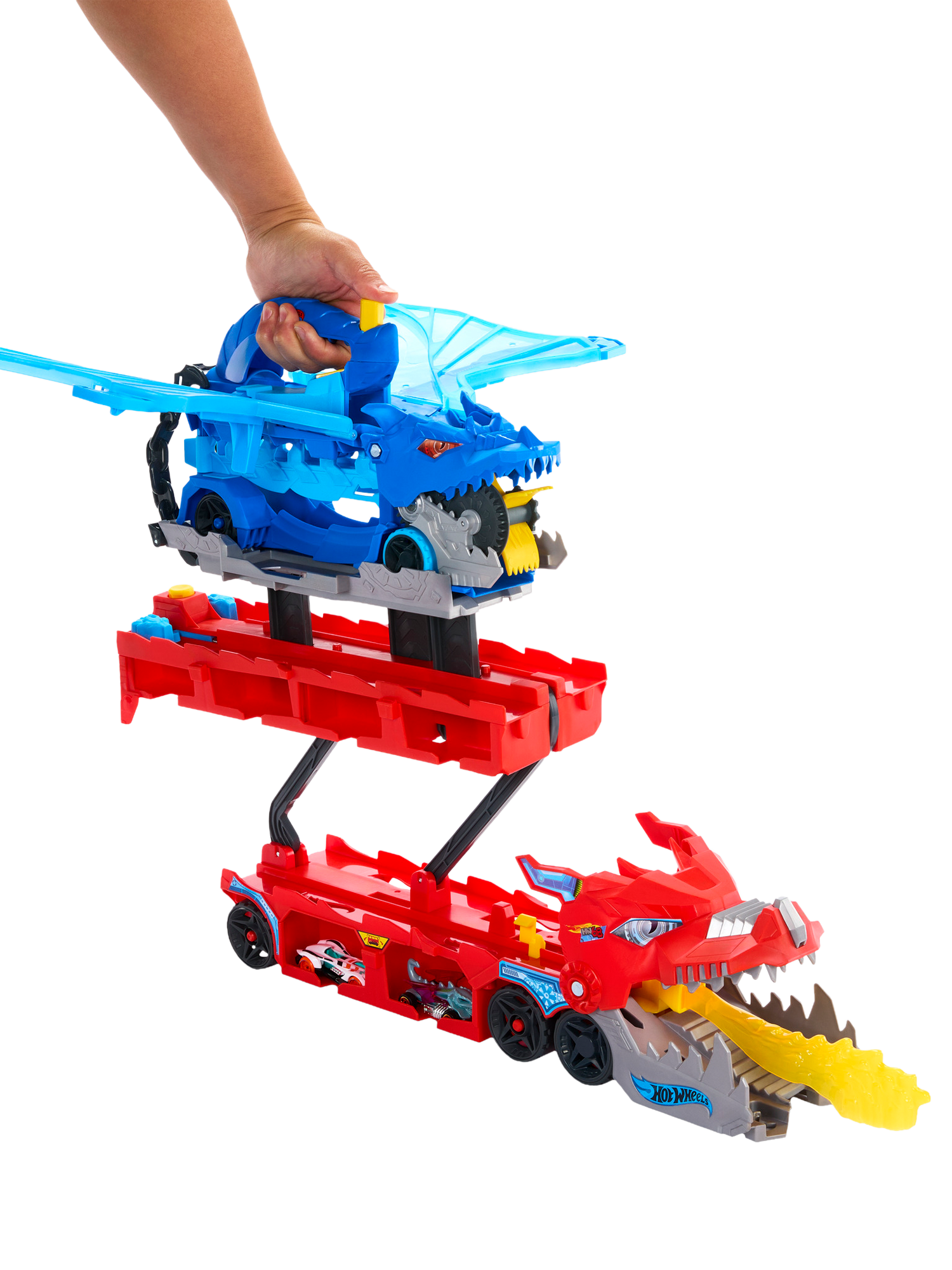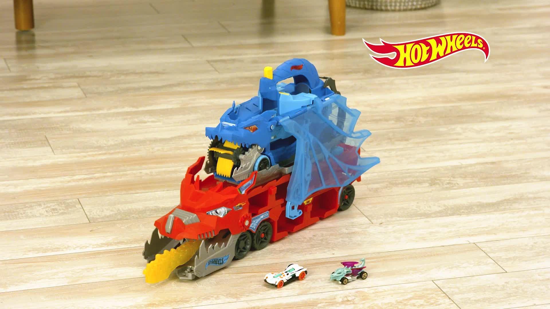 The hauler includes two 1:64 scale cars, but kids can store more than 20 vehicles in and on the two dragons - additional cars sold separately. Launch out or connect Hot Wheels track to the front for on-track play. Colours and decorations may vary.