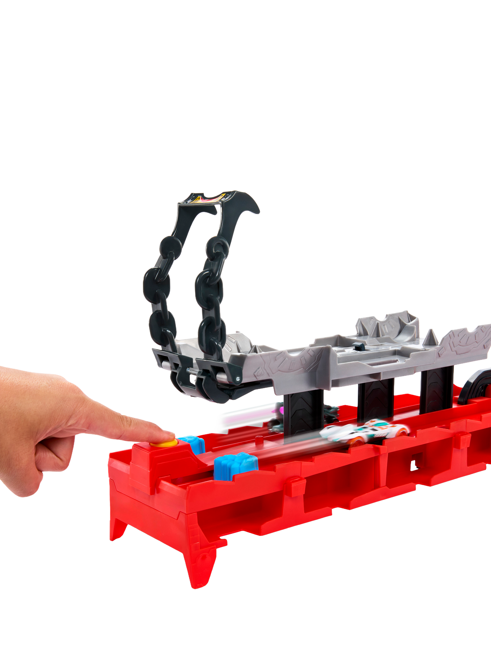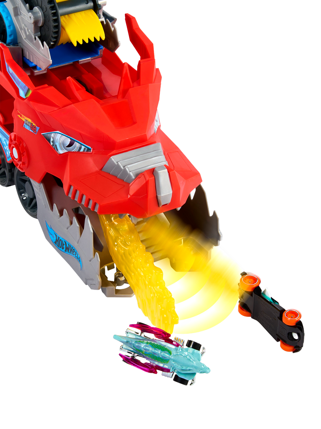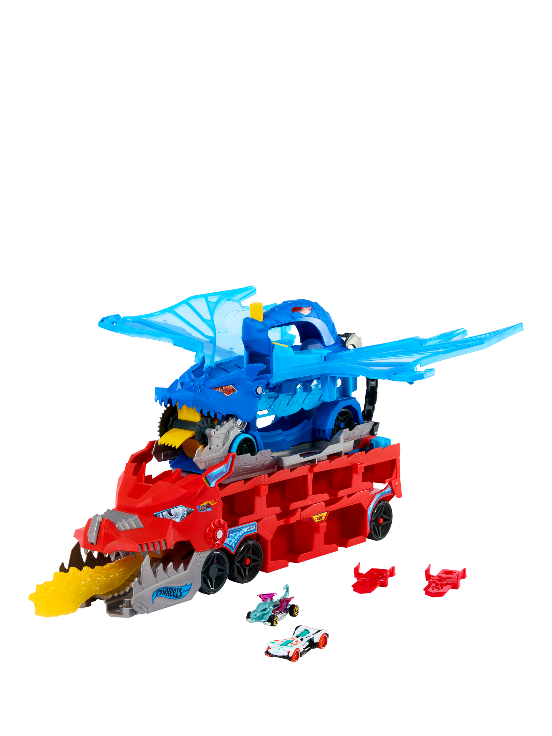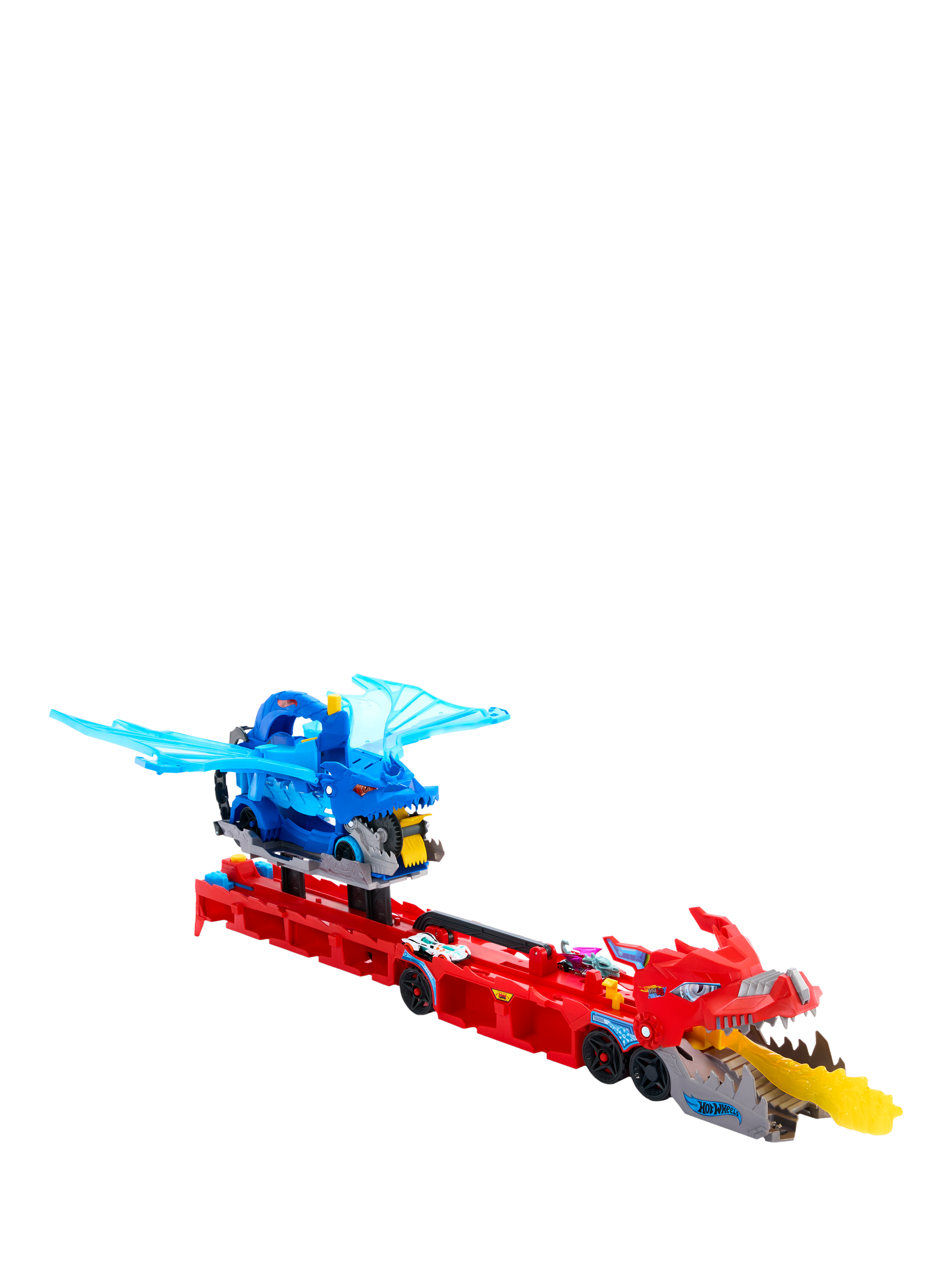 The hauler includes two 1:64 scale cars, but kids can store more than 20 vehicles in and on the two dragons - additional cars sold separately. Launch out or connect Hot Wheels track to the front for on-track play. Colours and decorations may vary.