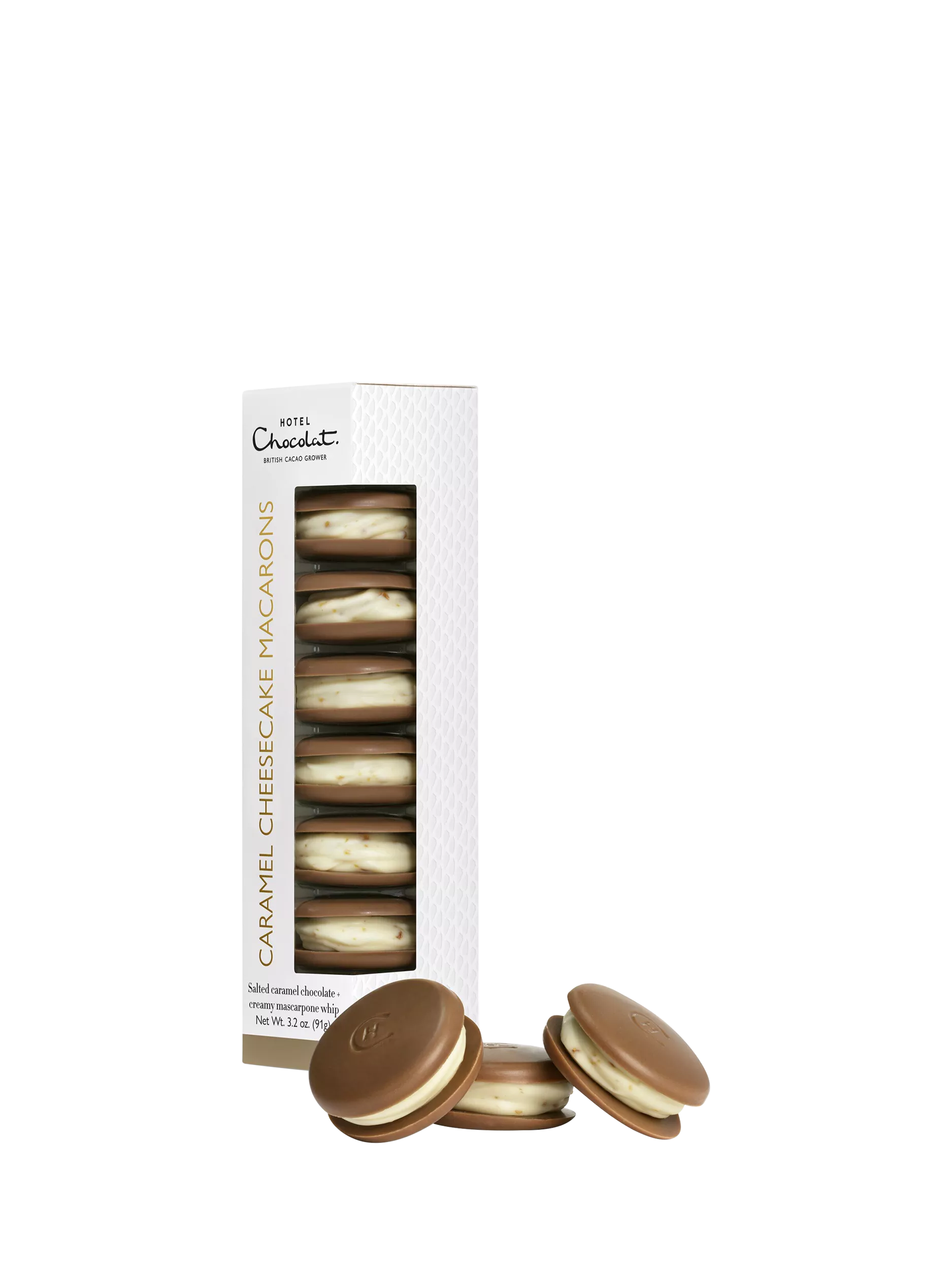 Eight Hotel Chocolat milk chocolate macarons filled with a mascarpone white whip and salted-caramel éclat.