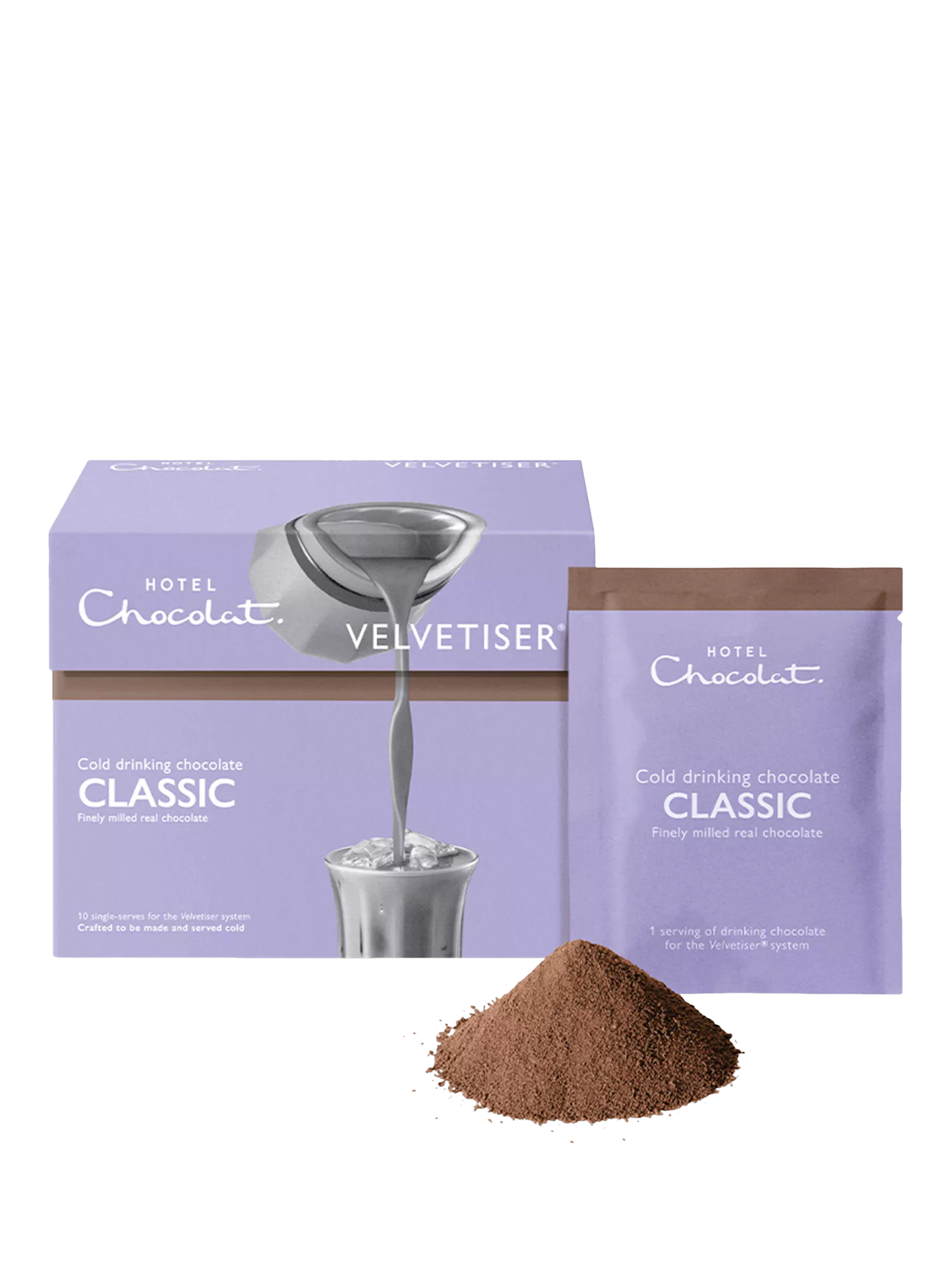 Ten Classic Cold Drinking Chocolate Sachets - deeply chocolatey, exceptionally creamy, high-cacao milk chocolate. Revolutionary cold drinking chocolate from Hotel Chocolat. Crafted with finely milled real chocolate for the ALL-NEW Velvetiser®.