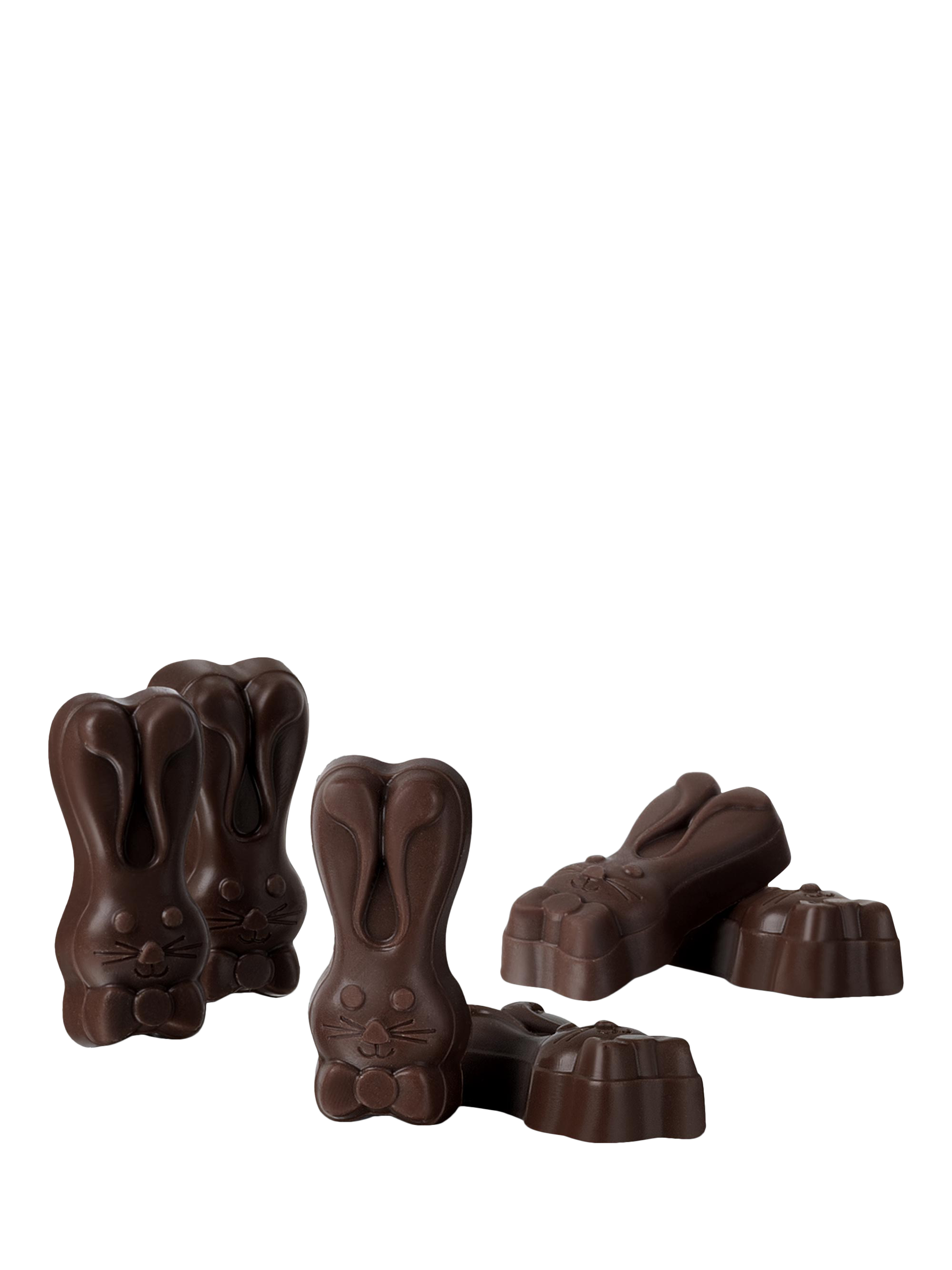 16 dashing dark chocolate bunnies, dressed to impress in solid 70% dark chocolate.