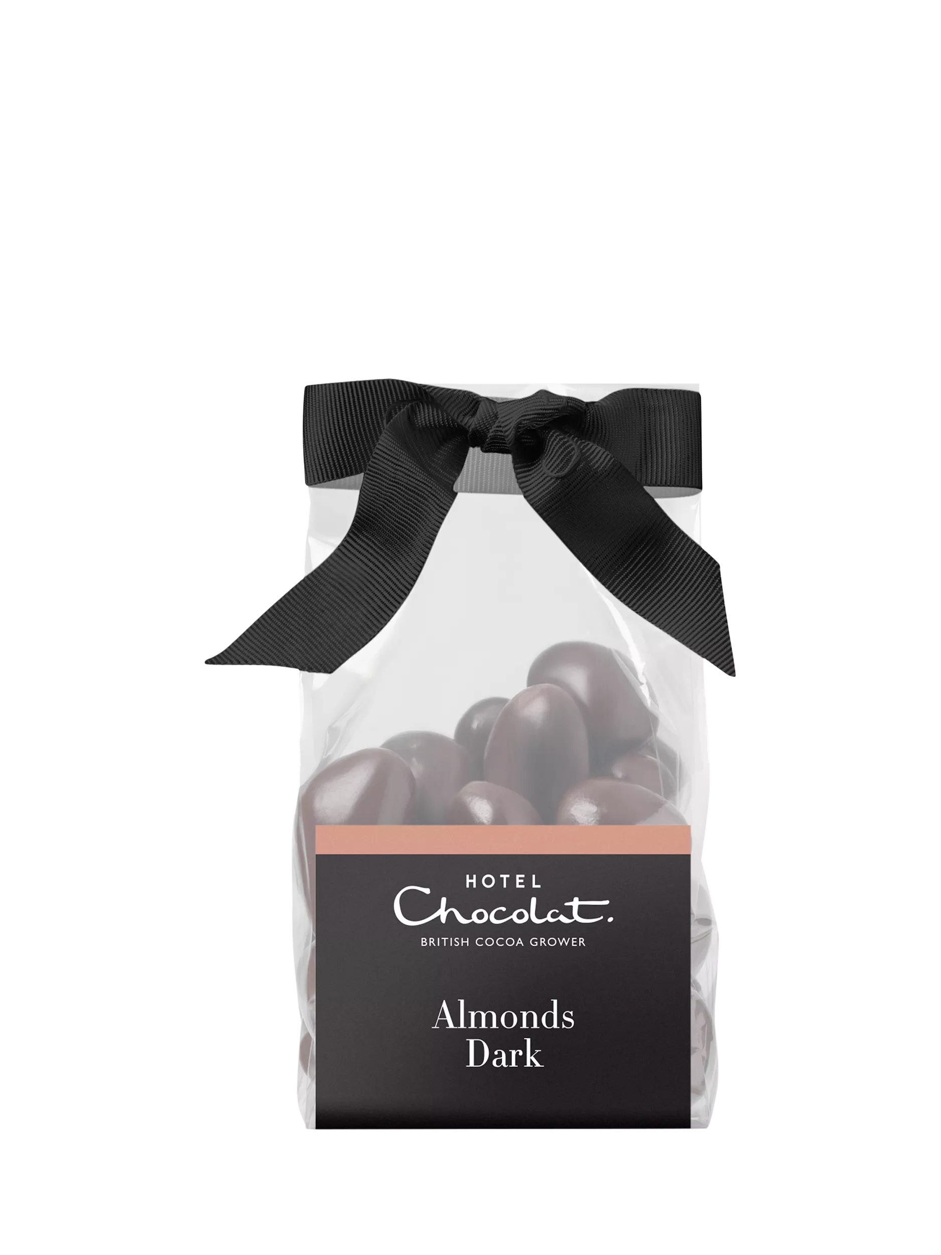 Caramelised Californian almonds enrobed in elegant dark chocolate, wrapped in a gift bag with a black bow.
