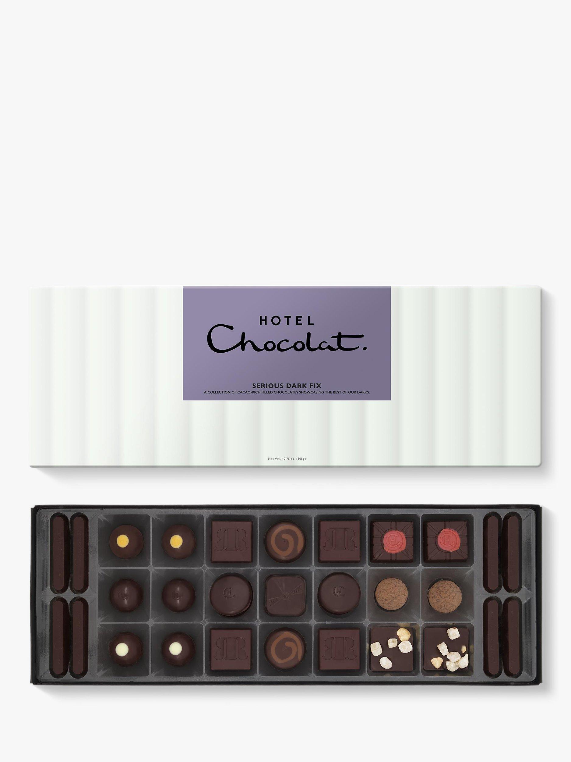 A box of 29 cacao-rich chocolates showcasing the best of Hotel Chocolat’s dark range, featuring the ultimate in brooding pralines, caramels and truffles.