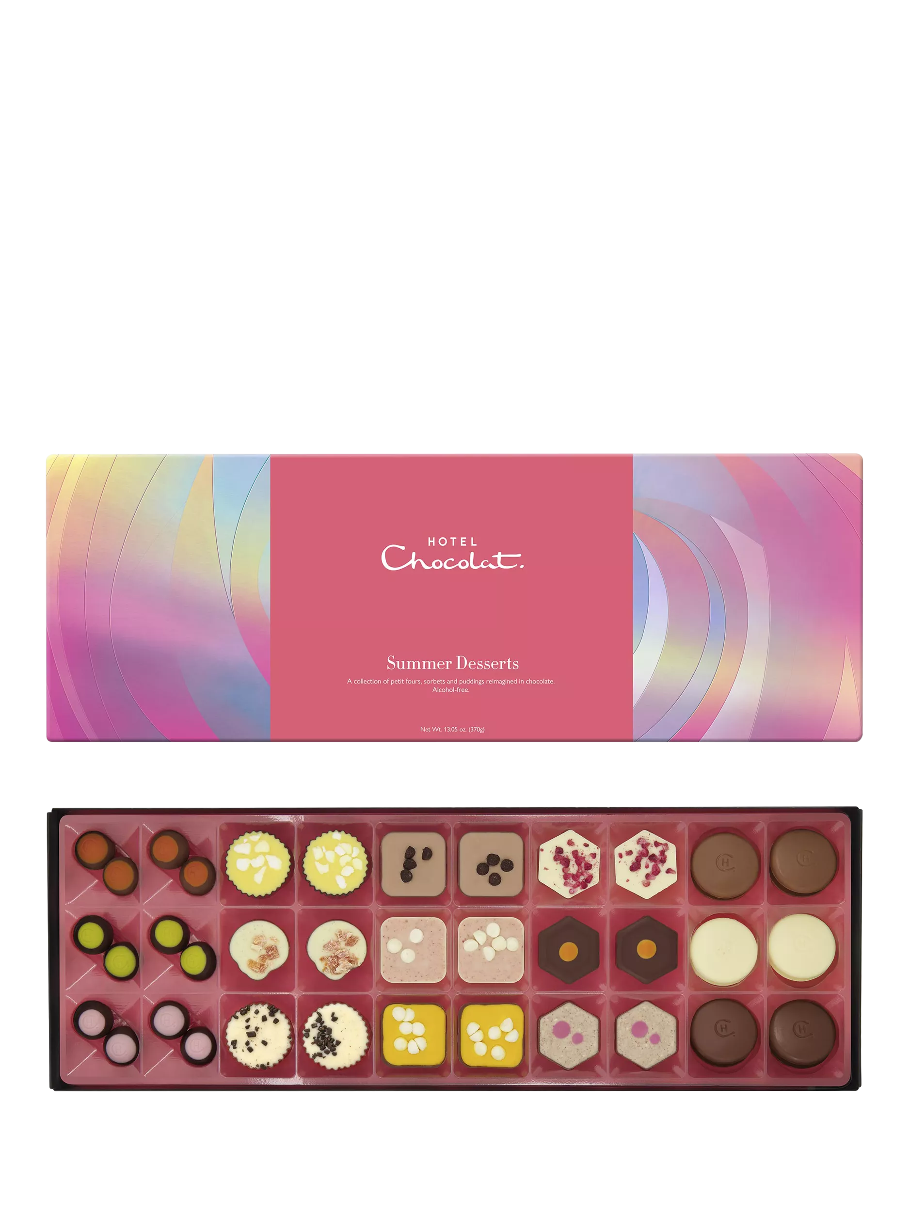 As much a dessert tray as a chocolate box. Chocolatiers merged the two to come up with the Summer Desserts H-Box. Thirty six chocolates inspired by the best summer puds, petit fours and bakes, each recipe lets you experience all the flavours of your favourite dessert, in chocolate form.
