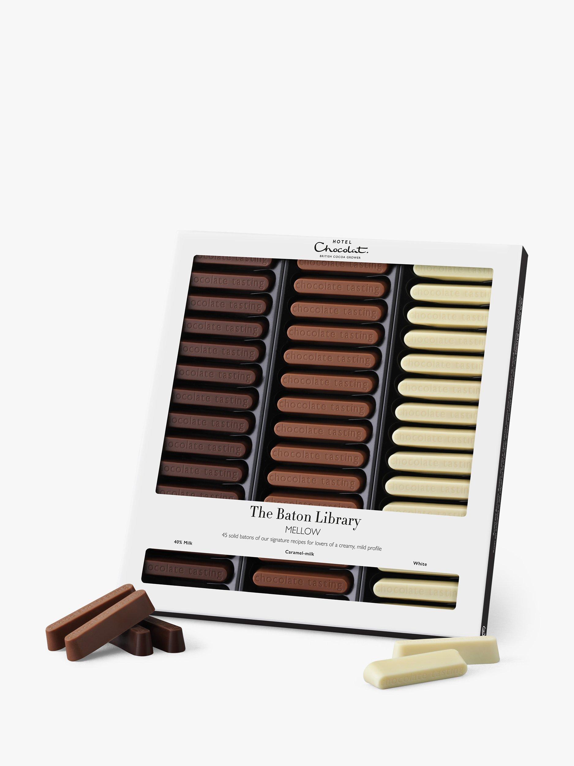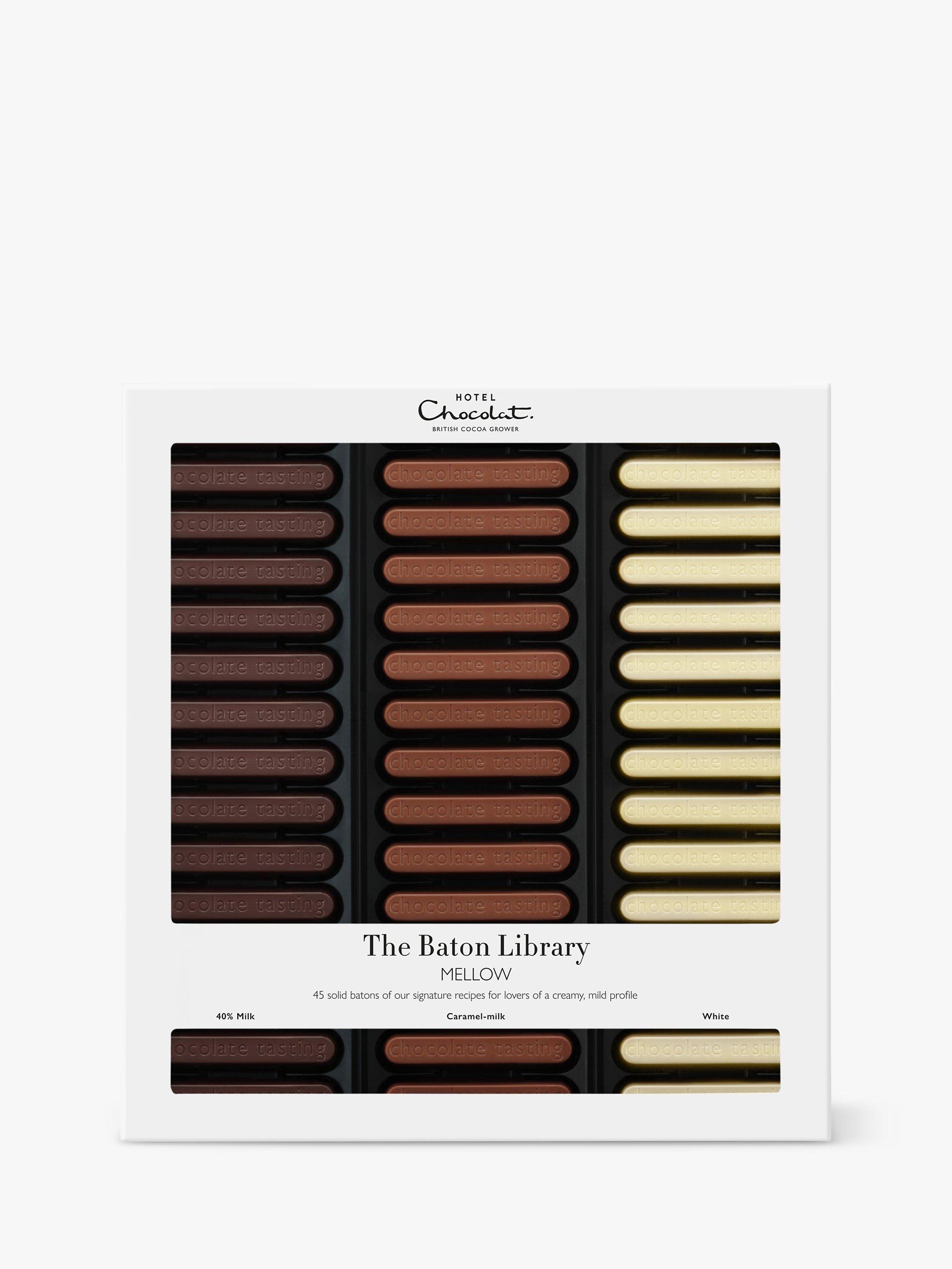 The Mellow Baton Library contains 45 solid chocolate batons of Hotel Chocolat signature 40% milk, caramel and white. This chocolate baton library will make the perfect gift for anyone.