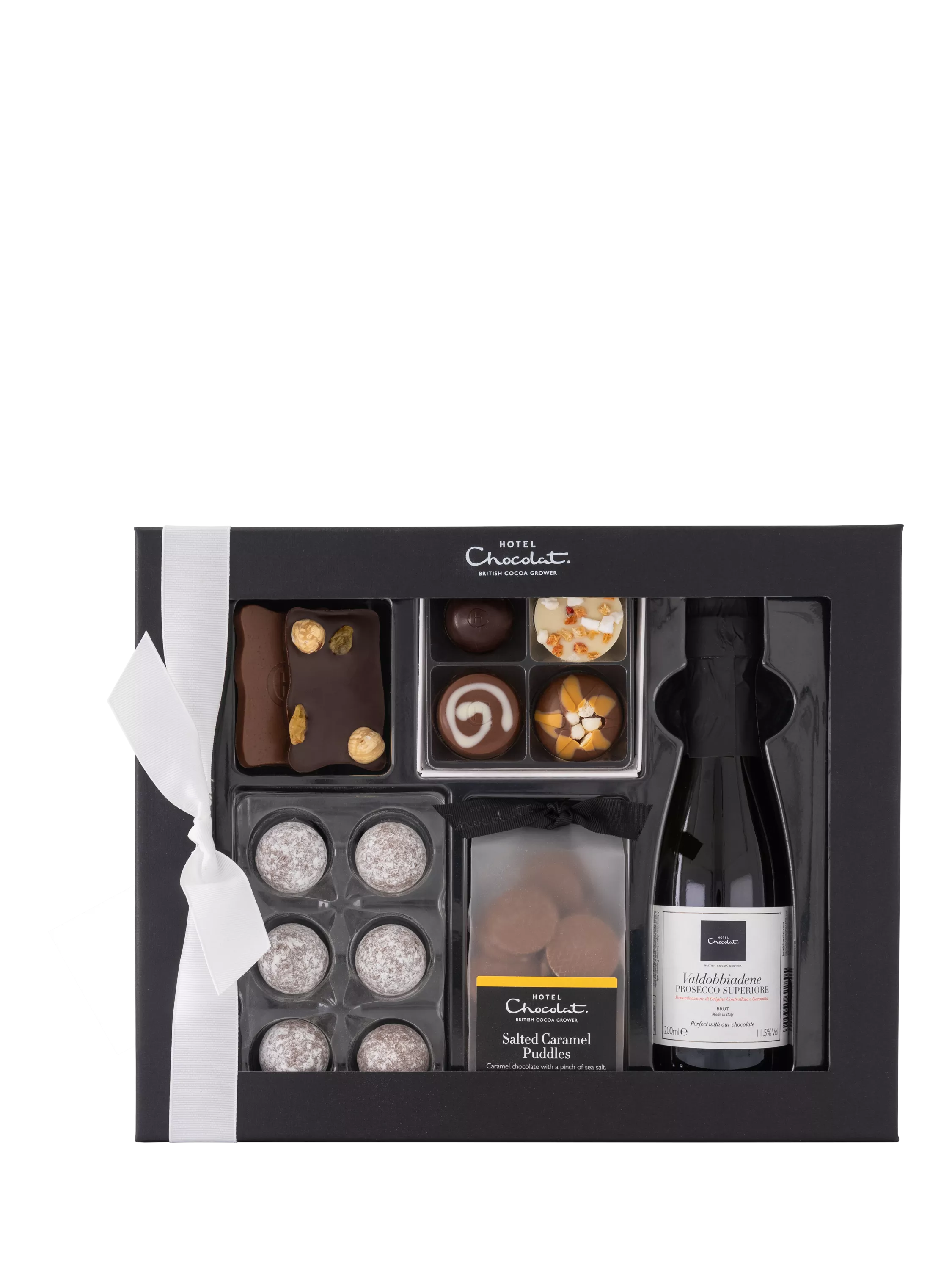- Ingredients: cocoa solids (cocoa butter, cocoa mass), sugar, full cream MILK powder, stabilisers (sorbitol, glycerol), sweetened hazelnut paste (HAZELNUTS, sugar, emulsifier (sunflower lecithin)), whipping cream (cream (from MILK), stabiliser (carrageenan)), caramel flakes (sugar, glucose syrup), skimmed MILK powder, HAZELNUT paste, glucose syrup, butter oil (from MILK), neutral alcohol, roasted HAZELNUTS, invert sugar syrup, caramelised sugar, champagne (SULPHITES), emulsifiers (SOYA lecithin, sunflower lecithin), golden raisins (raisins, sunflower oil, preservative (SULPHITES)), vegetable fats (coconut, shea, sunflower), shortbread biscuits (WHEAT flour, coconut oil, sugar, cocoa butter, WHEAT starch, raising agents (sodium bicarbonate, ammonium bicarbonate), salt), meringue granules (sugar, cocoa butter, WHEAT starch, EGG white), dextrose, freeze dried strawberry powder, flavourings, salt, freeze dried strawberry pieces, sea salt, lactose (from MILK), colours (paprika extract, annatto bixin), acidity regulator (citric acid). Dark chocolate contains minimum 70% cocoa solids. Milk chocolate contains minimum 40% cocoa solids, minimum 20% milk solids. White chocolate contains minimum 36% cocoa butter, minimum 27% milk solids. Caramel milk chocolate contains minimum 36% cocoa solids, minimum 26% milk solids. For allergens, including cereals containing gluten, see ingredients in BOLD. Ribbons are for decoration. Supervision of an adult is recommended. Caution: Although every care has been taken to remove nut shells, some may still remain. 1 × Valdobbiadene Prosecco Superiore BRUT (Contains SULPHITES) - 200ml e / 11.5% Vol.
