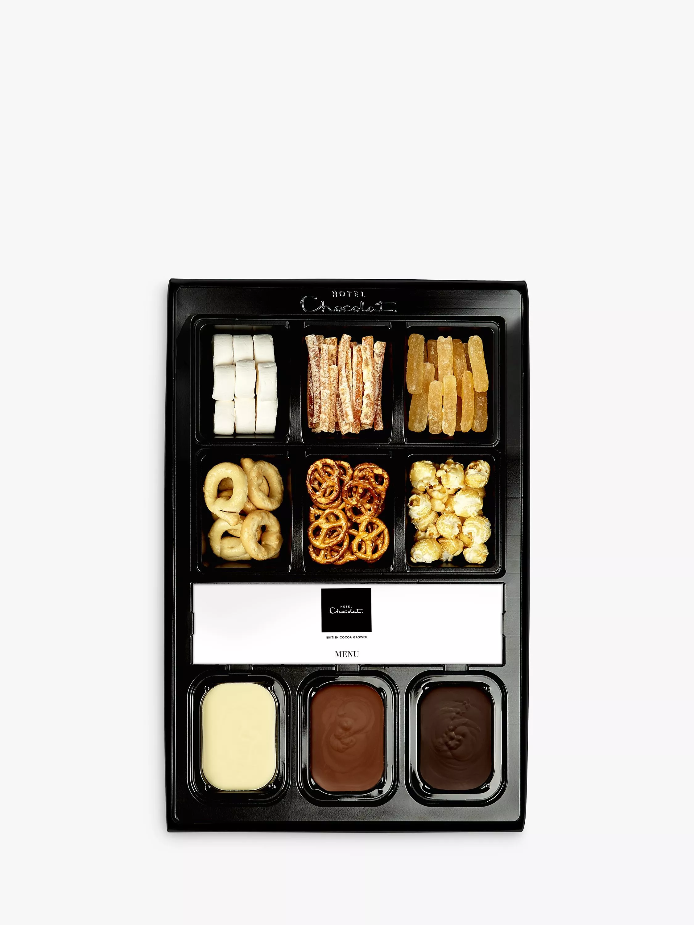 Simply heat and serve for a hands on chocolate dipping adventure. Dip, dunk and explore this selection of sweet and savoury treats in melting 40% milk, 70% dark and high-cocoa white chocolate. Great for cosy nights, parties and dinner dates. Messy is allowed! Serves up to 6 people