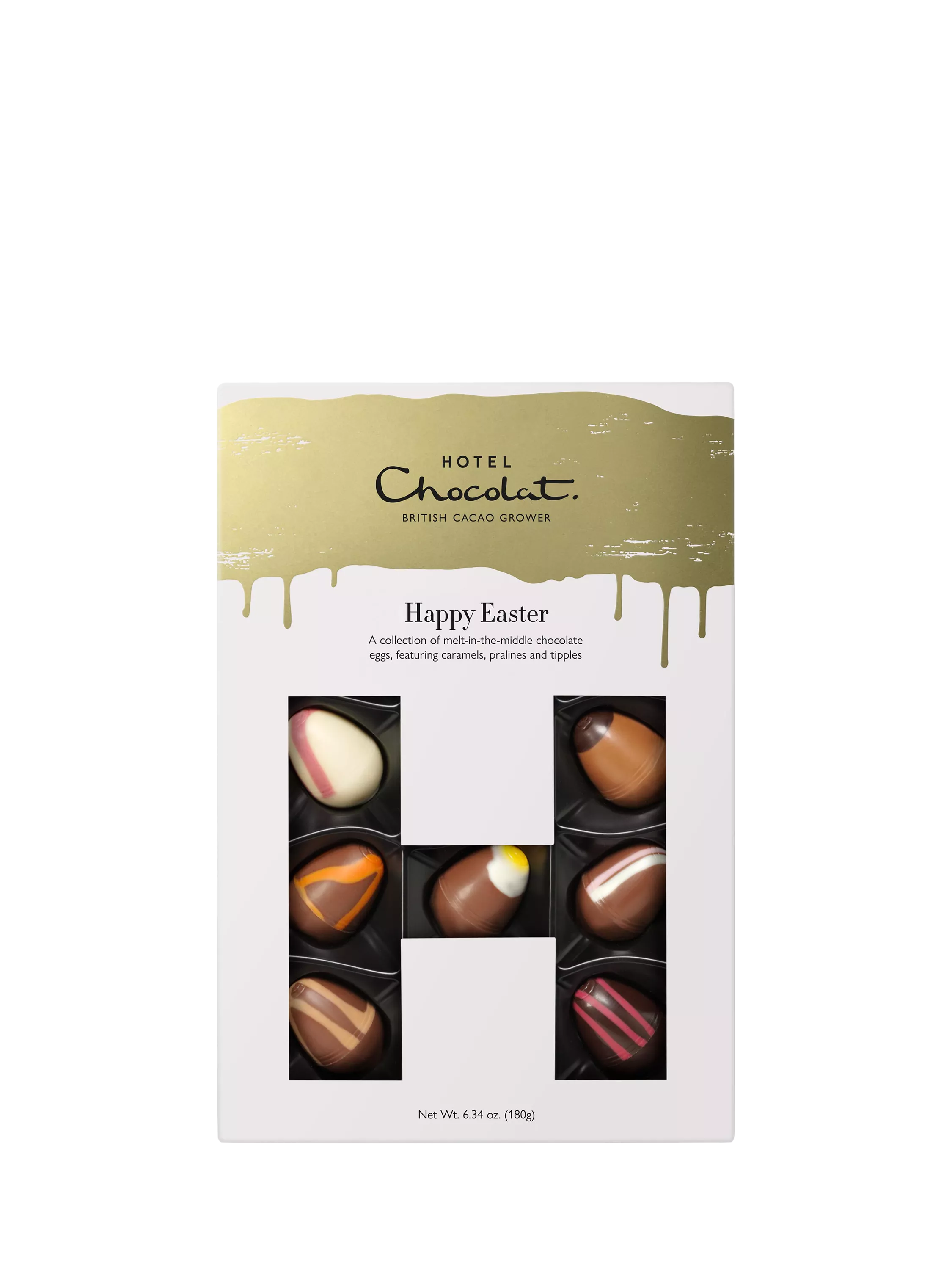 An Easter gift box brimming with spring-inspired recipes from Hotel Chocolat. Boozy Simnel Cake and Strawberries & Cream nestle alongside real Champagne truffles, super-smooth pistachio pralines, creamy macadamia in salted caramel and more – there’s something for every taste. A final flourish of gold makes for a luxurious Easter gift box – plenty for two to share, or an indulgent treat for one!