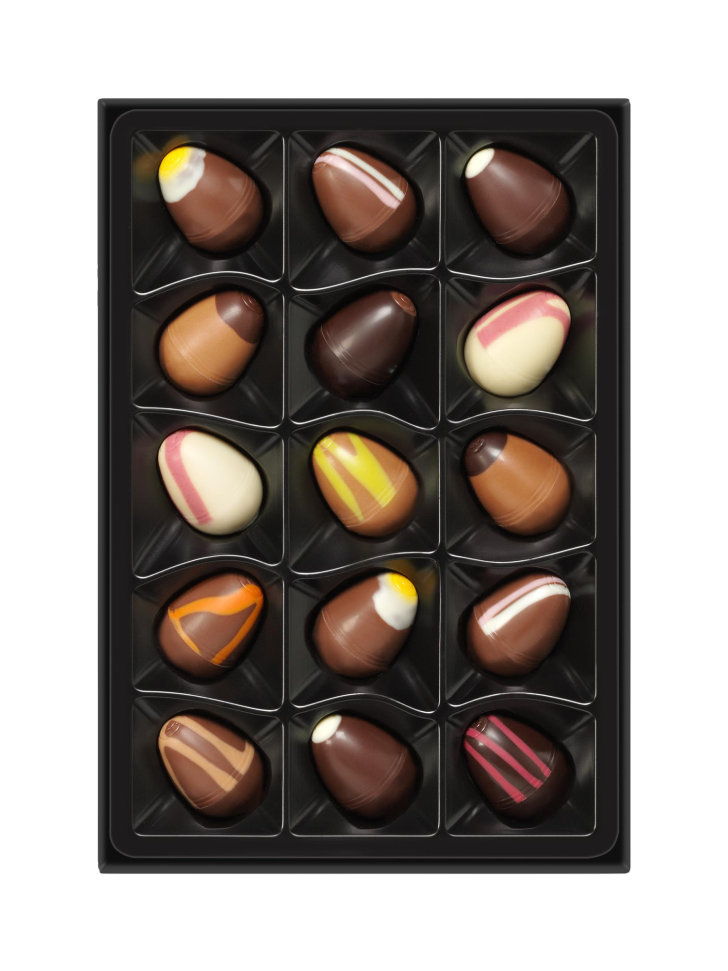 An elegant Easter gift box: 15 melt-in-the-mouth chocolate tiddly eggs brimming with caramels, pralines and tipples.