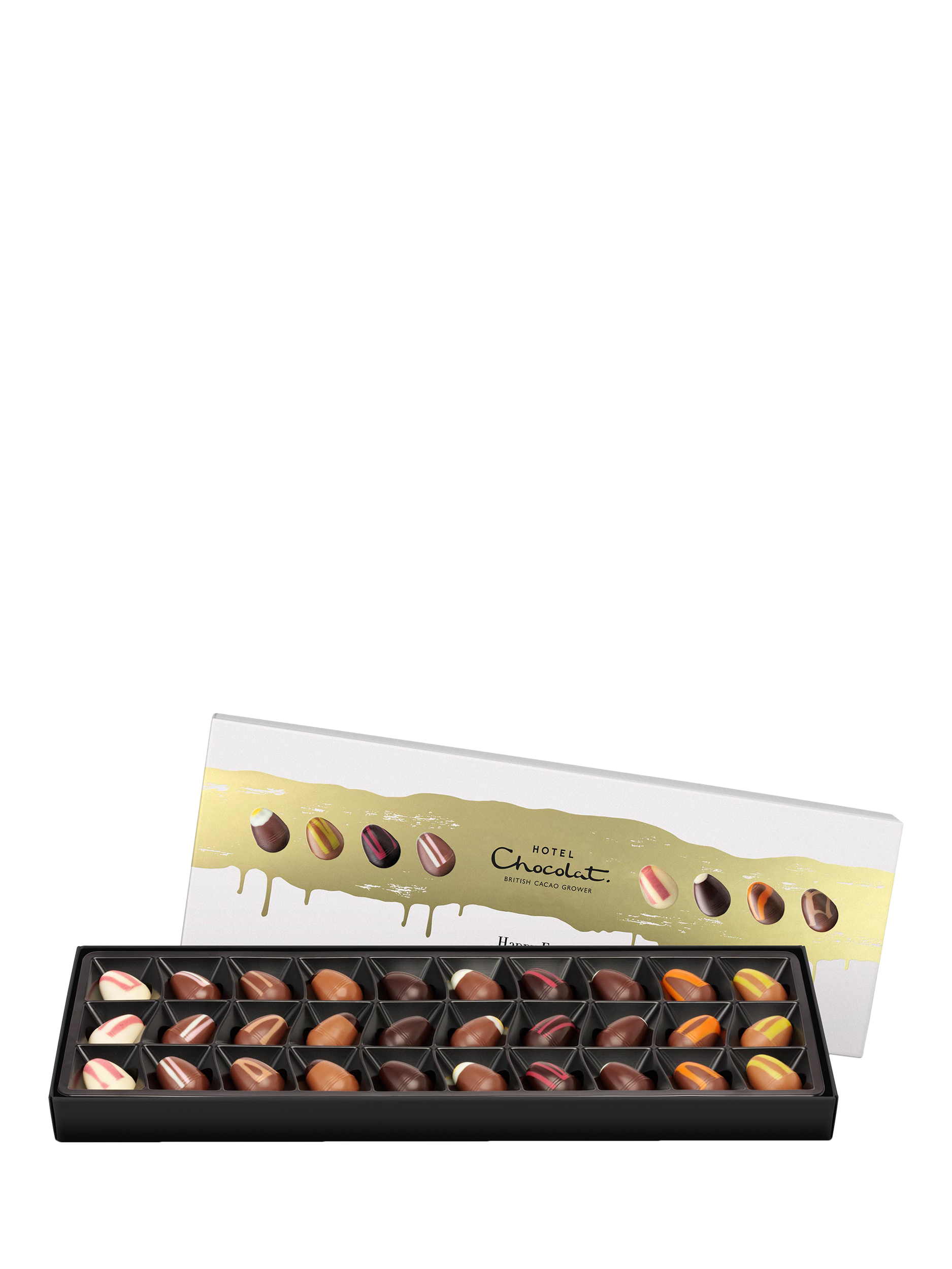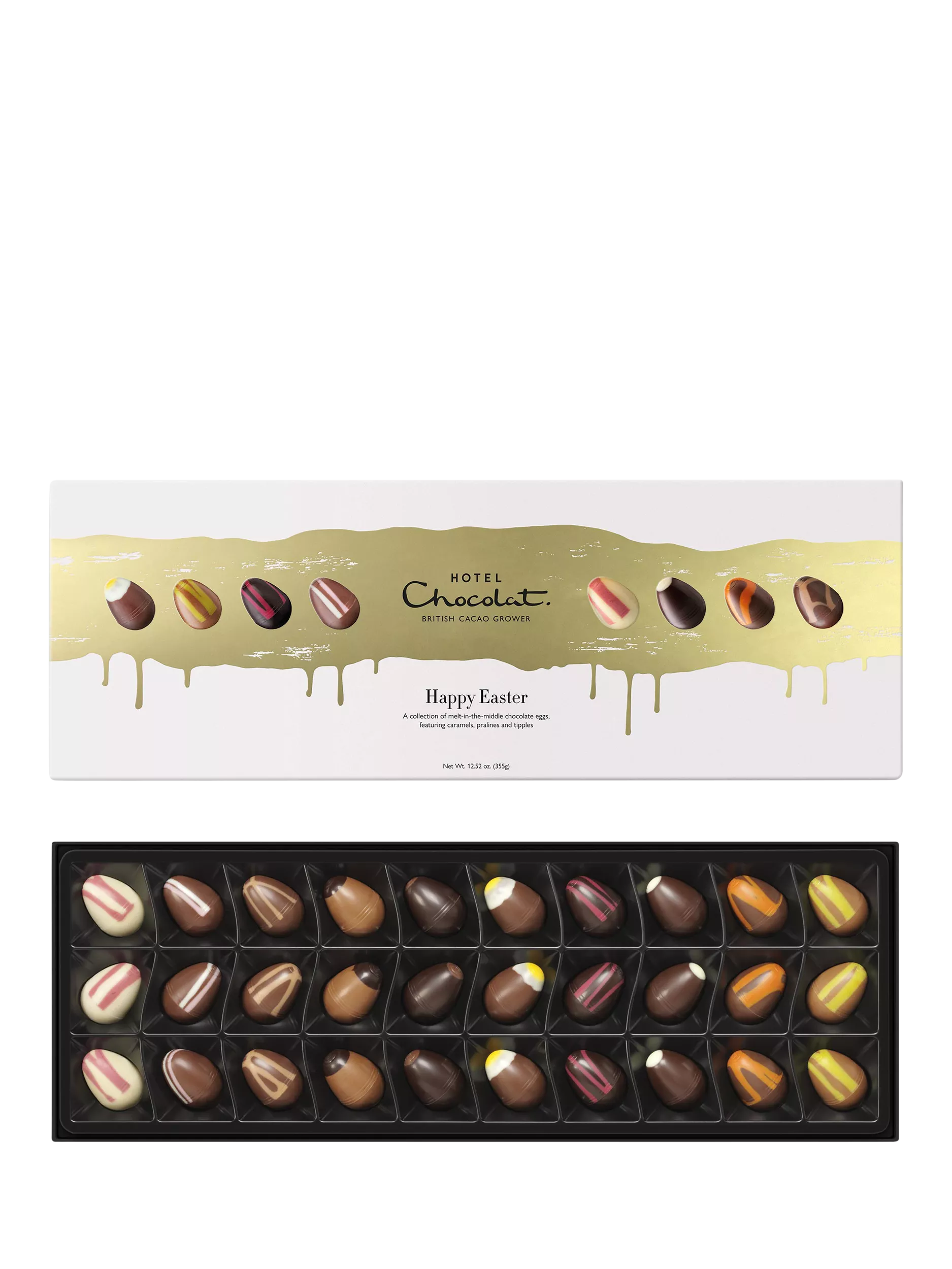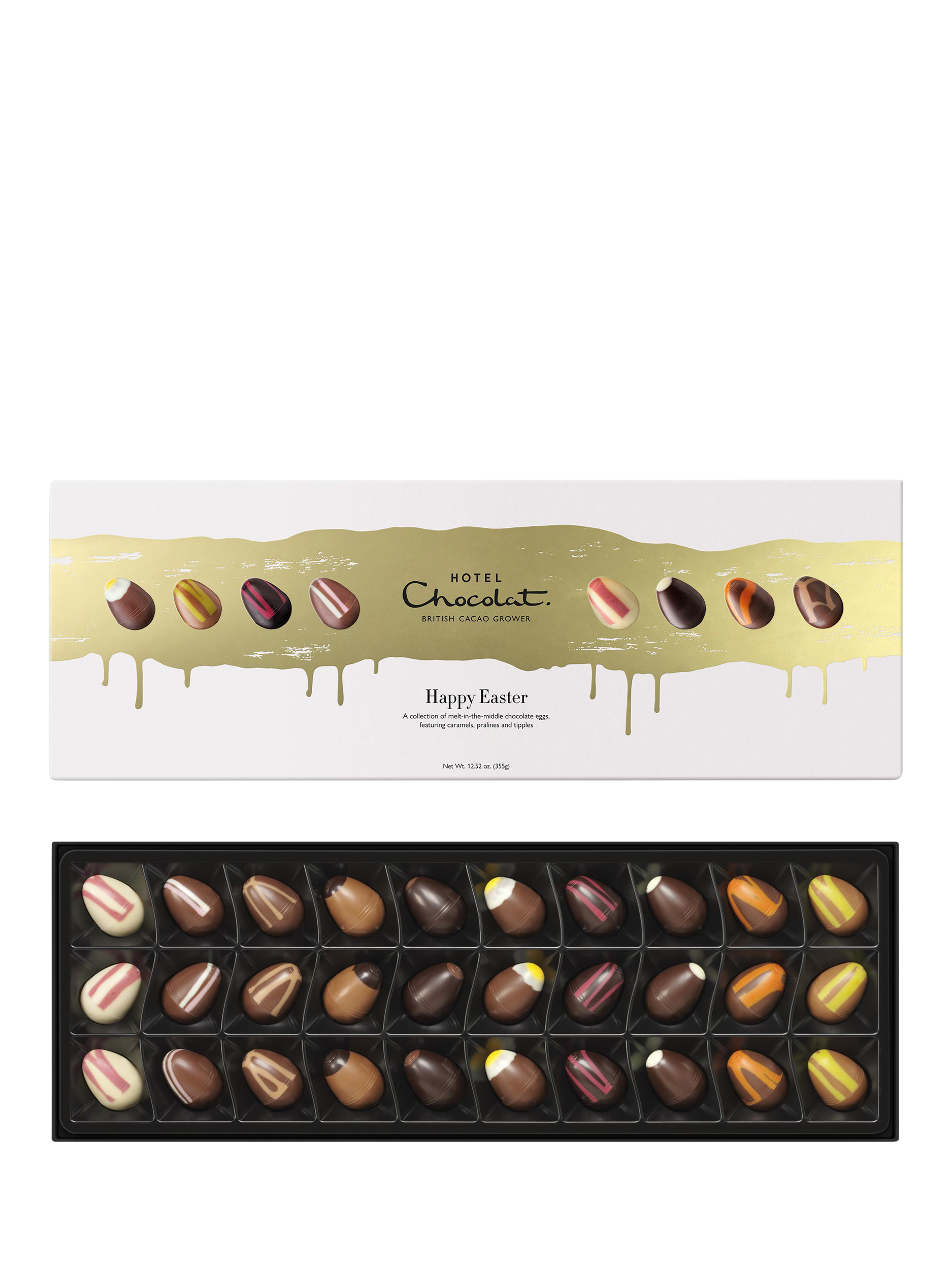An elegant Easter gift box: 30 spring chocolate tiddly eggs brimming with caramels, pralines and tipples.