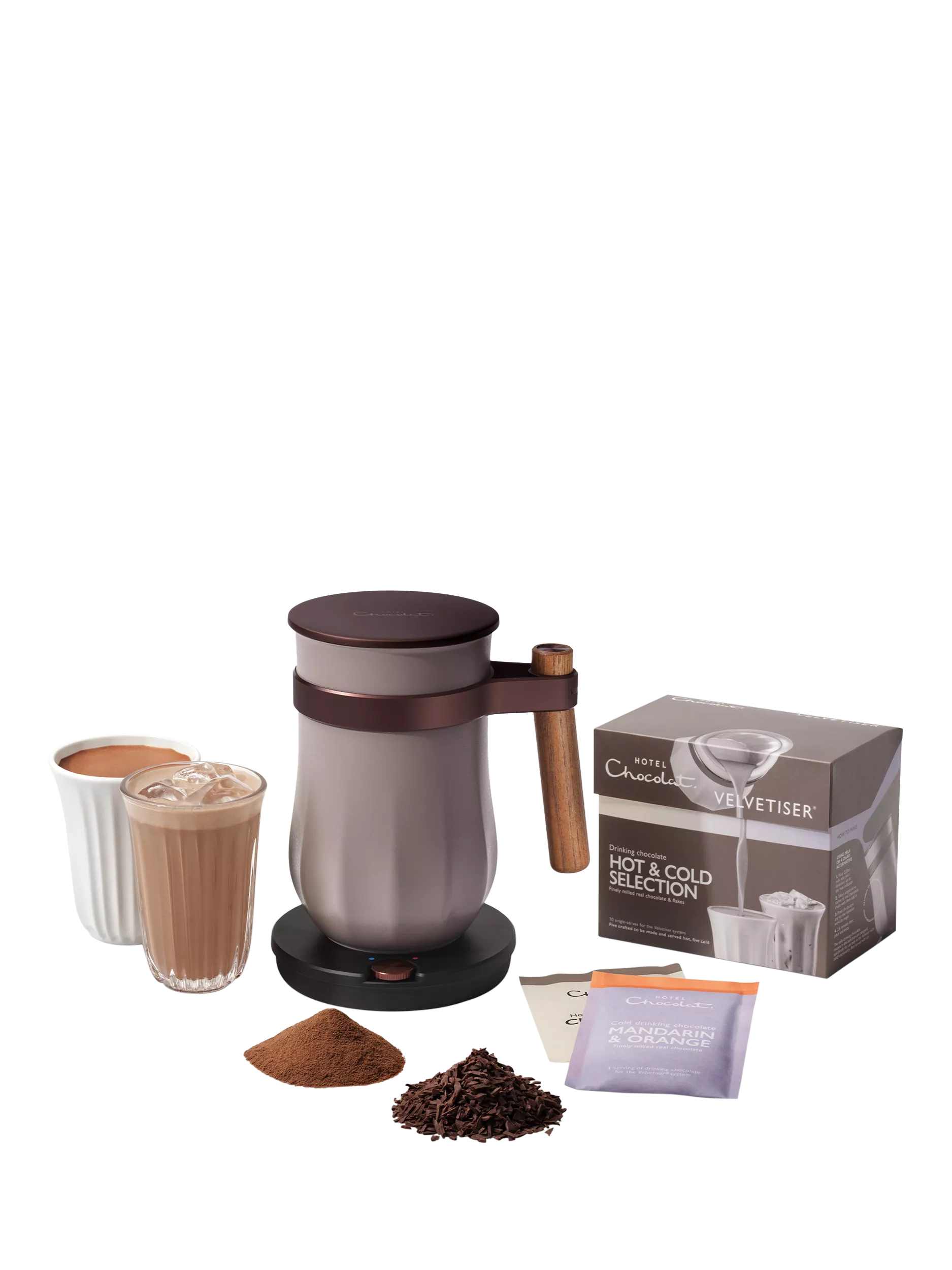 Introducing the ALL-NEW Velvetiser®. The only drinking chocolate machine of its kind, it creates hot and cold barista-grade drinking chocolate at the touch of a button. Experience velvet-smooth results, unrivalled chocolate crema and satisfying cacao depth in every sip.