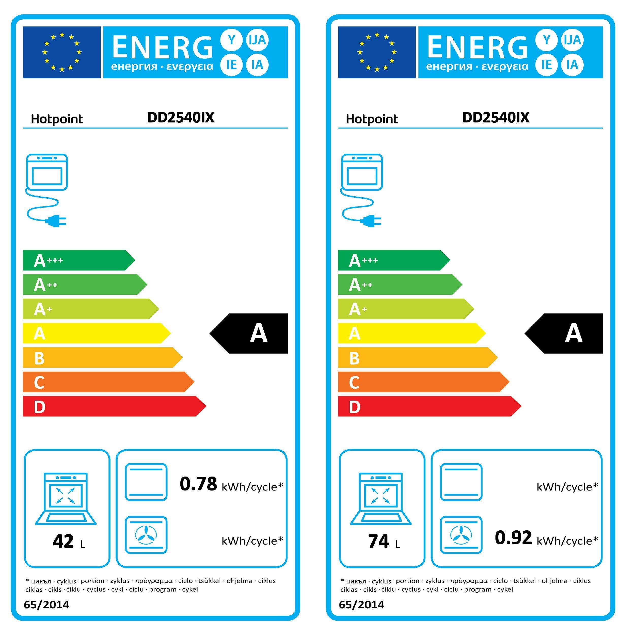 The Hotpoint DD2540 built-in double electric oven offers two decent sized cavities within a standard 60cm width. The main oven has fan heating while the smaller, top oven offers conventional, convection heating and a grill. It has an A rating for energy efficiency.