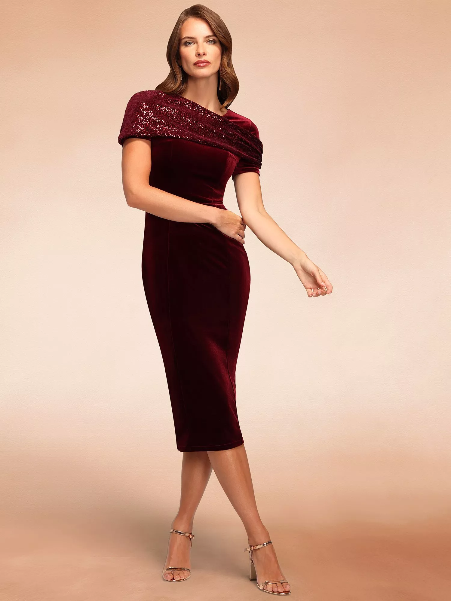Make a statement in this luxurious midi-length velvet dress, designed for standout elegance with a touch of sparkle. The bodycon silhouette hugs the figure in all the right places, while a subtle back split allows for graceful movement. The real showstopper? A beautifully draped asymmetric cape, crafted in shimmering sequin velvet, drapes elegantly over the shoulders and back for a touch of sparkle. With short sleeves, a smooth side zip fastening, and rich UK-made craftsmanship, this dress is perfect for winter weddings, black-tie events or any special occasion where you want to shine.