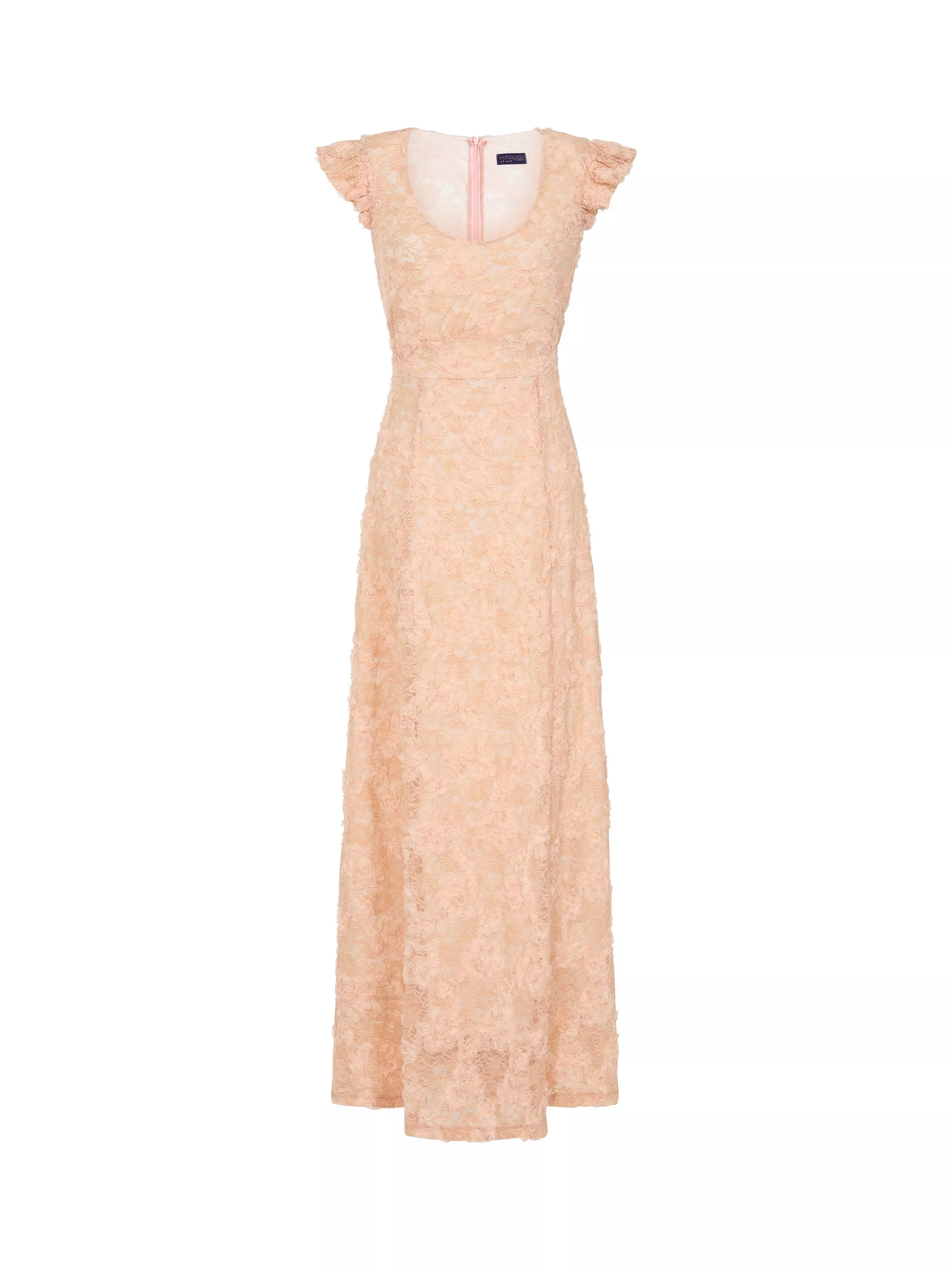 Introducing the HotSquash Eleanor Dress, a stunning style that exudes elegance and charm. The soft lace material is enhanced by the addition of 3D lace floral appliques, adding a delicate but fun texture to the dress. An empire-line waist elongates the body, while the scoop neck and flutter sleeves give a soft touch of femininity to the dress.
