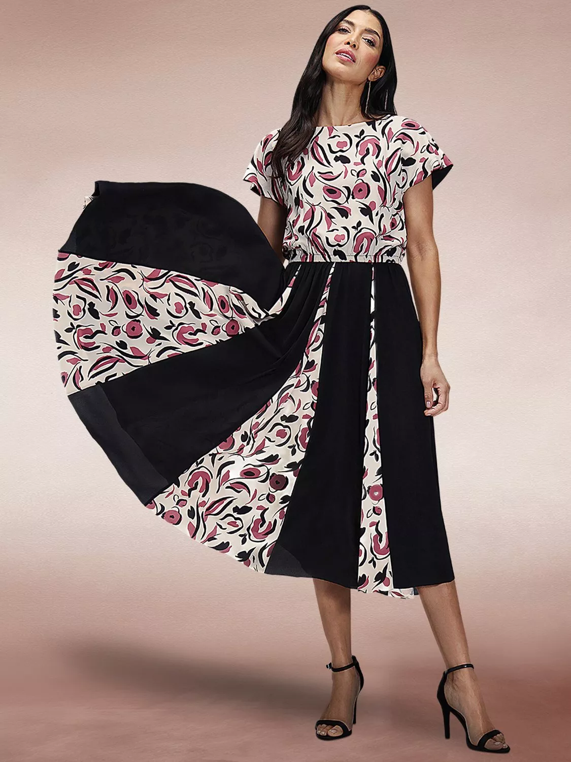 Adding fun flair with every step, this floral midi dress from HotSquash is made from a soft fabric with a panelled box pleated skirt. Simply structured with a round neckline and short sleeves, it's a stunning afternoon to evening style.