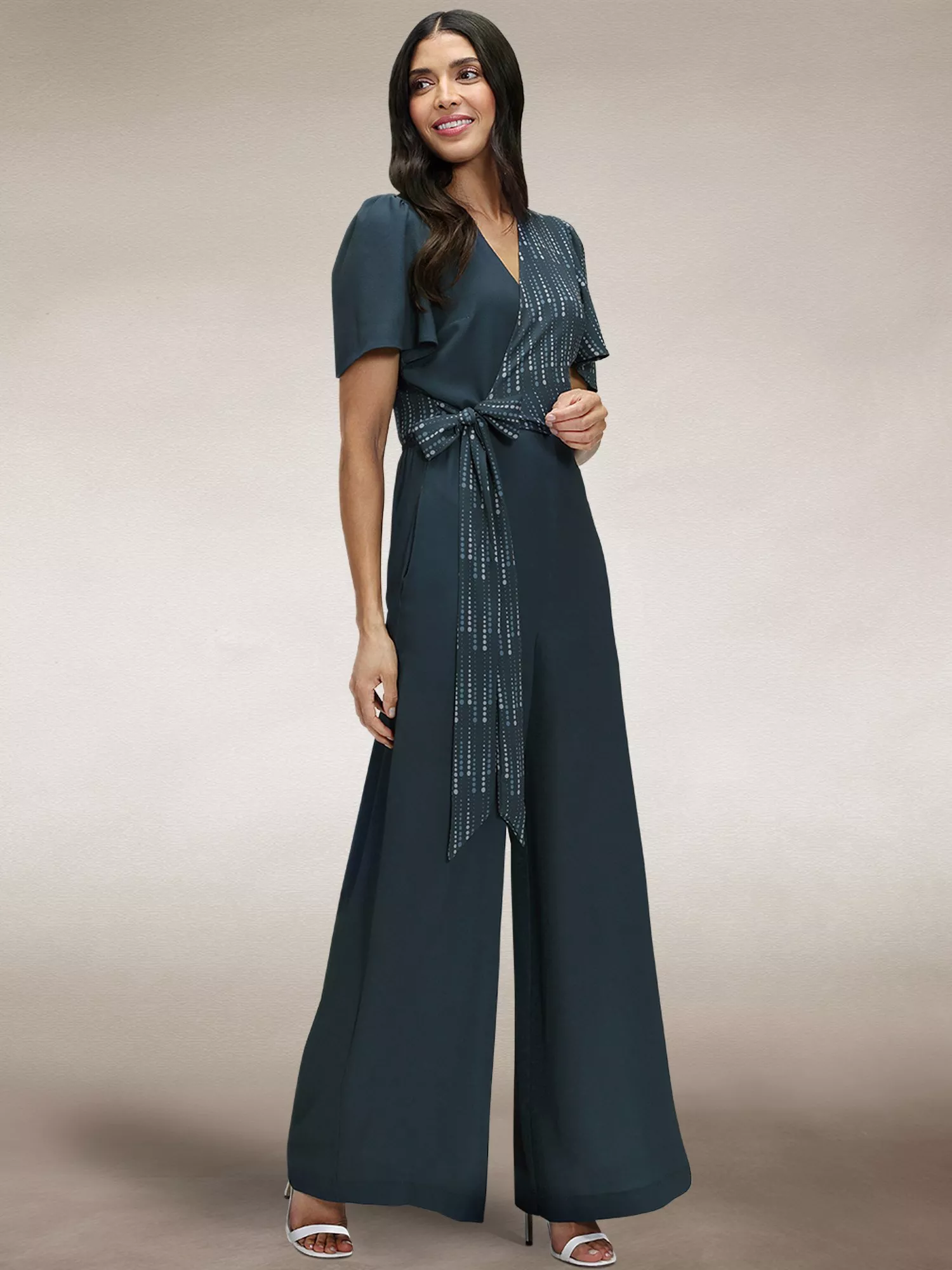 Defined by a flattering wrap-over neckline and short sleeves, this tie waist jumpsuit by HotSquash is made in soft chiffon for a standout look. Cut to a wide-leg silhouette, this one-piece is a brilliant alternative to dresses for that special occasion.