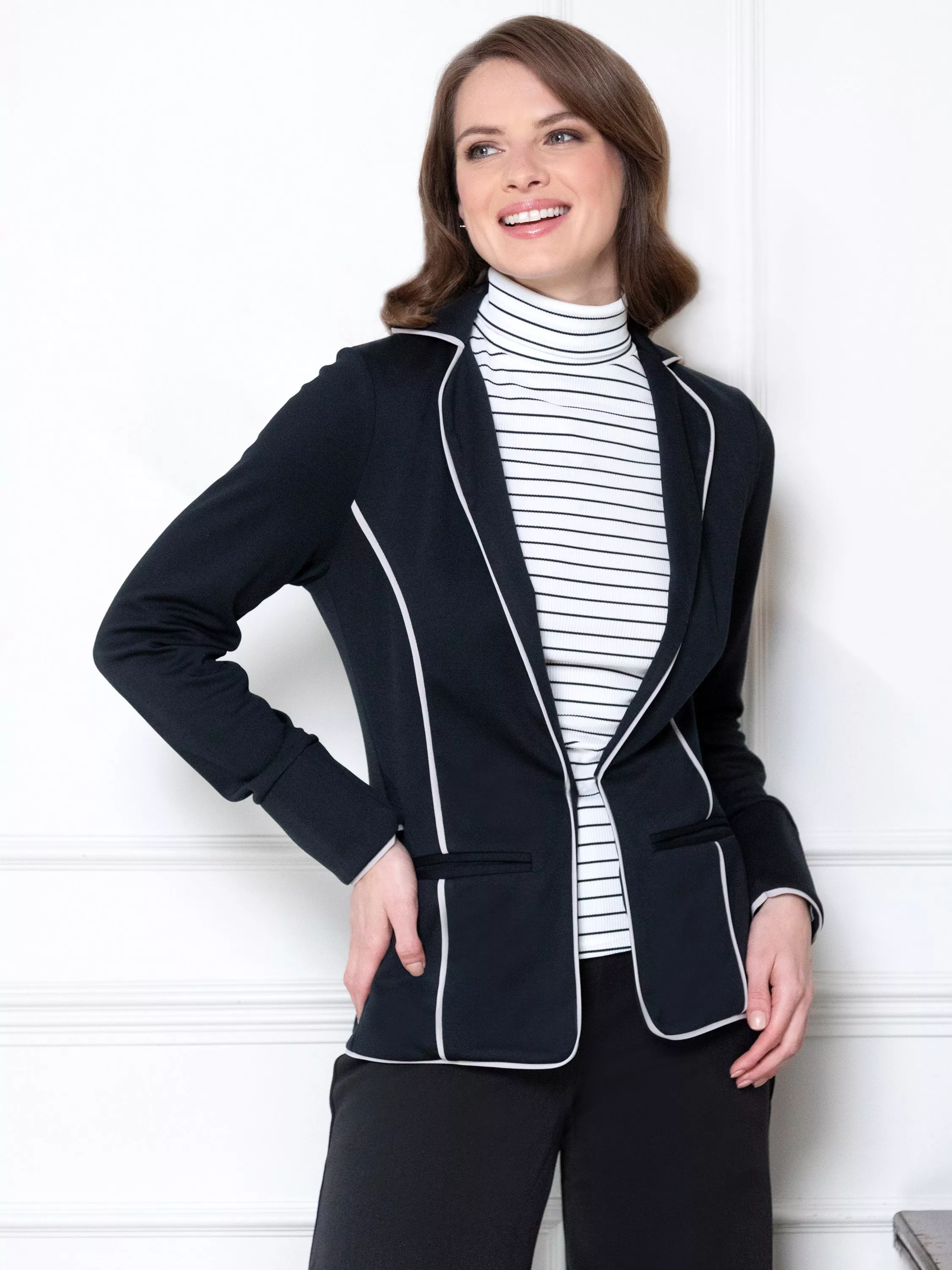 Whether it's the office or a day out with the girls, this HotSquash blazer will add a touch of class to any outfit. The contrasting piping detail adds soft structure to the jacket, showing off a feminine silhouette. Accentuate the waist even further with the hidden hook and eye clasp.