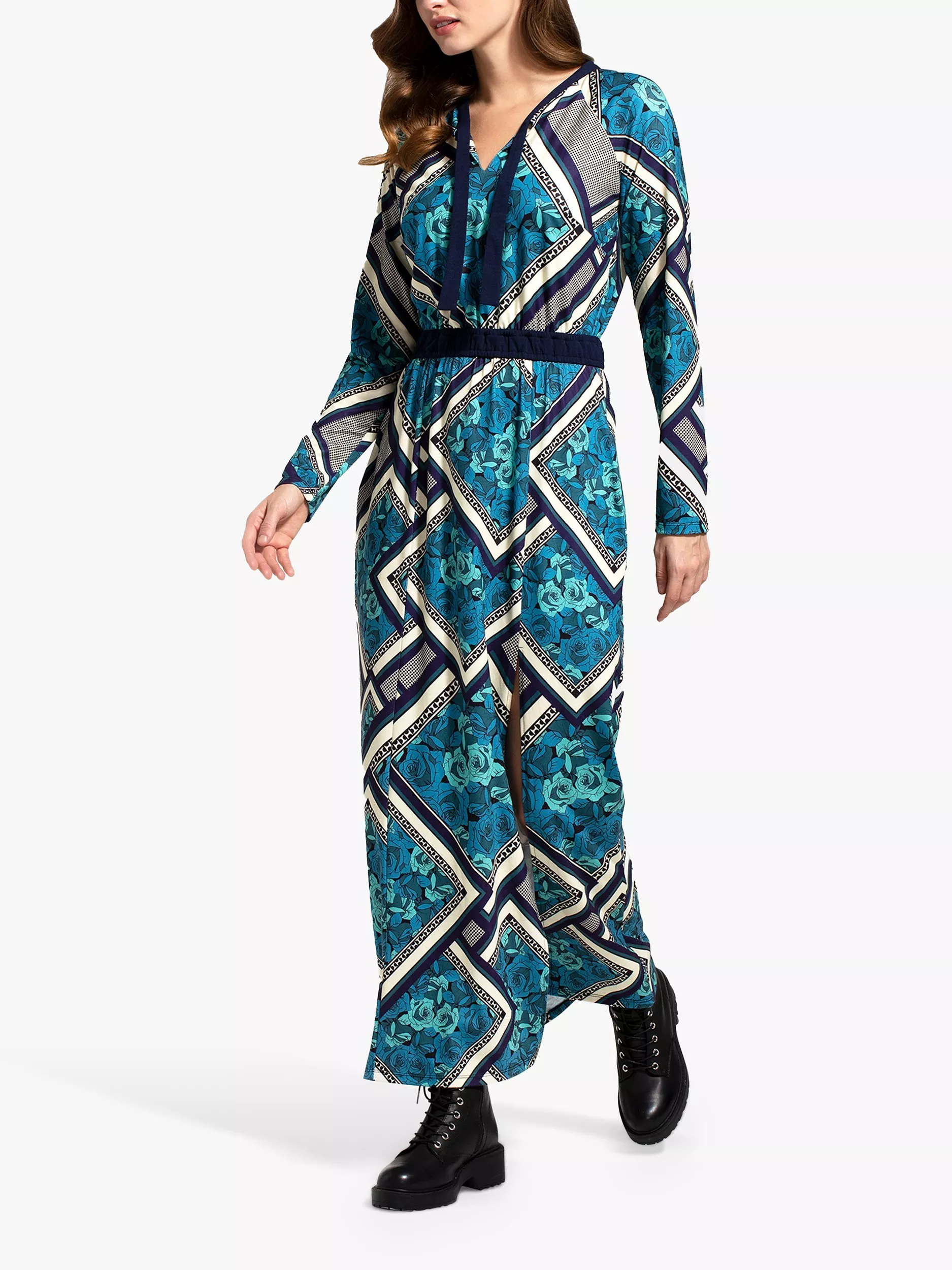 HotSquashRetro Tile Print Long Sleeve Maxi Dress, Teal/Multi