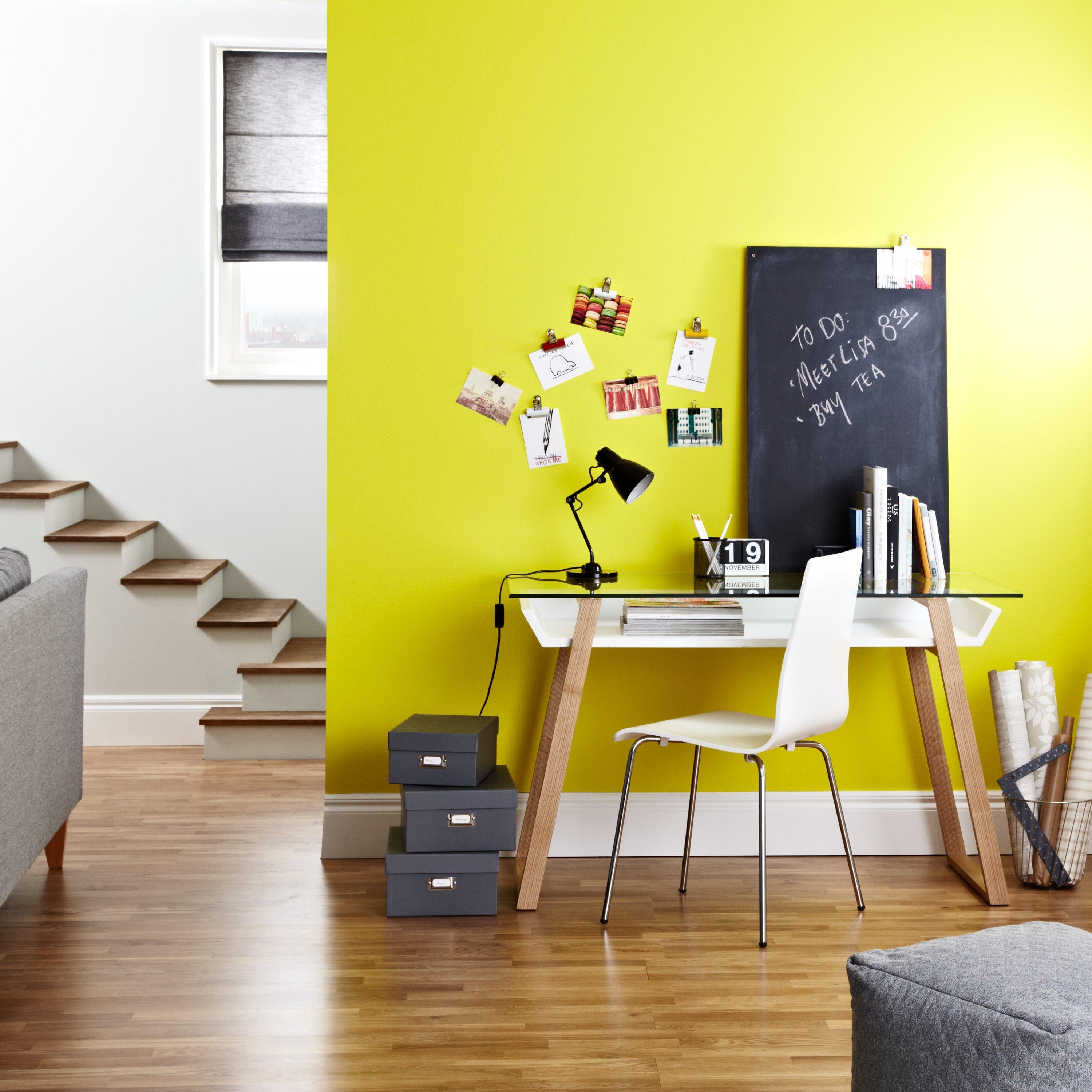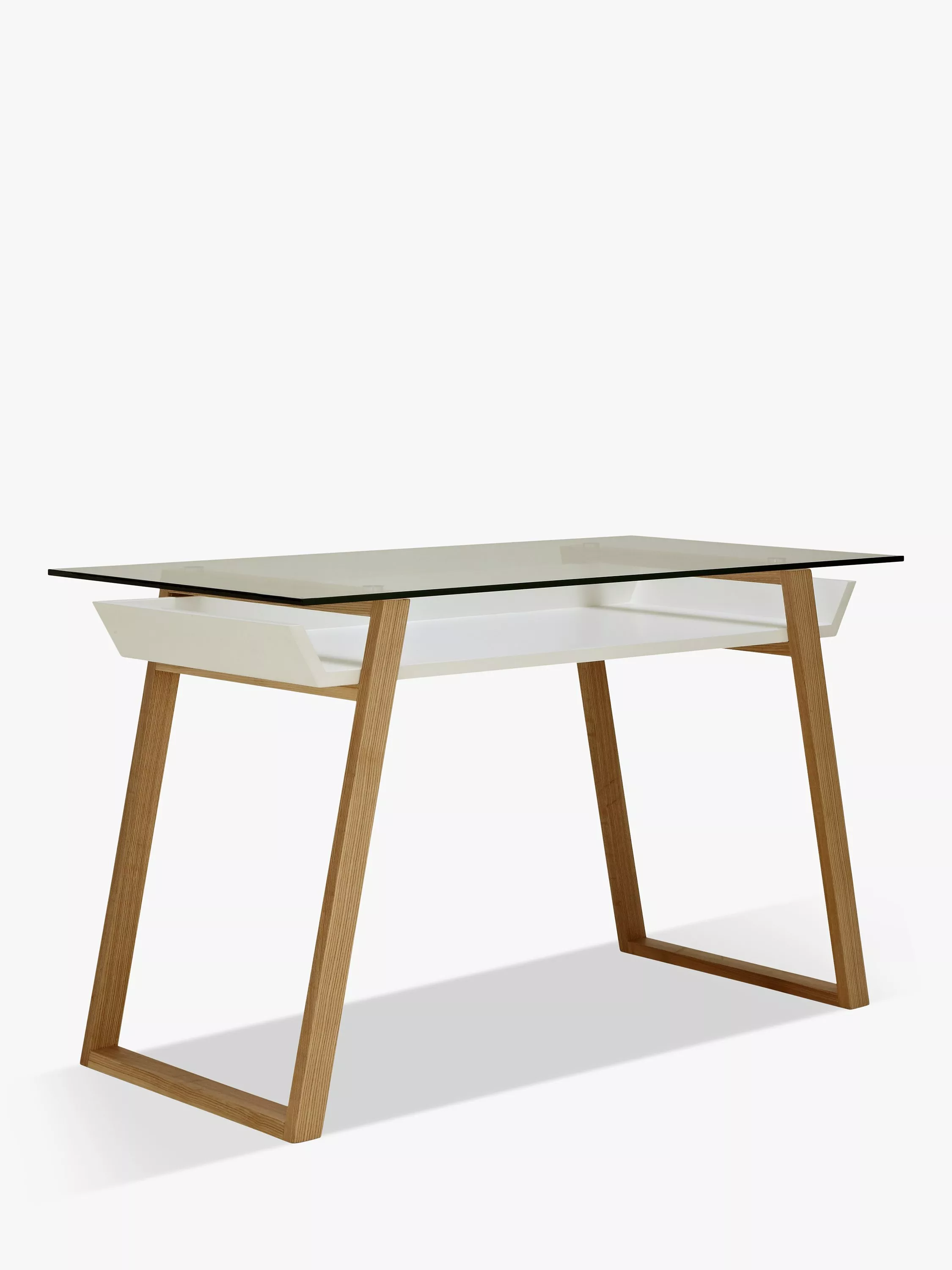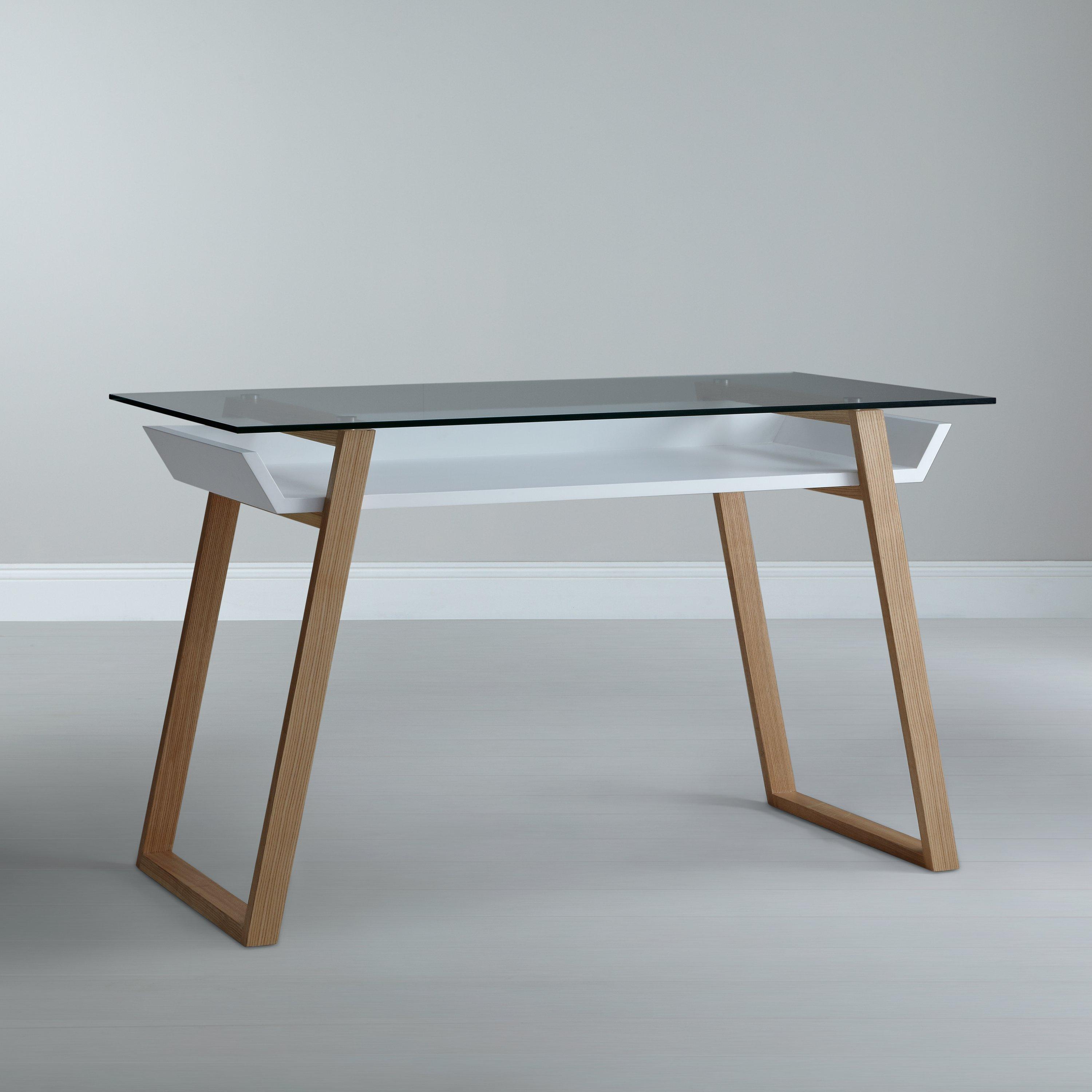 A simple, yet stylish, wooden desk, with angled legs and a glass top. It's perfect for creating that clean, minimalist look.