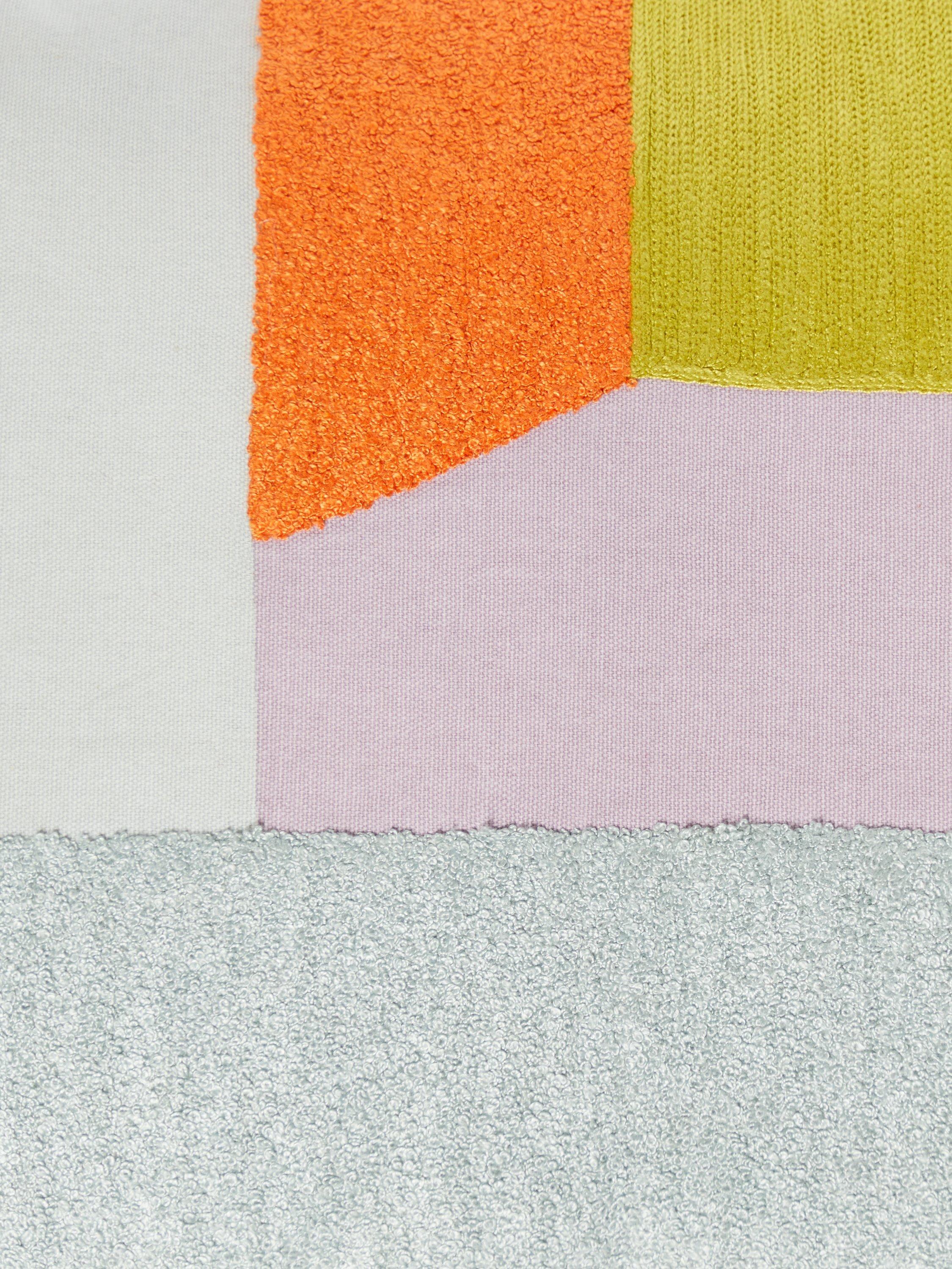 An assortment of textured blocks make up a colourful, contemporary cushion. Includes hand embroidered crewel work, looped and woven textures.