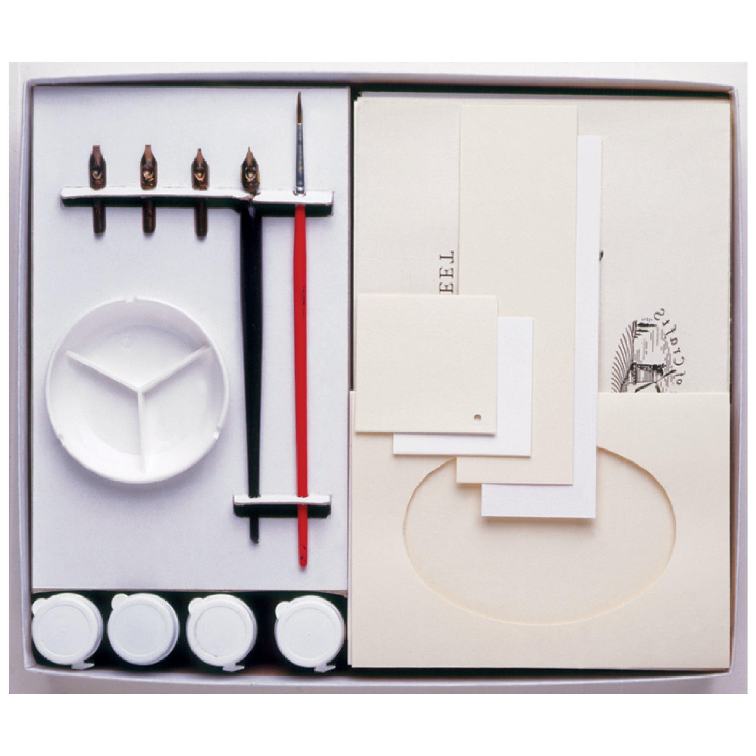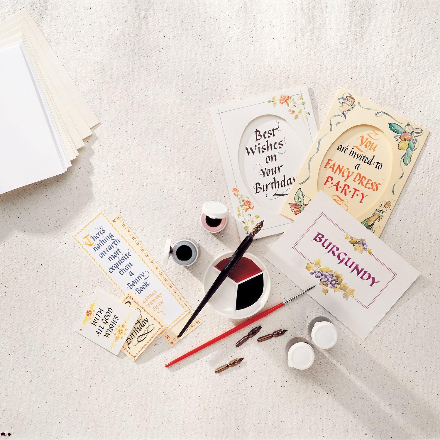 Complete a range of fun projects including cards, bookmarks and more. The kit includes easy to follow step-by-step instructions, nib holder, nibs (sizes 1, 2, 3.5 and 5), reservoir, calligraphy inks in blue, black, red and yellow, artists brush, mixing palette, calligraphy pad, greeting cards, envelopes, gift tags and bookmarks.