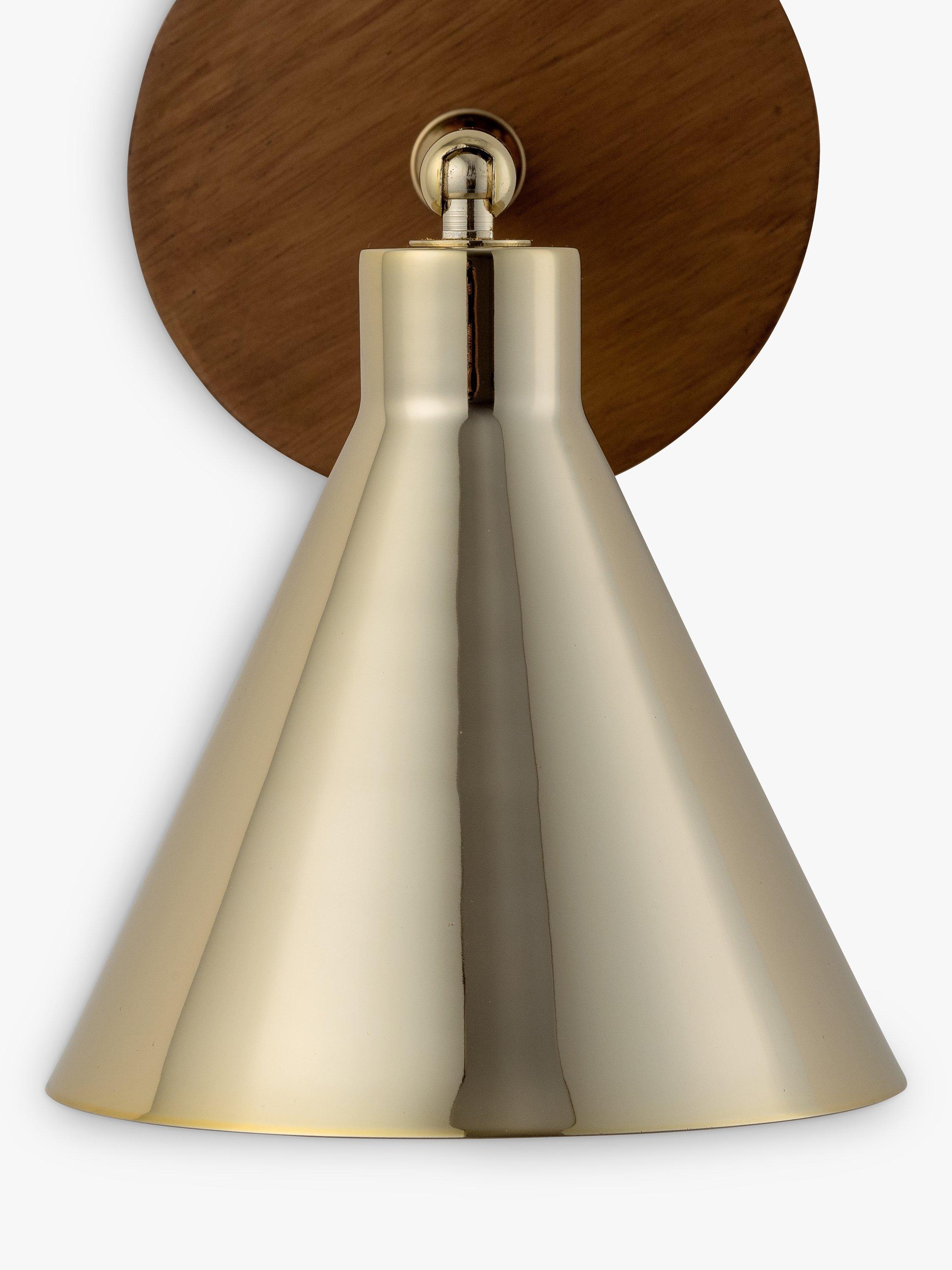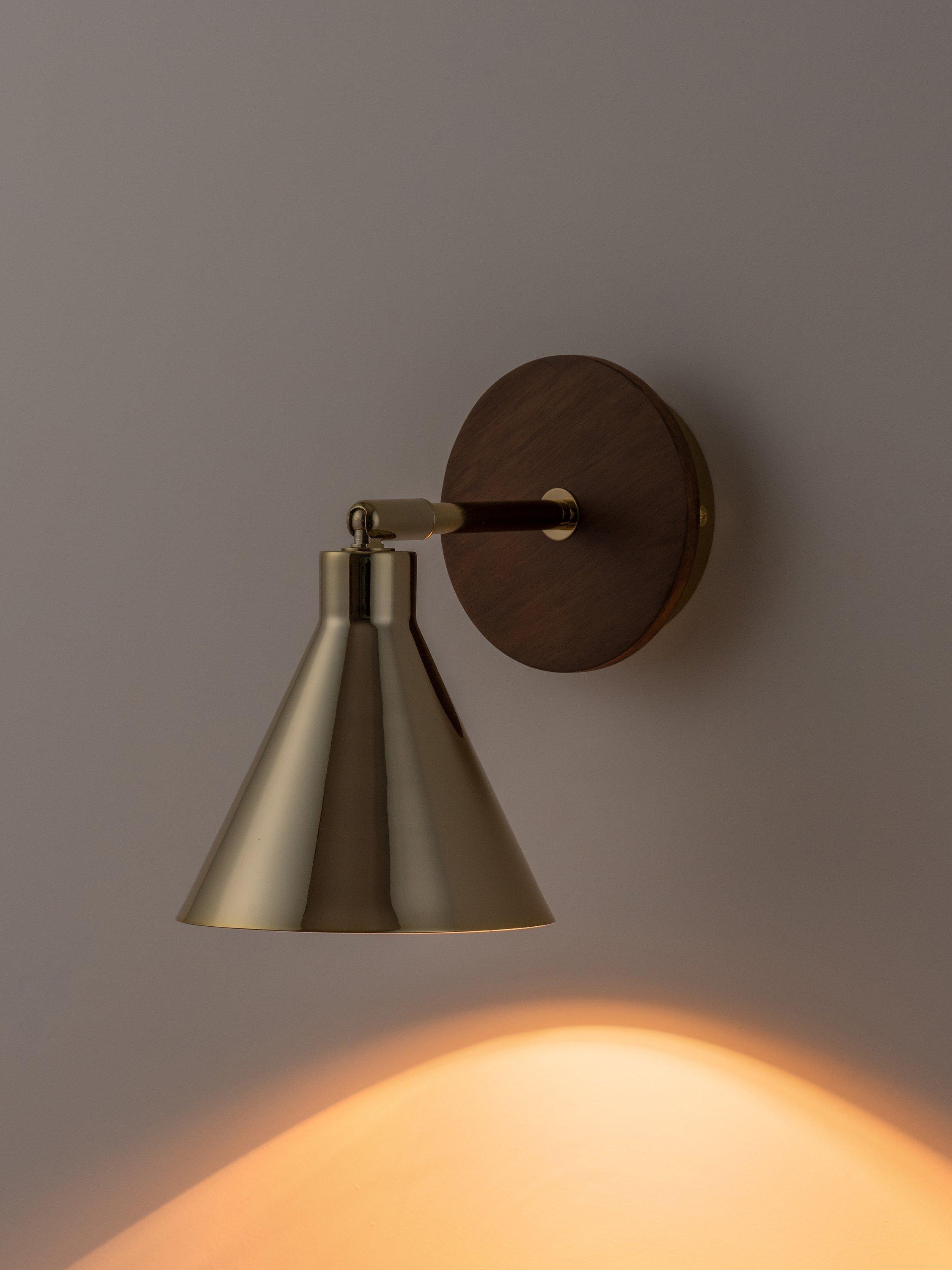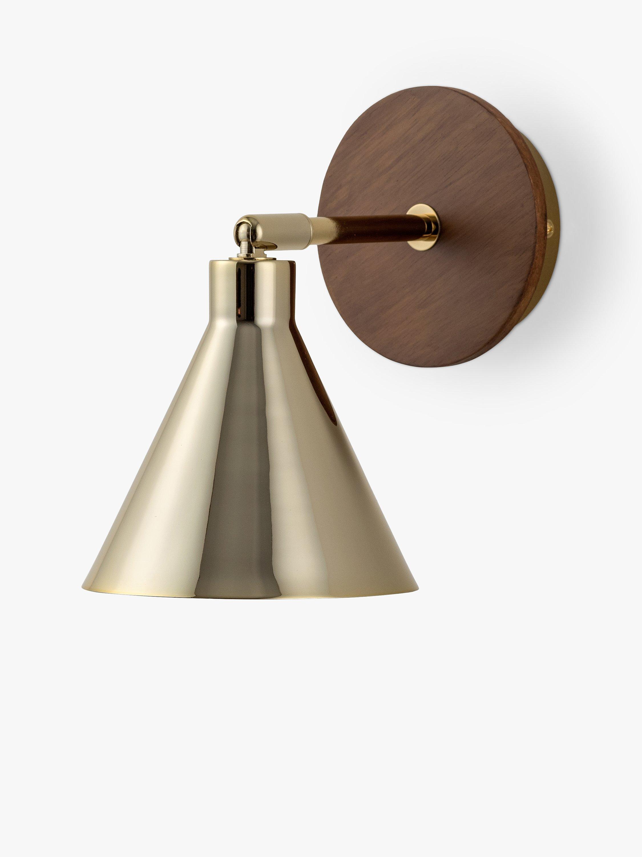 Designed with versatility and function in mind, this houseof wall light has an adjustable conical shade making it ideal for bedside reading, desk work and kitchen worktops. Influenced by Mid-century decor and finishes, the rich wood veneer used on the wall bracket adds warmth and creates a striking contrast to the polished brass shade.