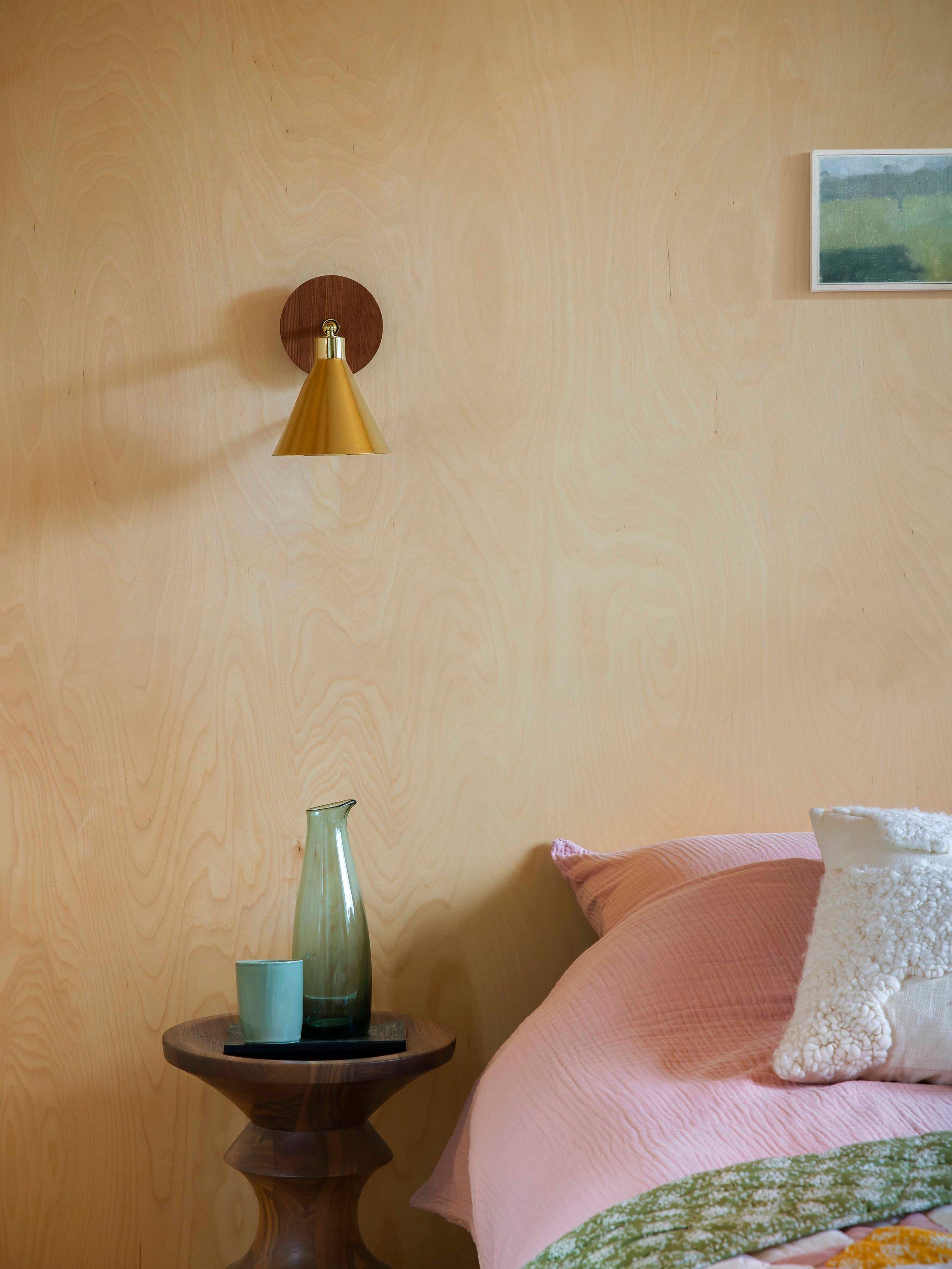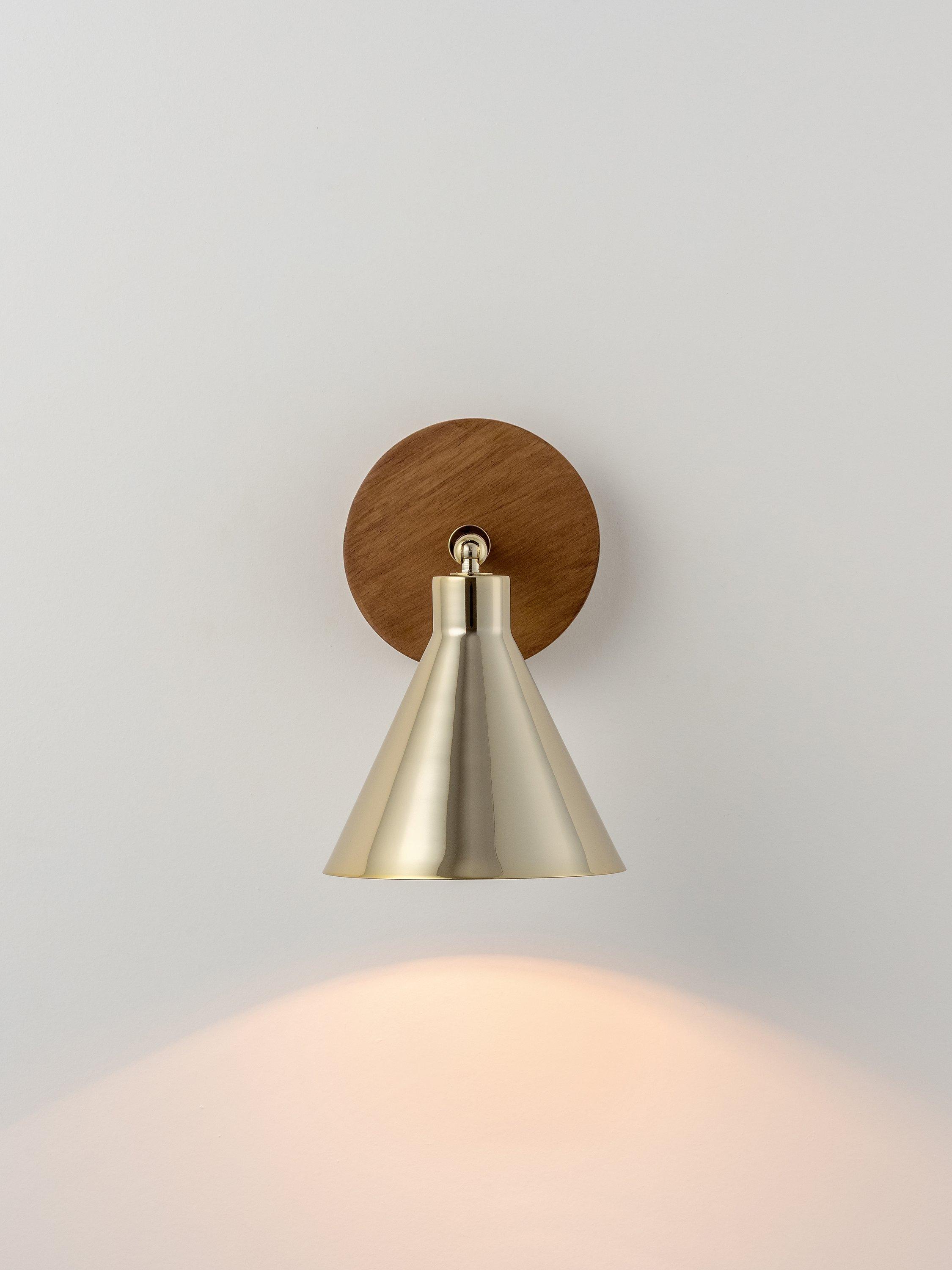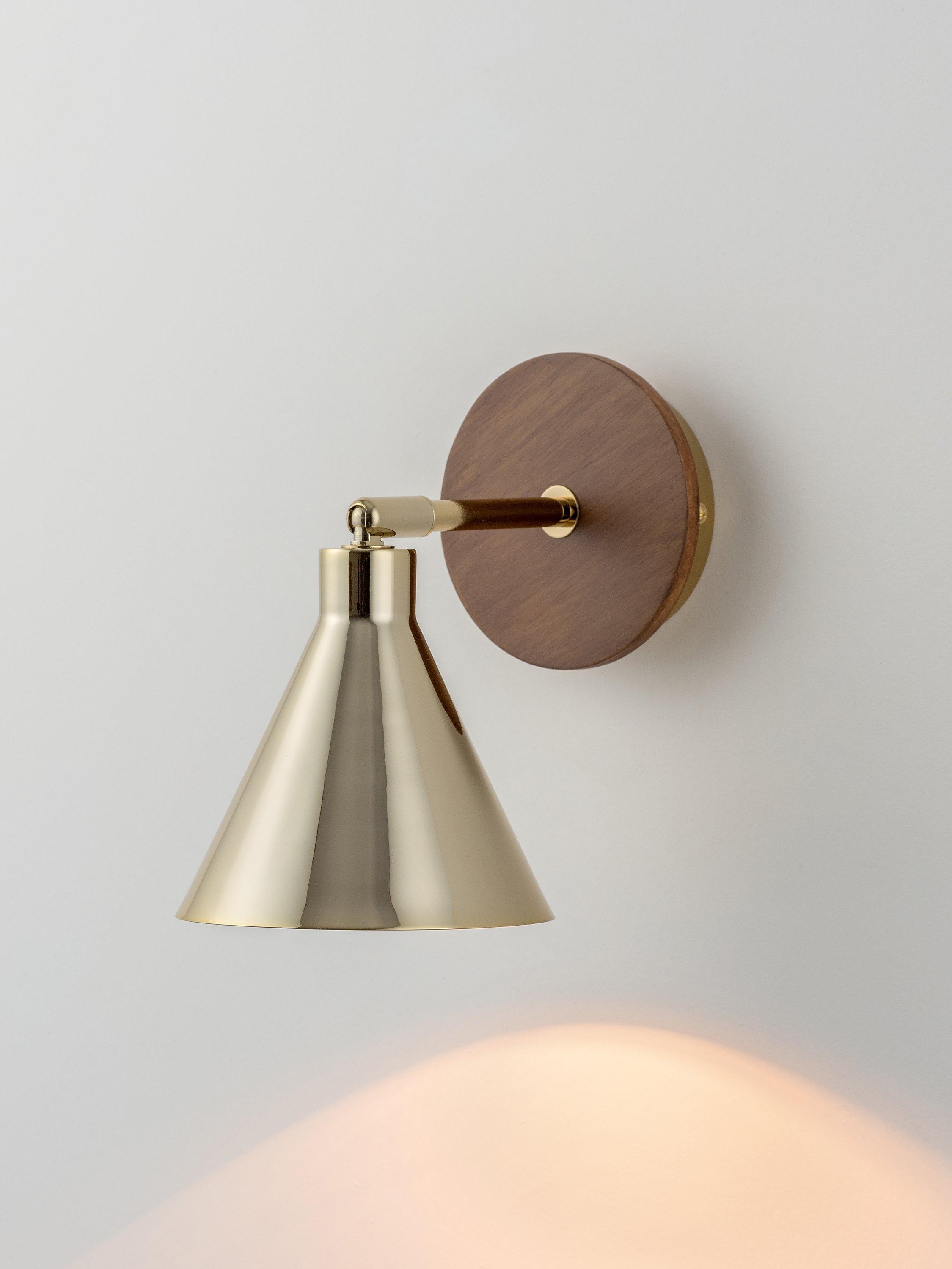 Designed with versatility and function in mind, this houseof wall light has an adjustable conical shade making it ideal for bedside reading, desk work and kitchen worktops. Influenced by Mid-century decor and finishes, the rich wood veneer used on the wall bracket adds warmth and creates a striking contrast to the polished brass shade.