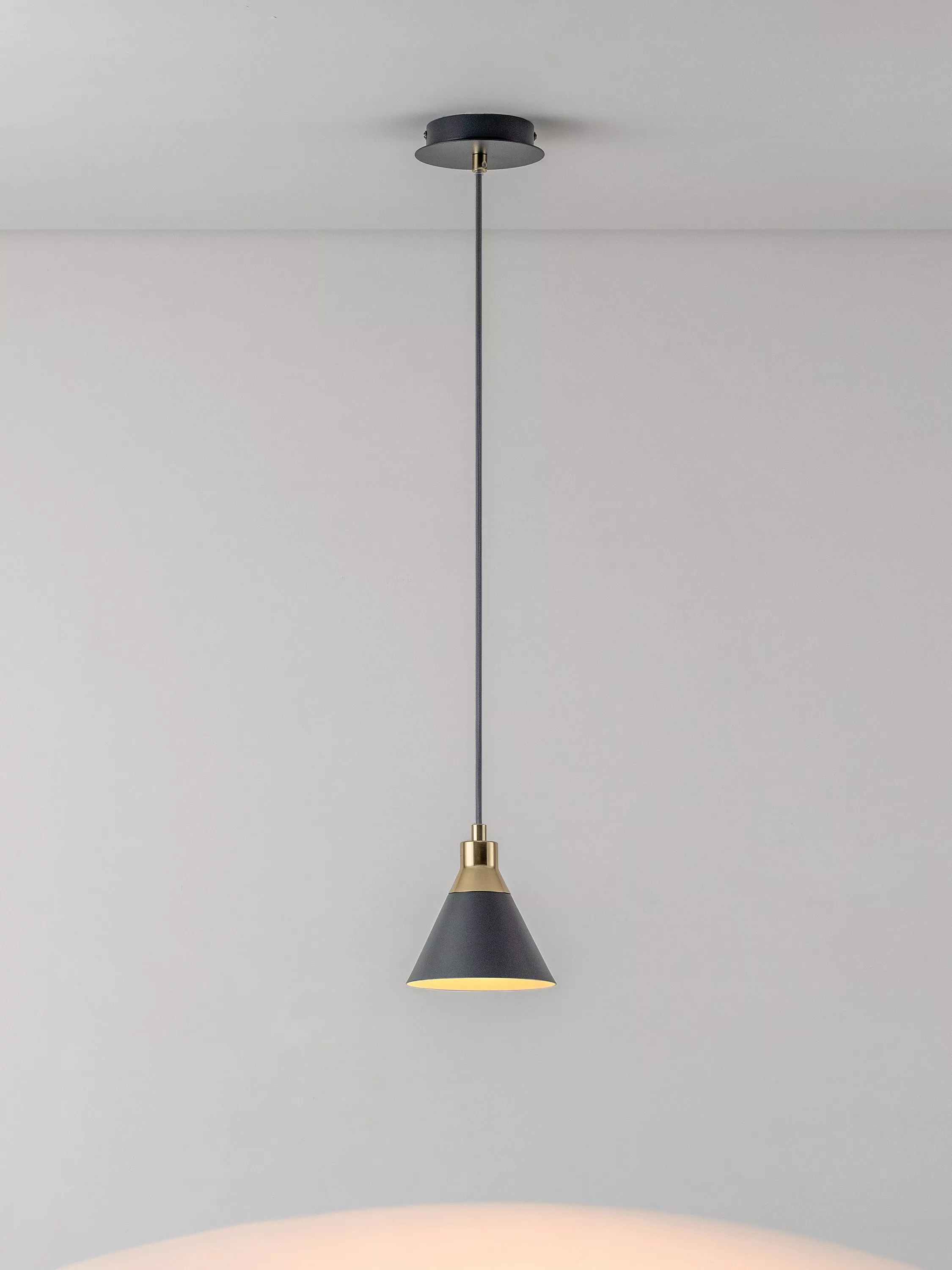 Influenced by Mid-century decor and finishes, the cone shade has a solid brass cap and is available in two finishes: charcoal or sand.