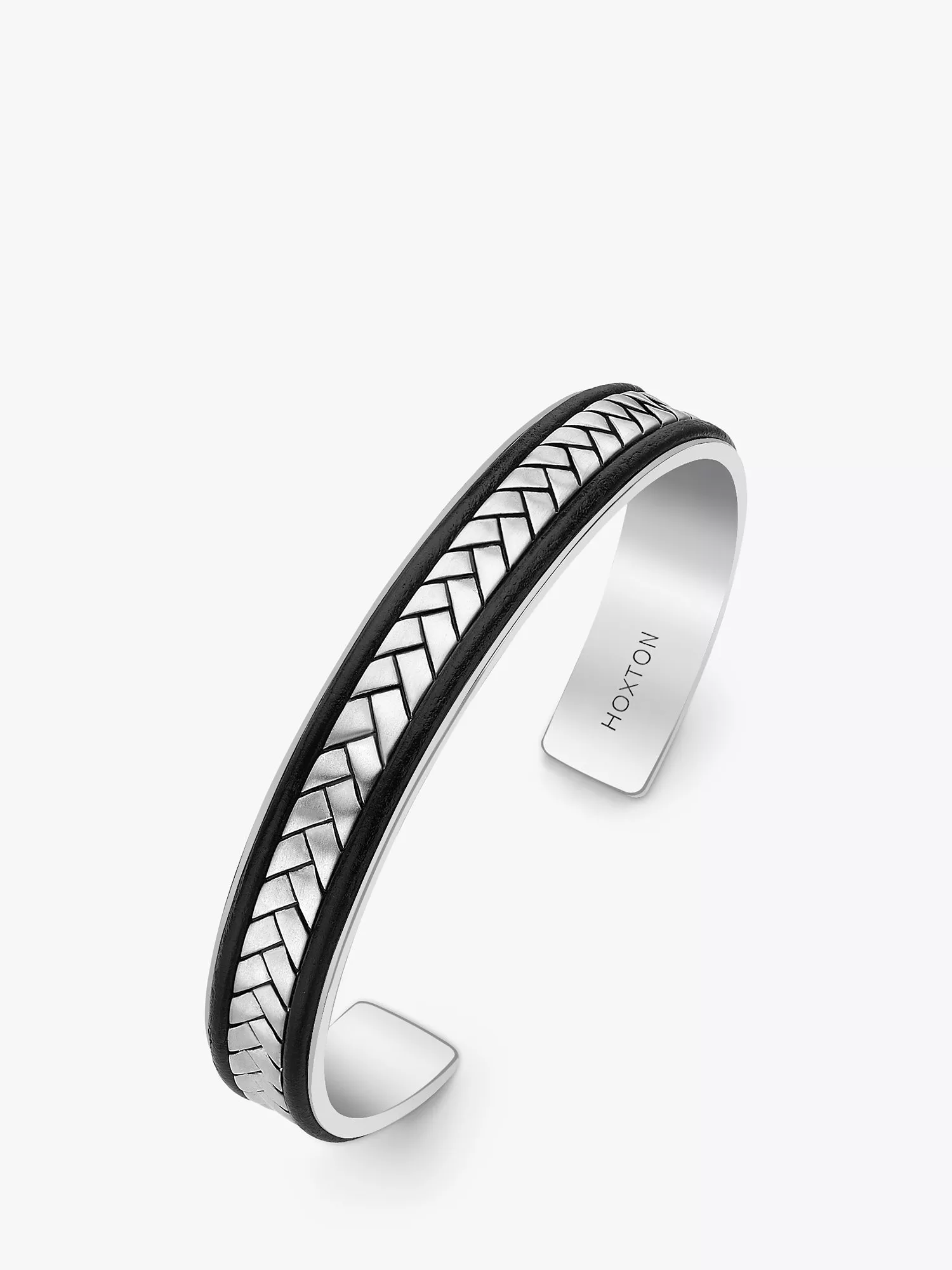 Hoxton LondonMen's Herringbone Leather Inlay Cuff Bangle, Silver/Black