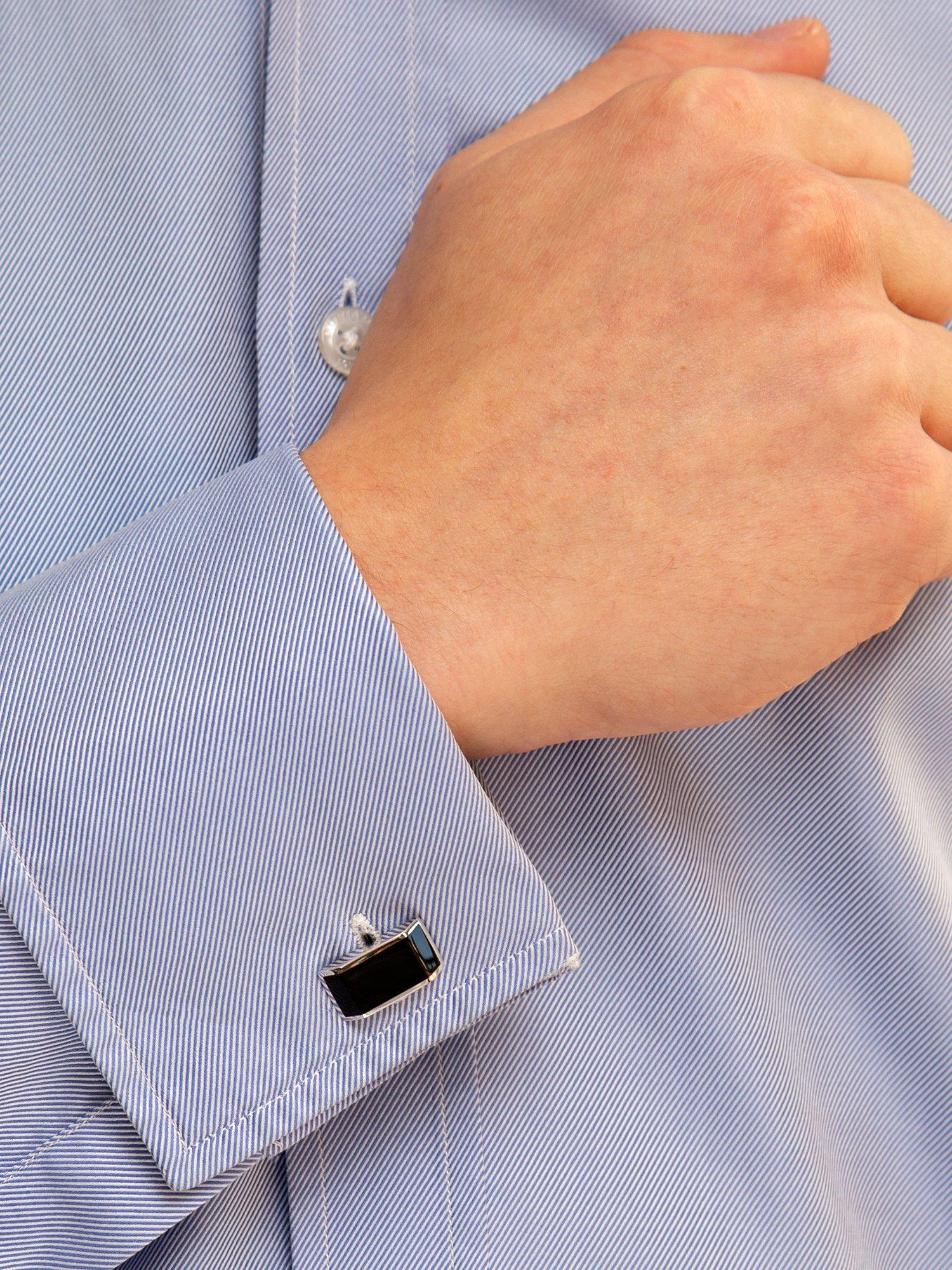 Sterling silver cufflinks from Hoxton London, inset with bevelled black onyx rectangles.