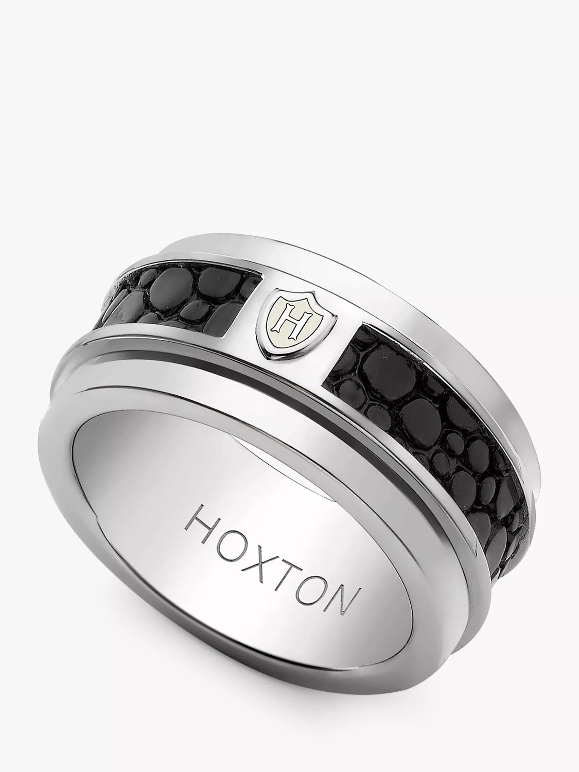 With an inlay of pebbled leather surrounded by sleek polished sterling silver, this spinning ring from Hoxton London is a style that is both rugged and sleek. A great way to accentuate your casual styles. Pair with the matching necklace, cuff bracelets or cufflinks to complete the look.