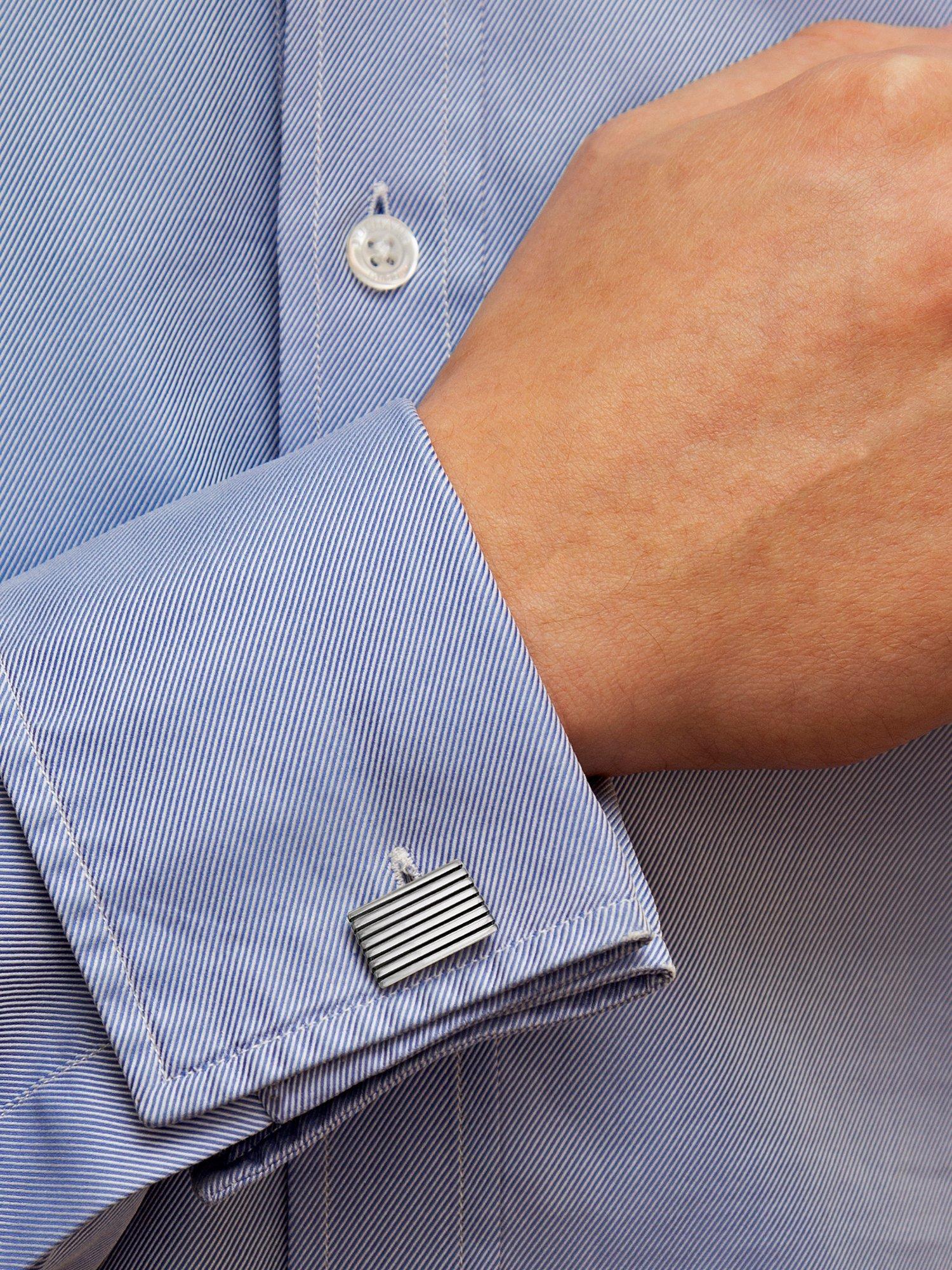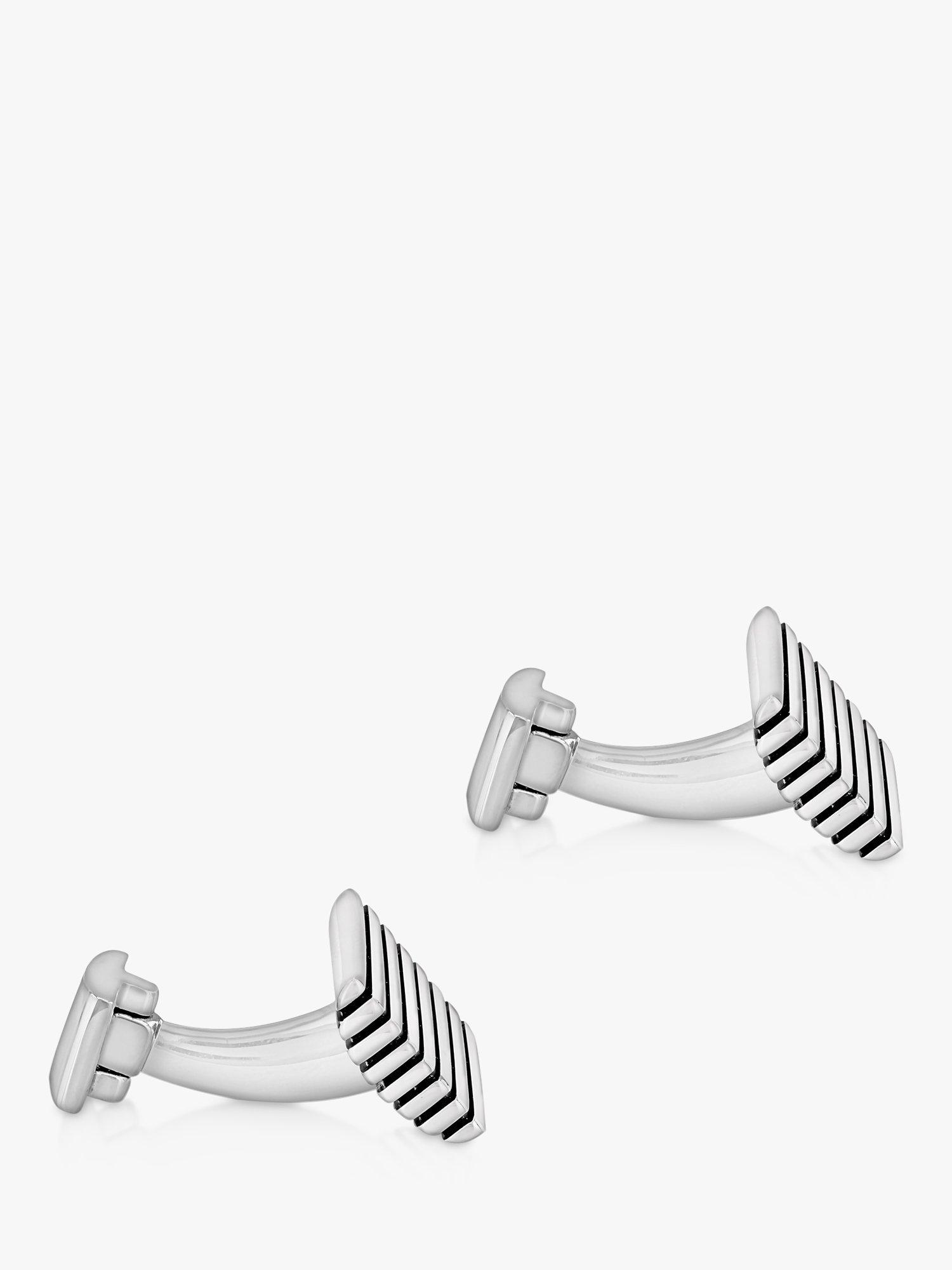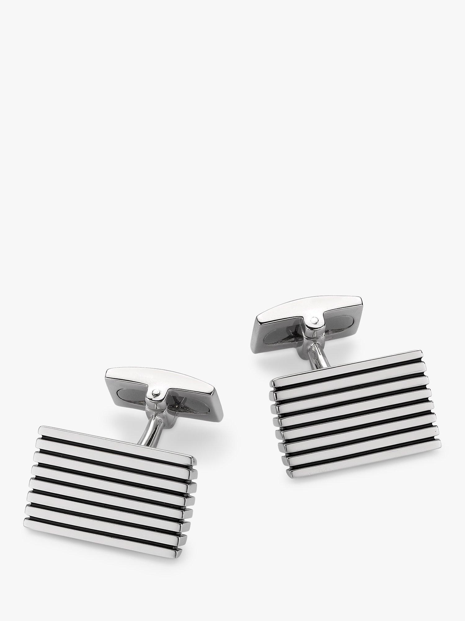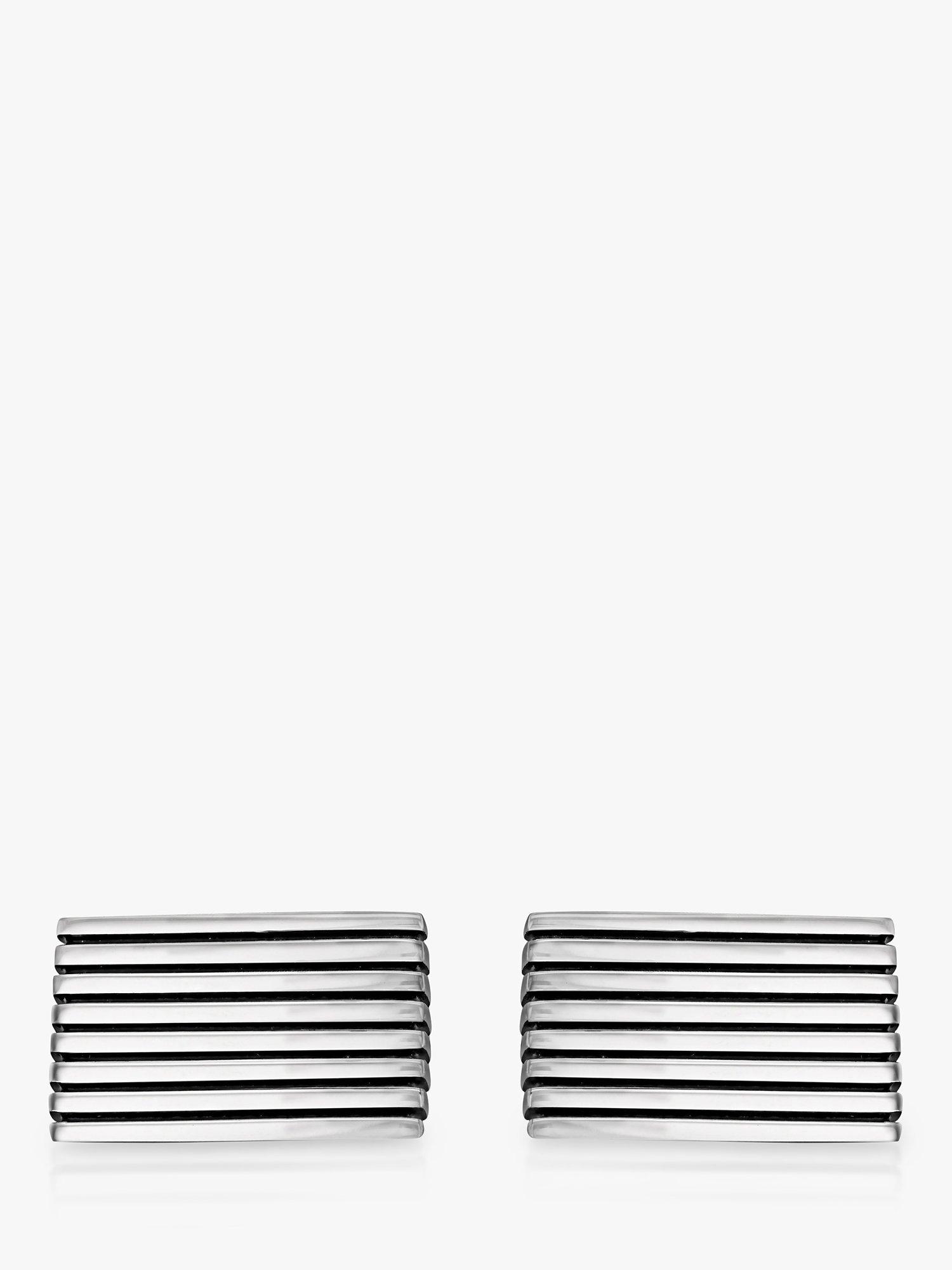 Made from sterling silver, these cufflinks have a rectangular shape with engraved stripes.