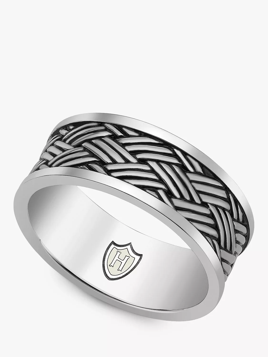In a fashion-forward alternating linked design, this ring from Hoxton London has smooth polished links contrasted with woven patterned links enhanced by oxidization to bring out the details. Made from sterling silver, the ring works well with both casual and more formal looks.